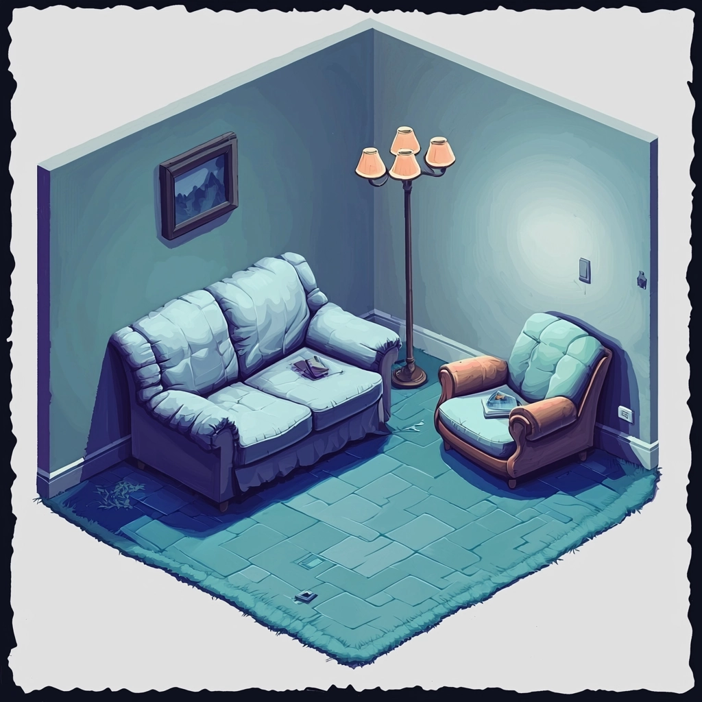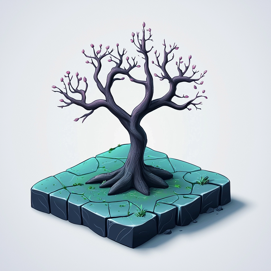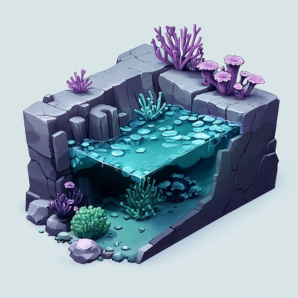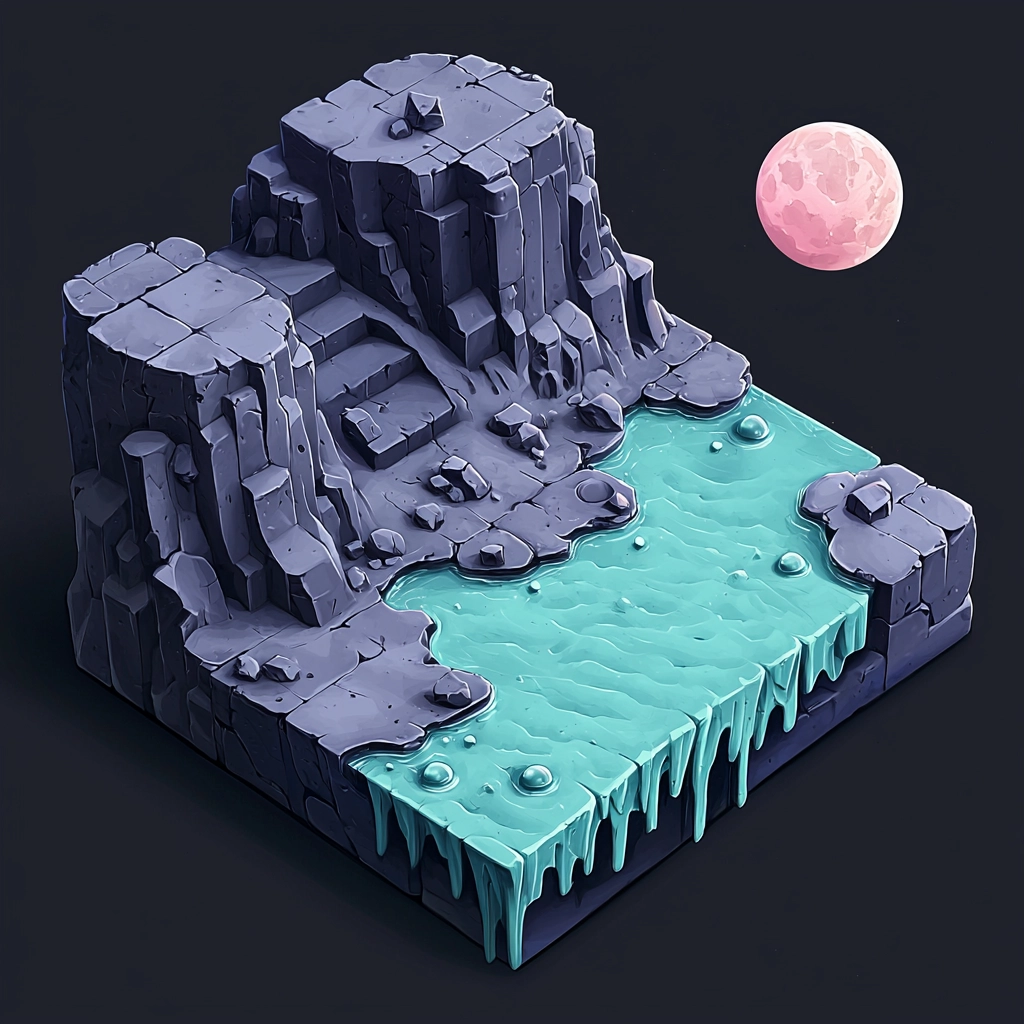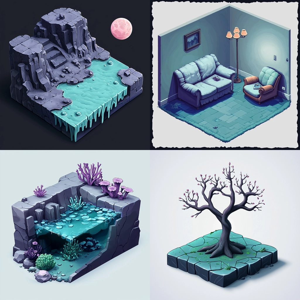 Lighting is used to create depth and emphasize forms. Colors primarily feature cool tones like cyan and gray, with occasional purple accents. The spatial arrangement suggests a sense of isolation, and textures range from smooth surfaces to rough, rocky terrains.