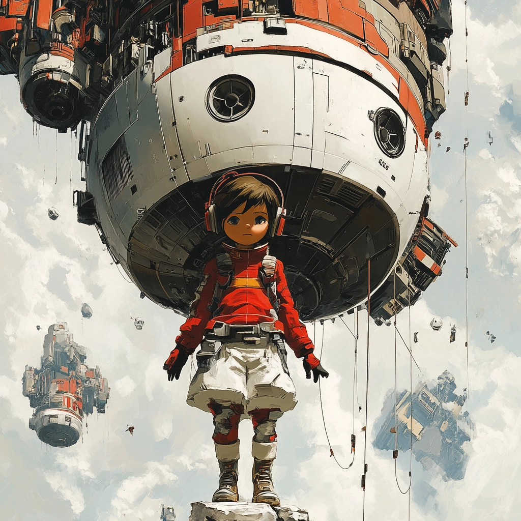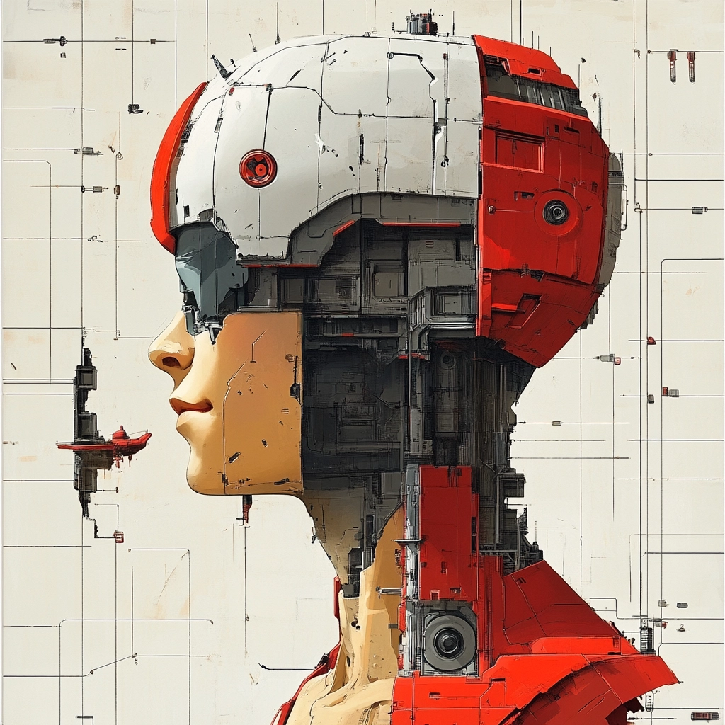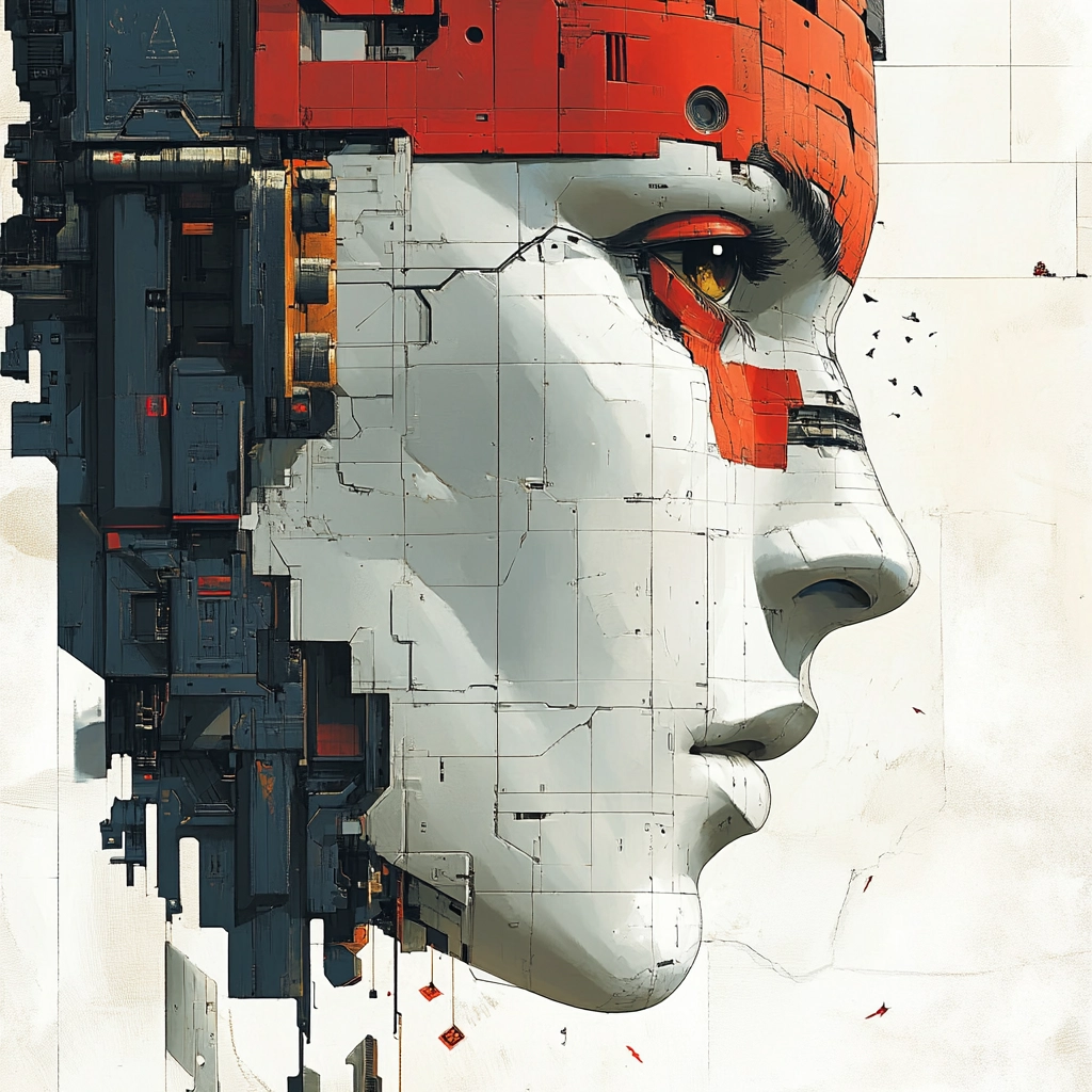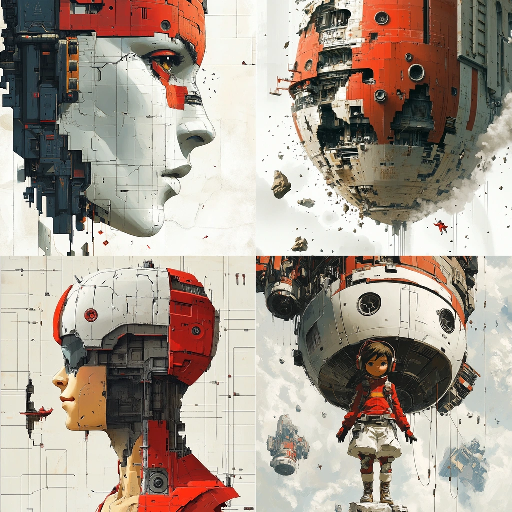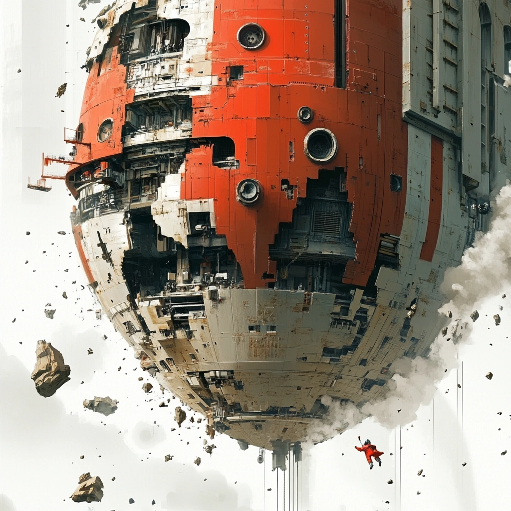 Strong use of color contrast with red against gray and white. Light plays a critical role, enhancing depth and texture. The rugged mechanical textures give a palpable sense of space.