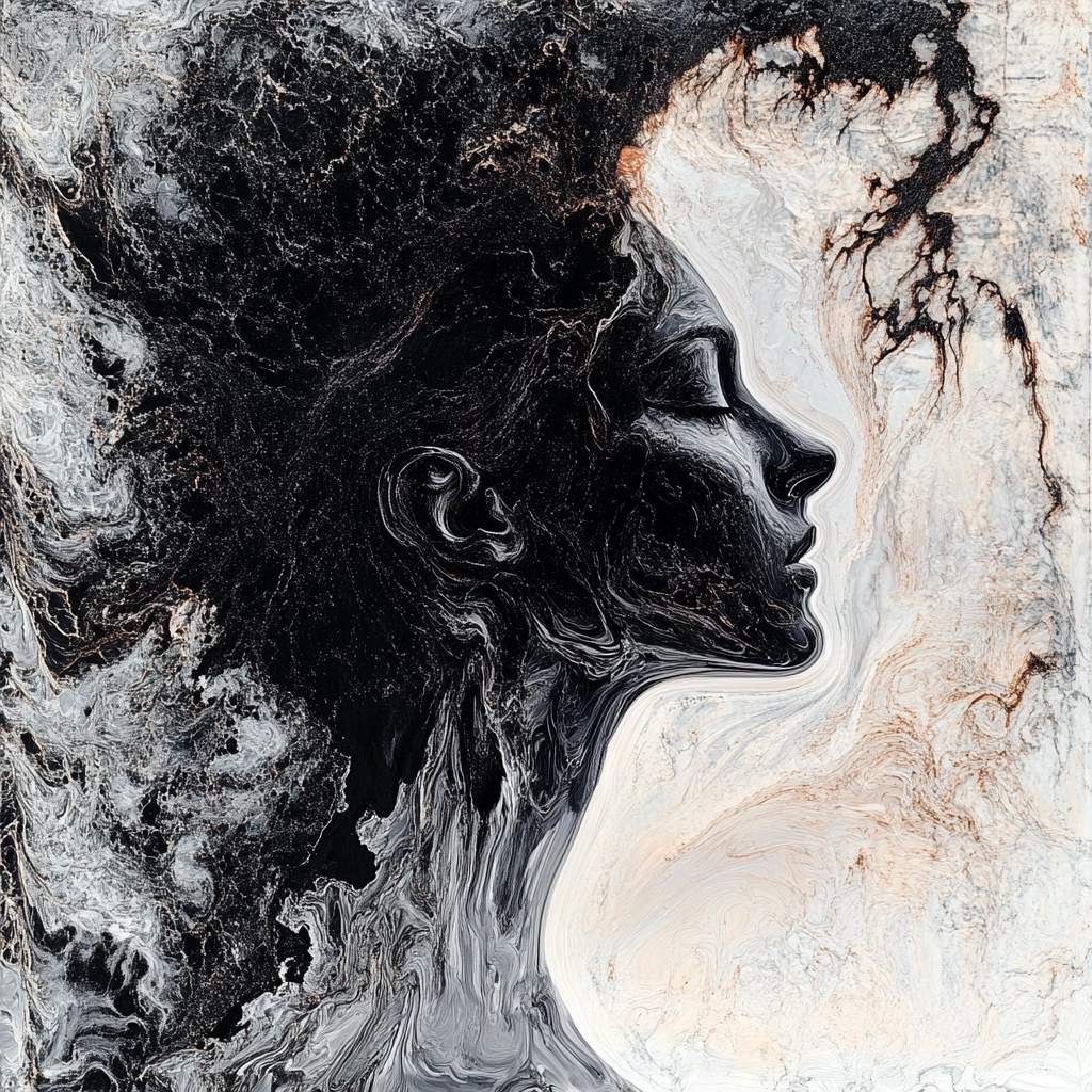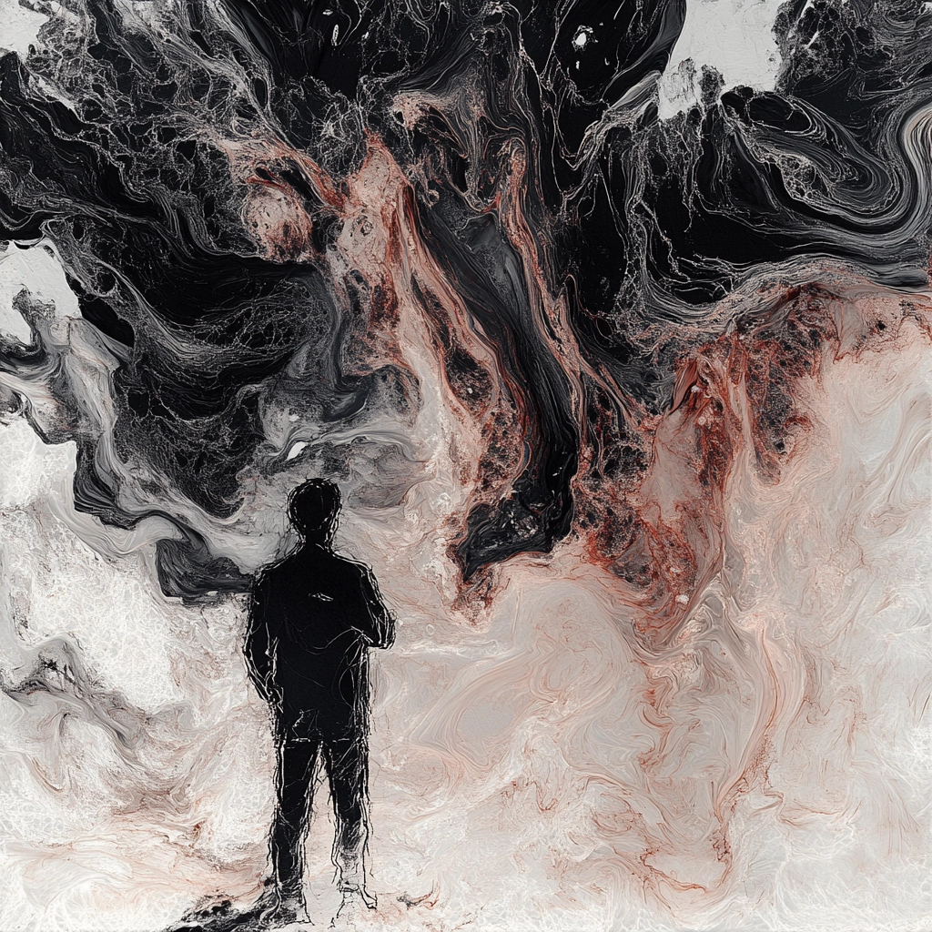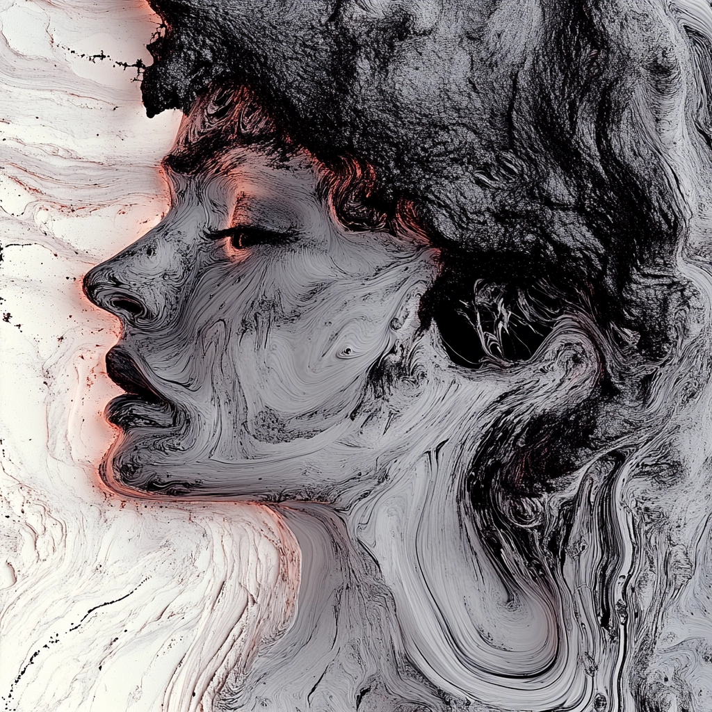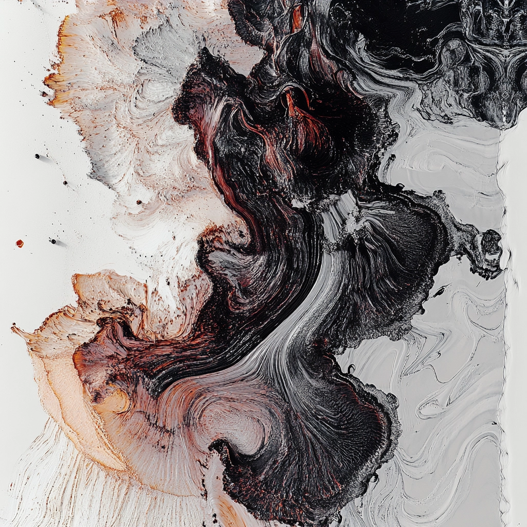 The lighting effects emphasize contrast in light and shadow, while grayscale colors provide depth and complexity. The spatial arrangement creates a swirling motion, making use of varied textures that mimic fluid movements and smoke-like patterns.