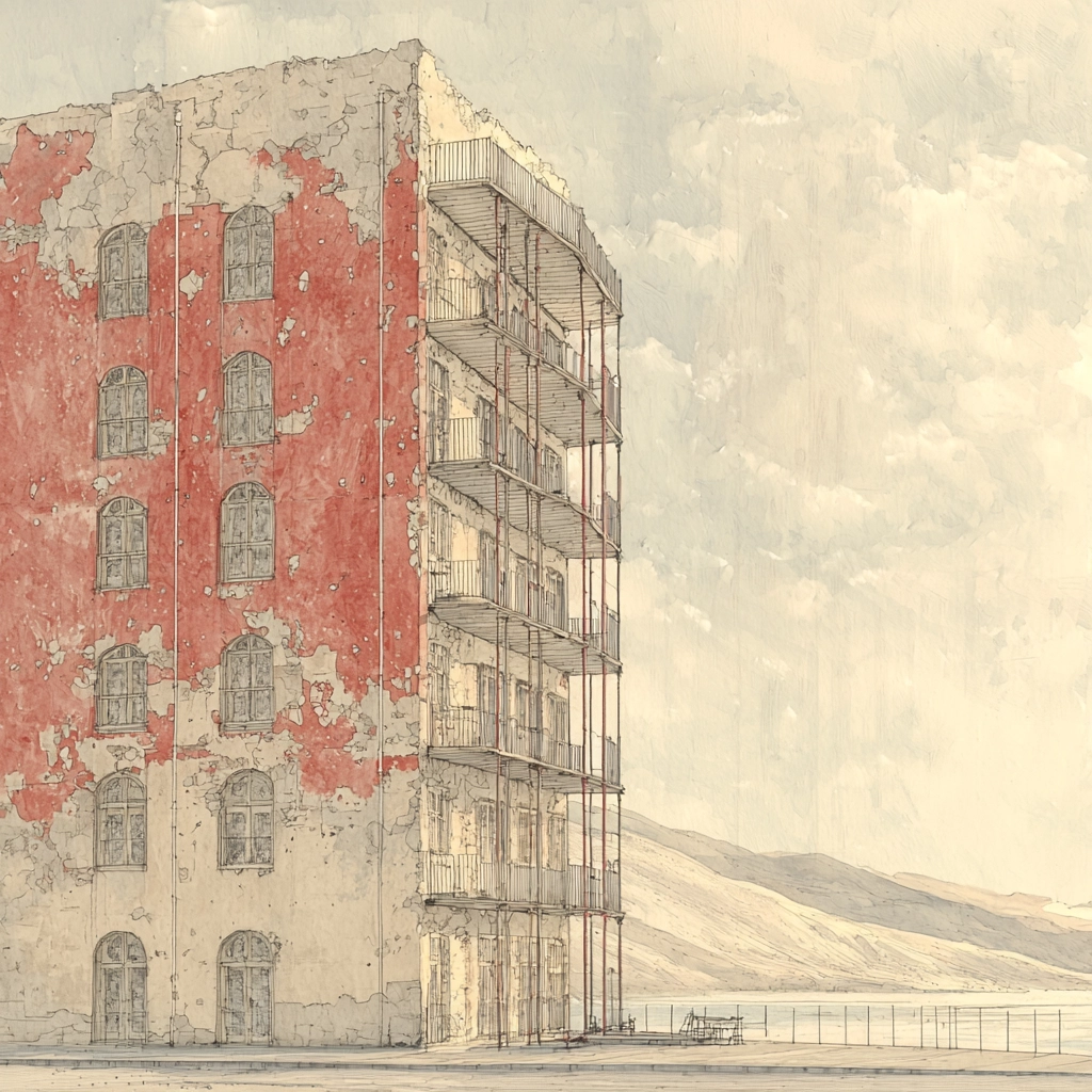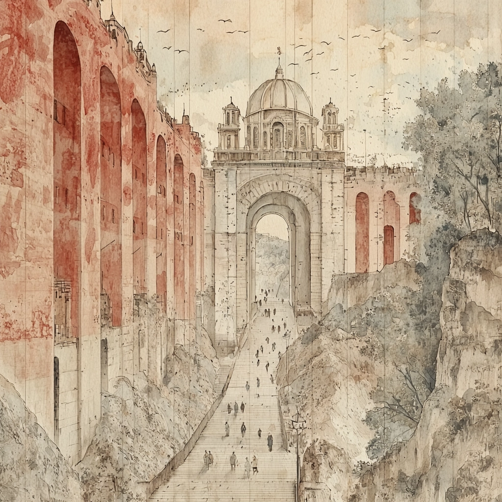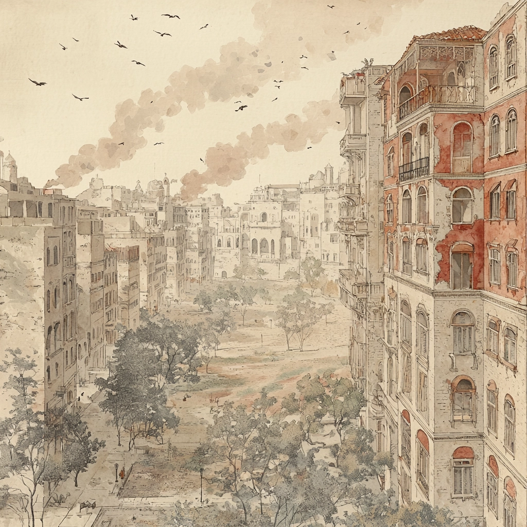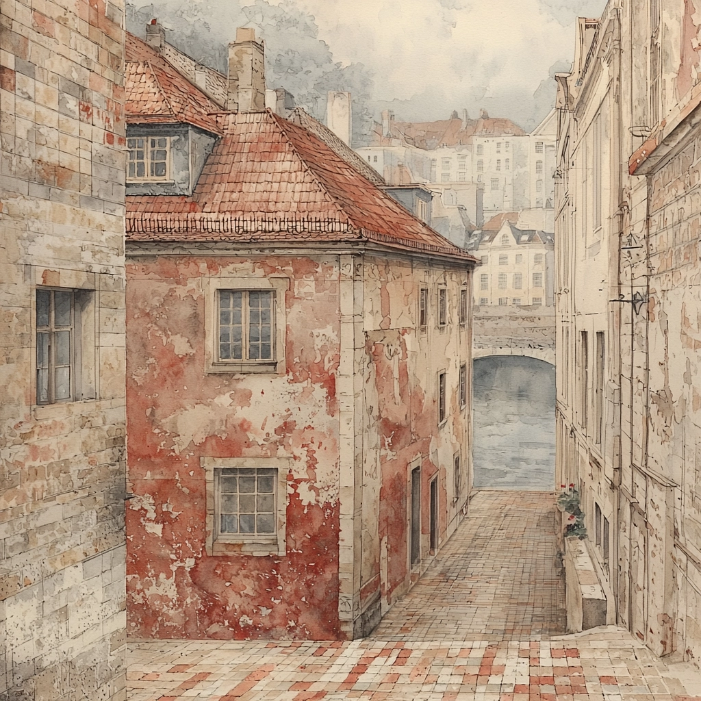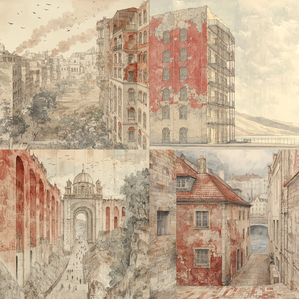 The lighting is soft, preserving the delicate gradients and subtle details hidden within the architectural forms. Colors emphasize faded richness, suggesting a history etched into the surfaces. Textural depth is meticulously depicted, from rough bricks to weathered stone facades.