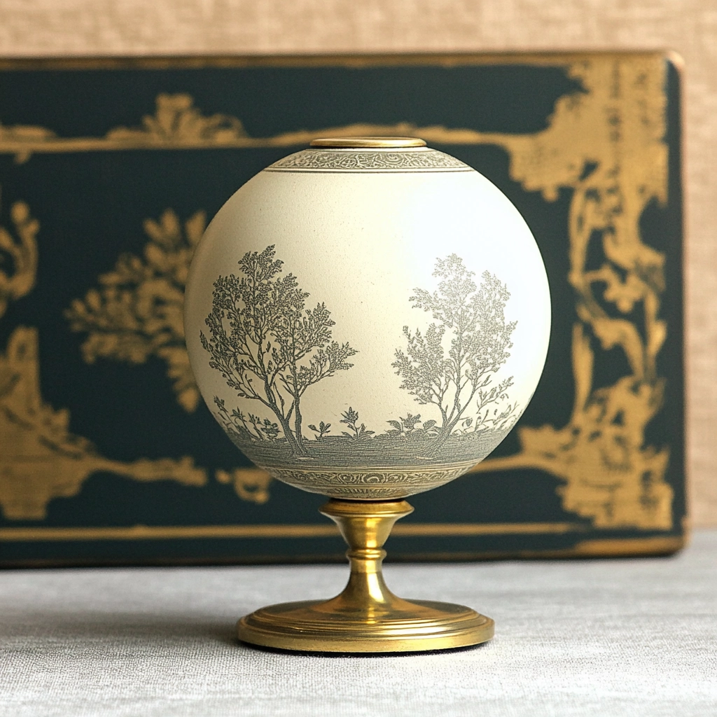 The pieces use lighting to enhance the elegance of gold, combined with a subdued beige and green palette. The composition conveys spatial depth, highlighting ornate borders and textured surfaces with precision.