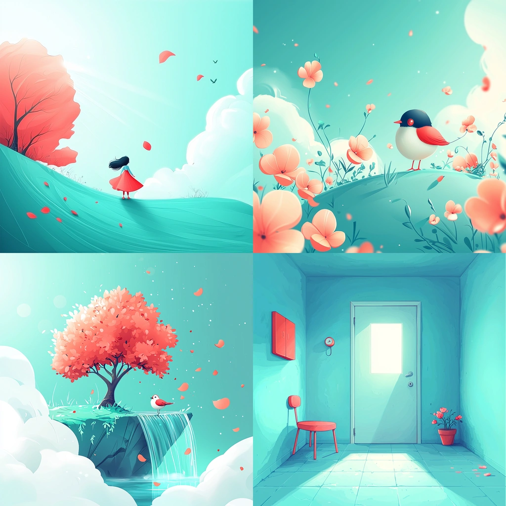Contrasting bright red on vivid cyan backgrounds creates a striking visual harmony.