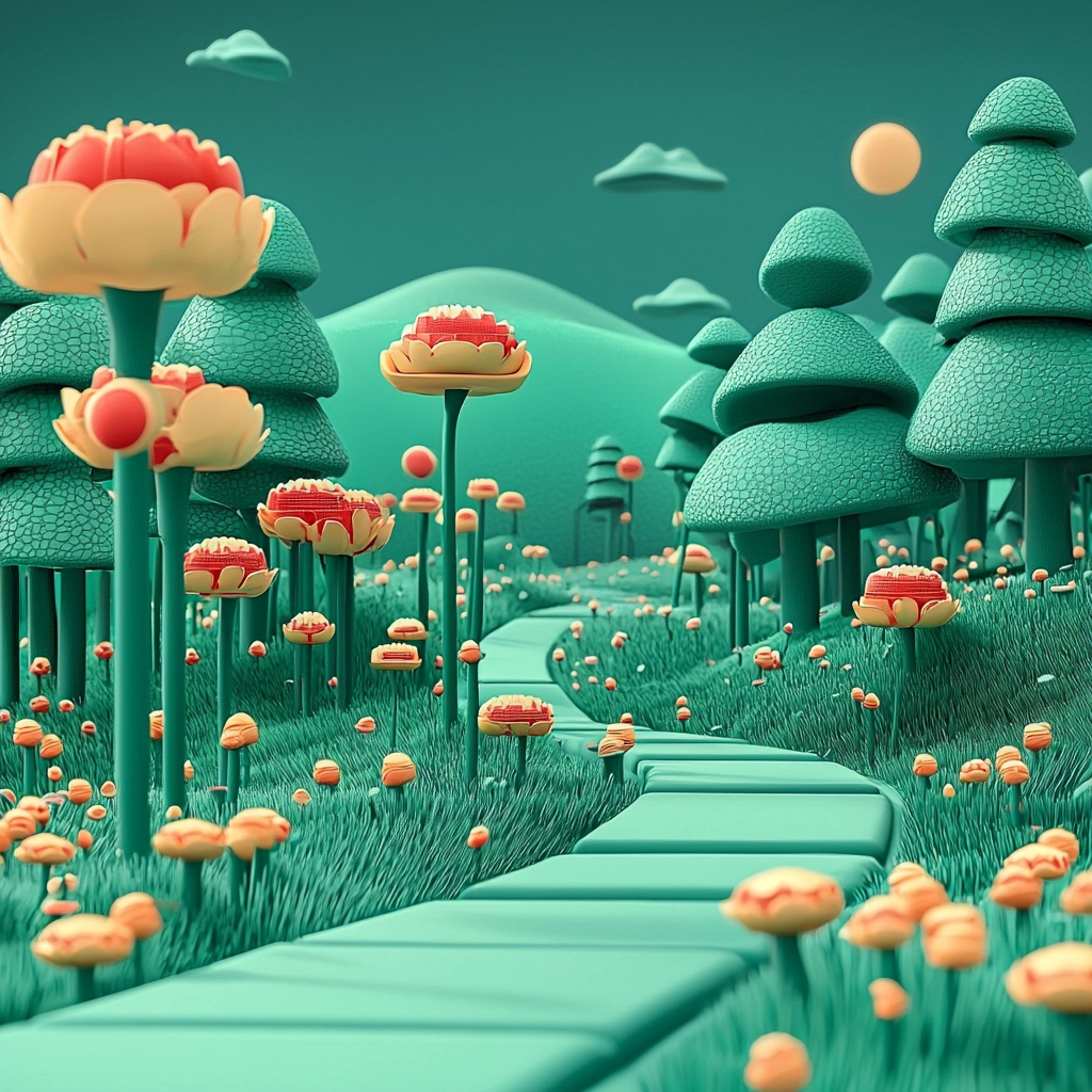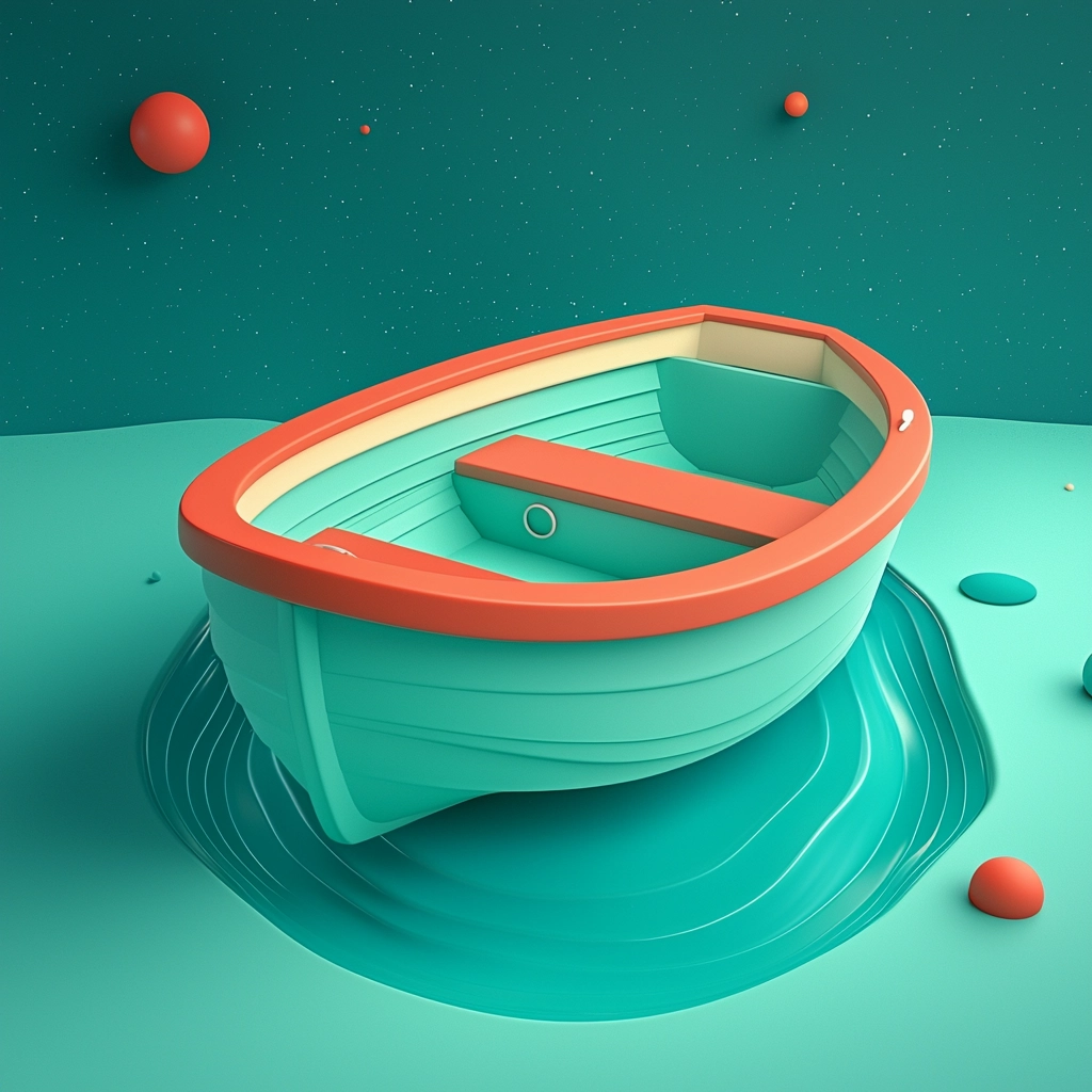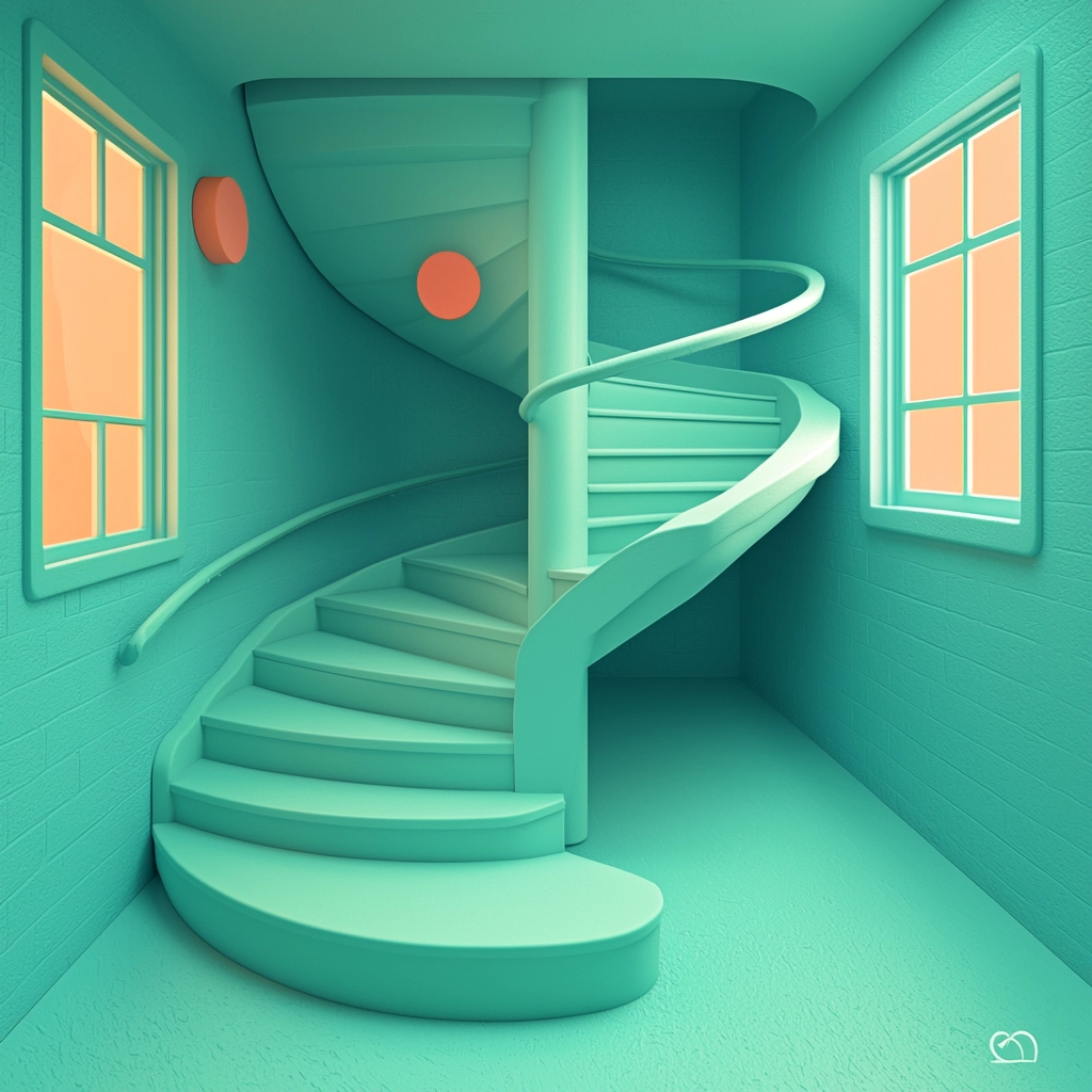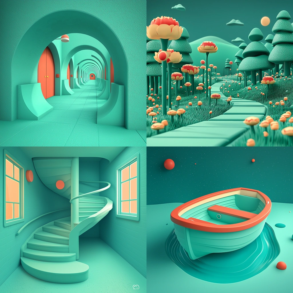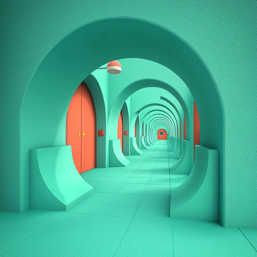 Smooth textures and soft lighting highlight forms, with aqua gradients providing spatial depth. Coral elements punctuate and balance the composition, enhancing visual dynamism.