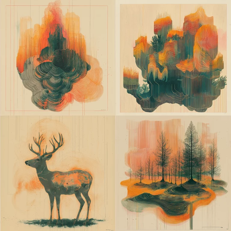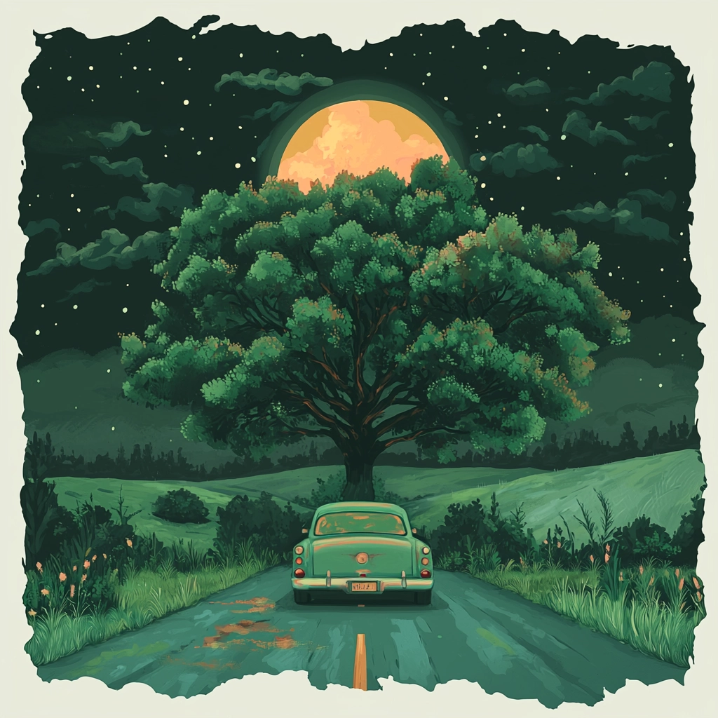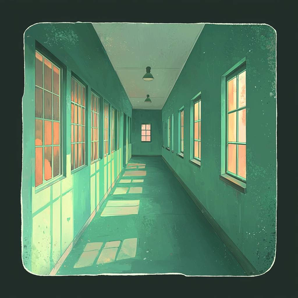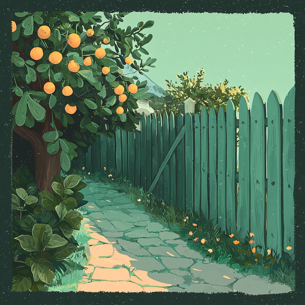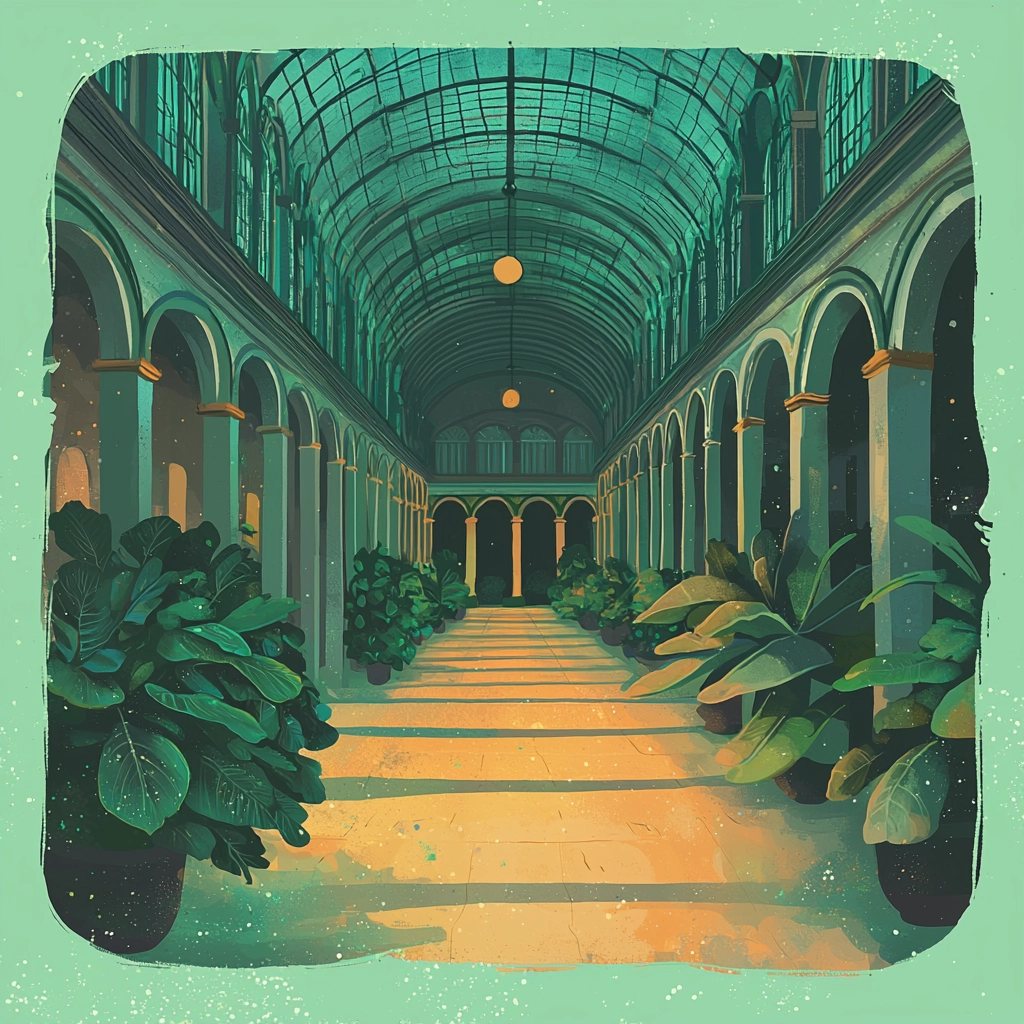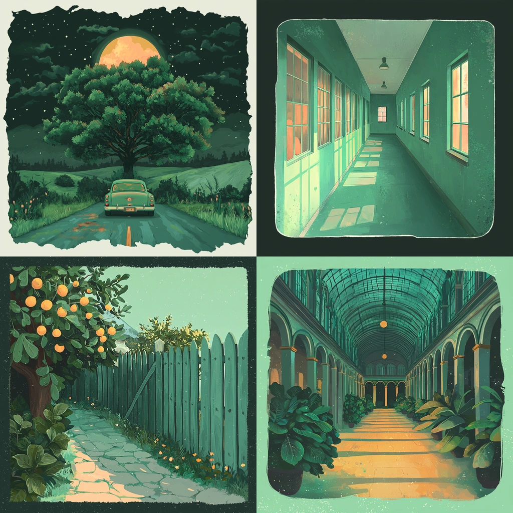 A harmonious balance of green hues with glowing orange accents emphasizes perspective.