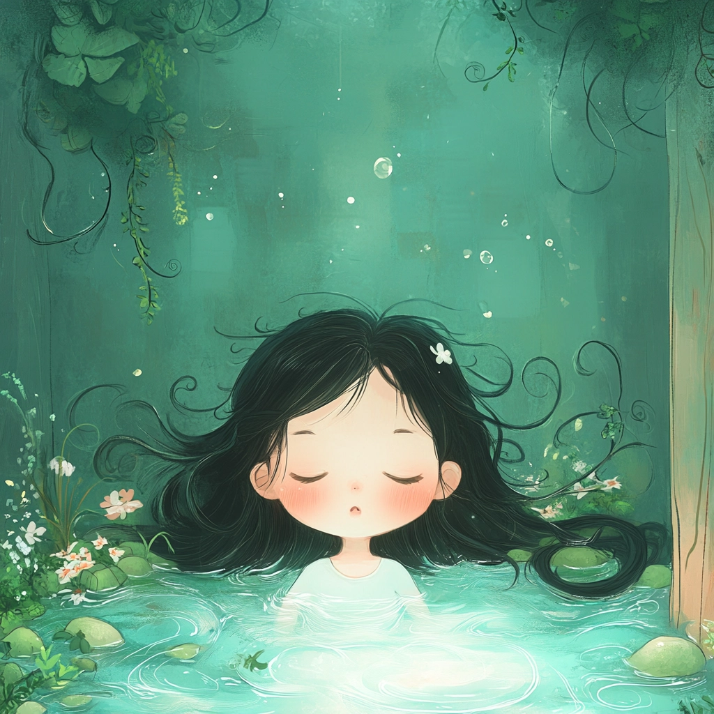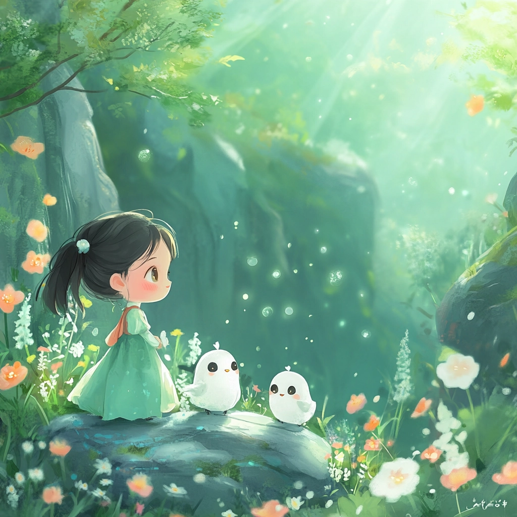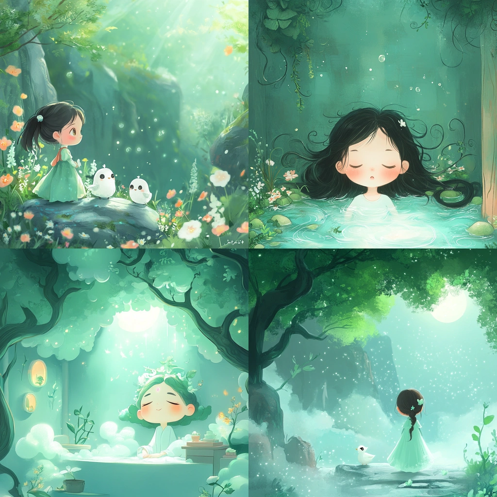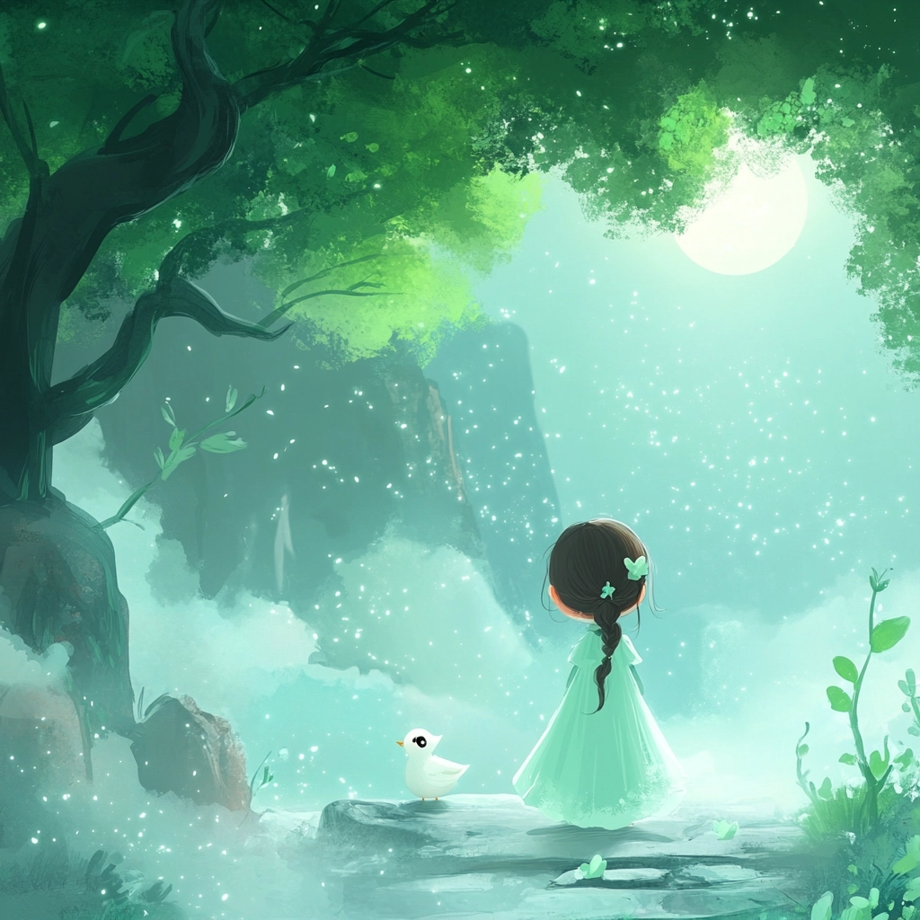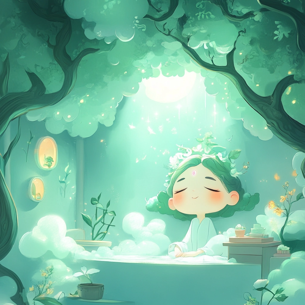 Soft, diffused lighting enhances the gentle green tones creating a serene, dreamlike atmosphere. The texture is smooth with a slight misty quality, giving a sense of ethereal calm. Space appears both open and intimate, with delightful color contrasts.