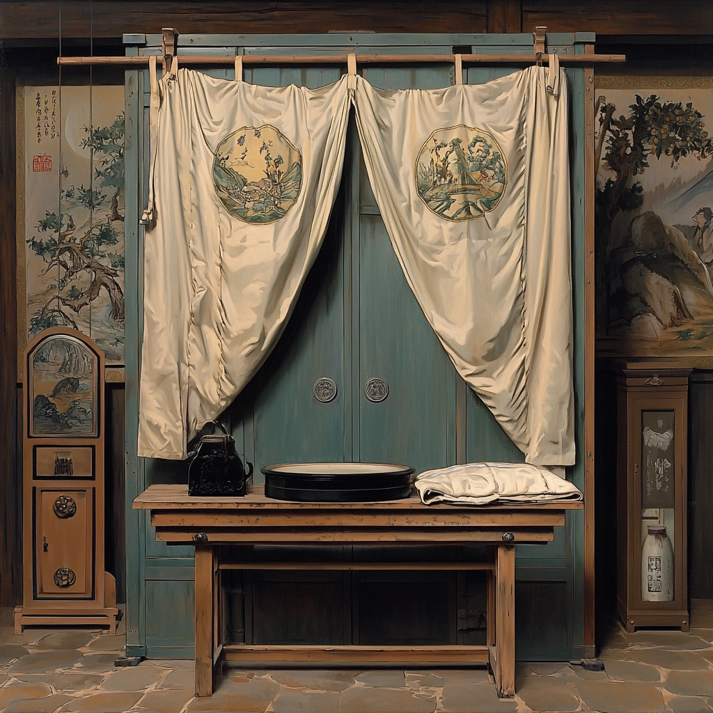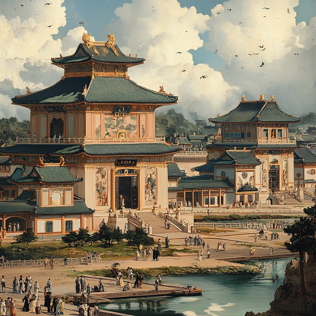 Crisp lighting enhances the details in the structure and natural elements, with a warm beige complementing the vivid blue sky and earthy browns. Textures are intricately rendered, creating a tactile experience within a balanced composition.