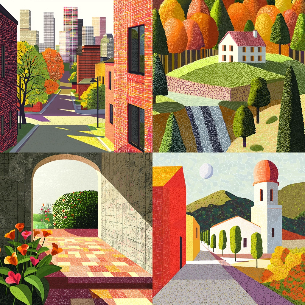 Vibrant compositions featuring strong geometric shapes and defined vibrant colors.