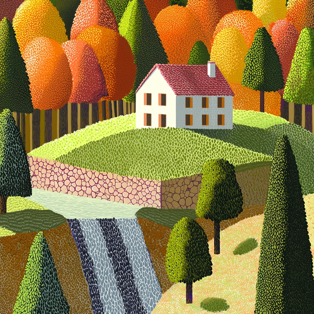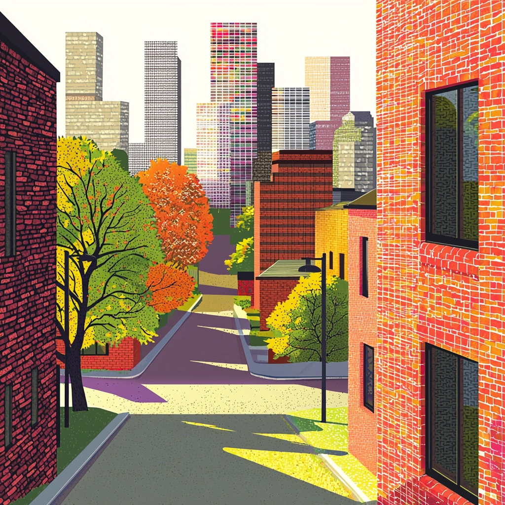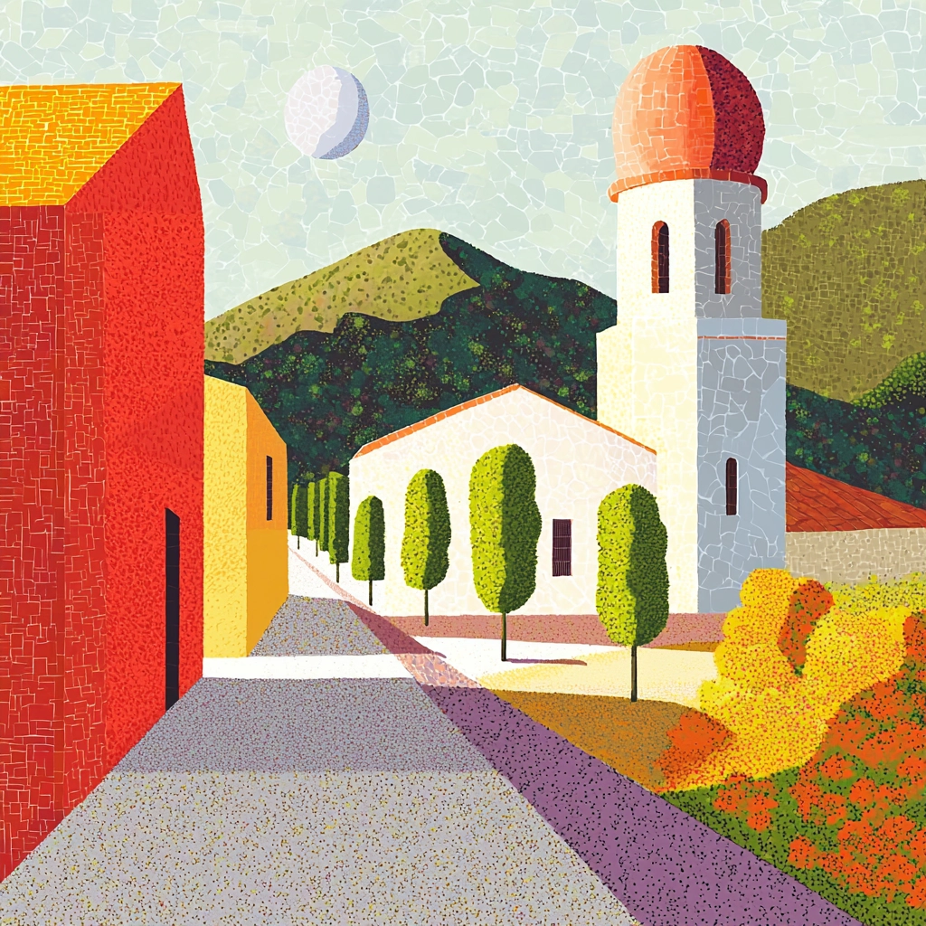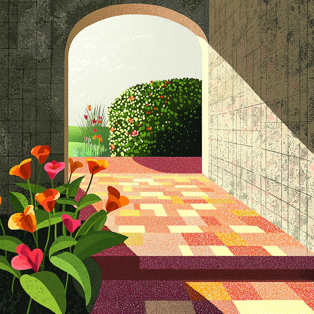 The use of sharp lighting effects showcases varied textures across surfaces with precise delineation. Colors provide a sense of depth through saturation contrast, emphasizing spatial relationships where geometry and linearity dominate.