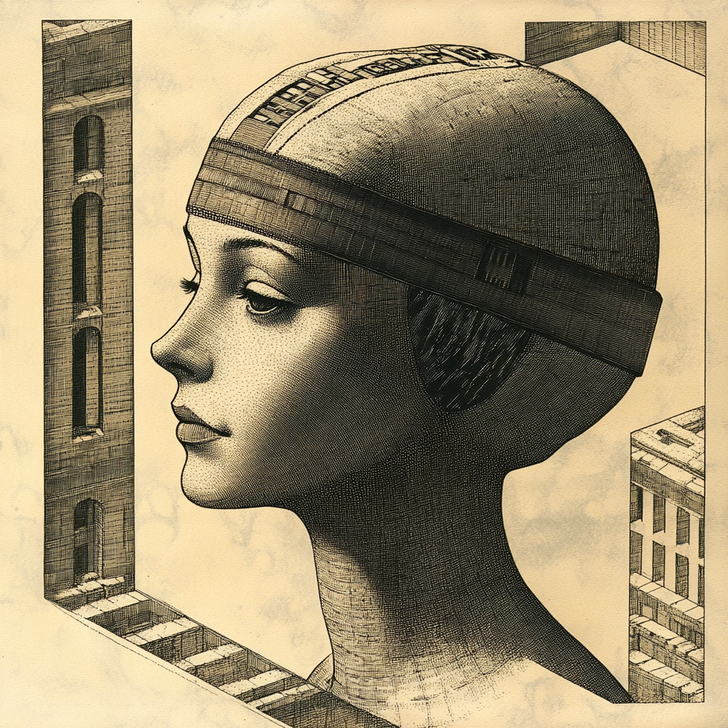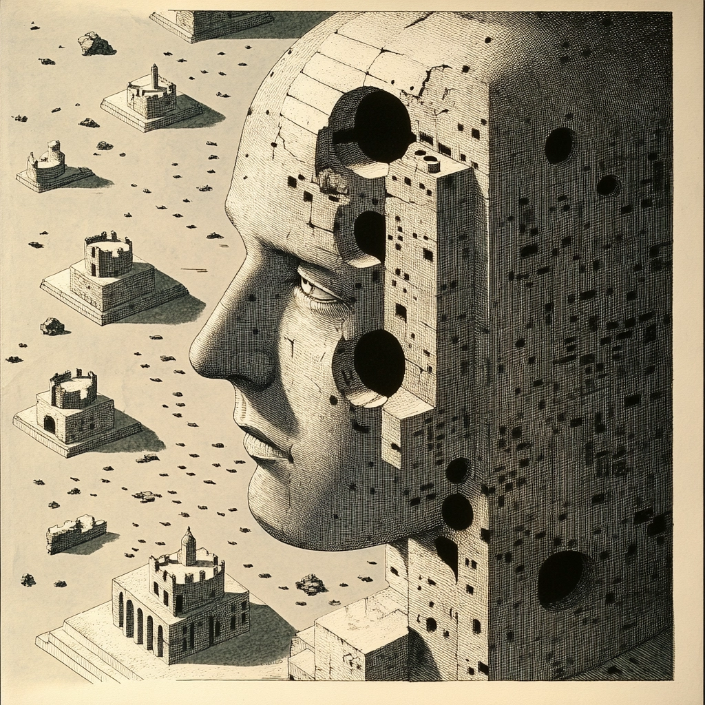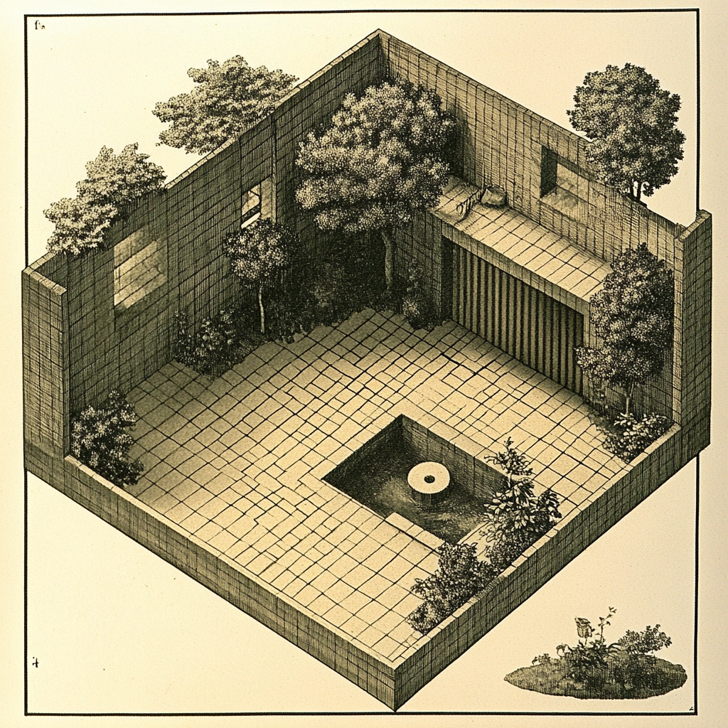 The lighting is sharp and directive, creating strong shadows and contrasts. Colors appear subdued, with a focus on beige, gray, and brown tones. The spatial sense is complex, involving intricate perspective techniques. Texture is expressed through detailed stone and organic patterns.