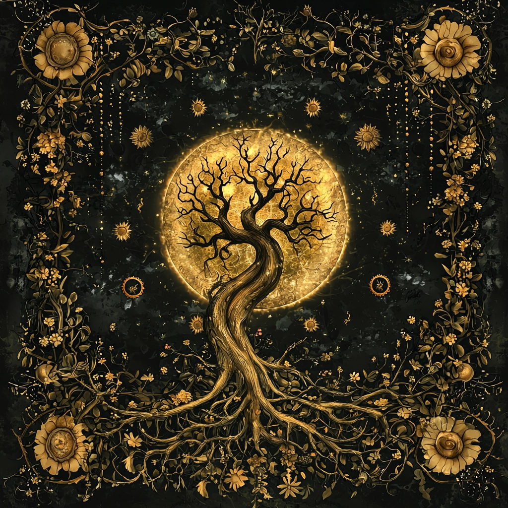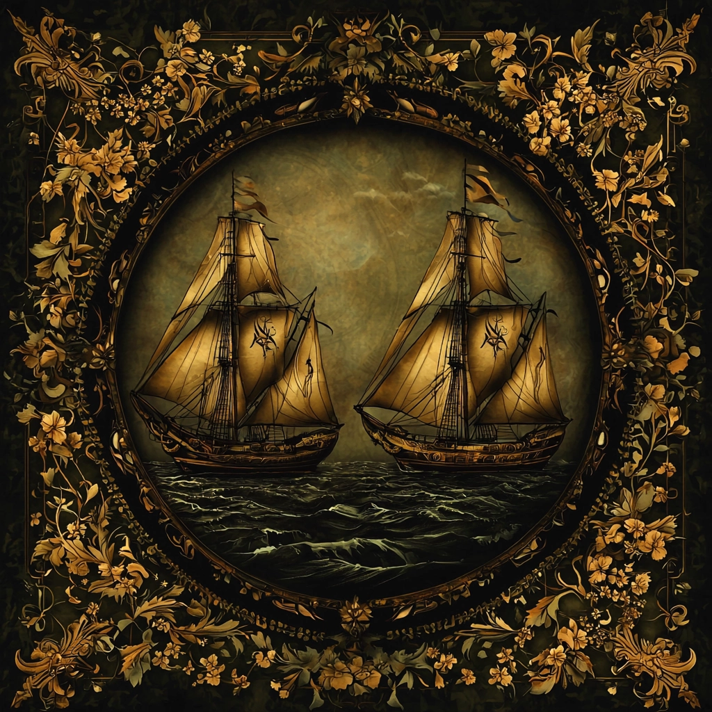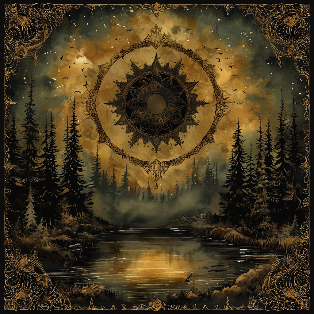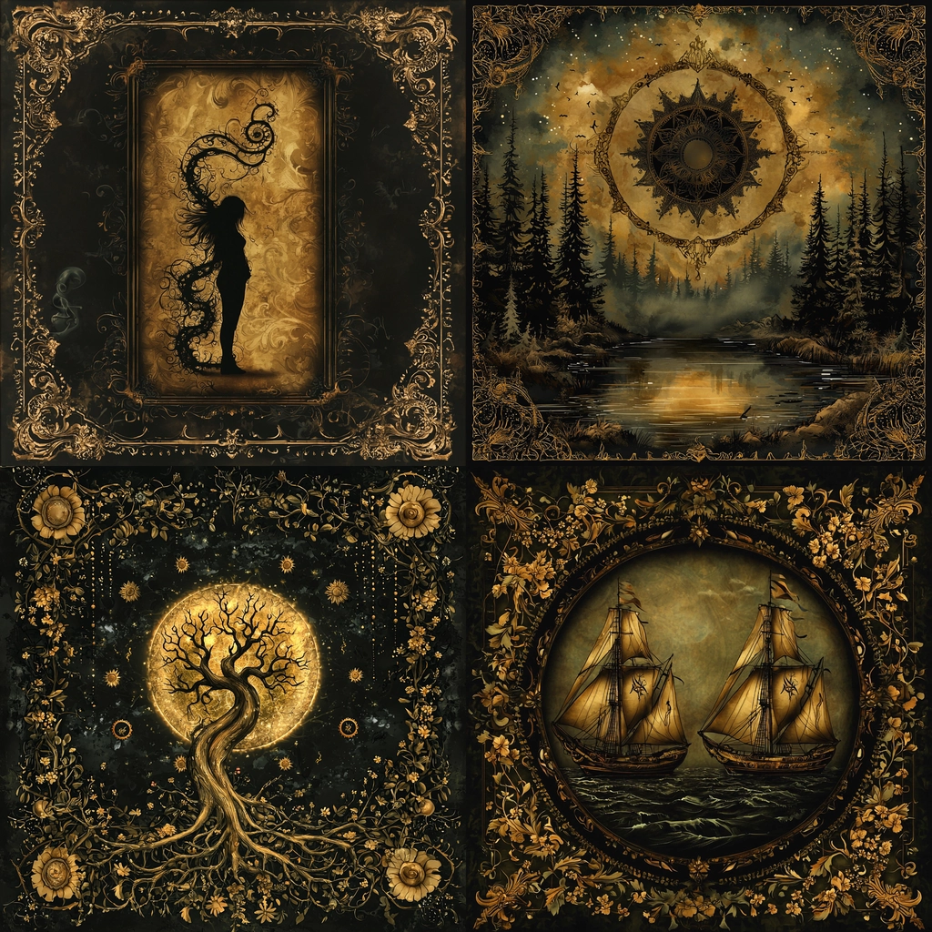 Rich in textured details and bordered embellishments with dynamic gold on dark backgrounds.