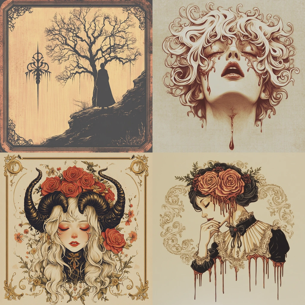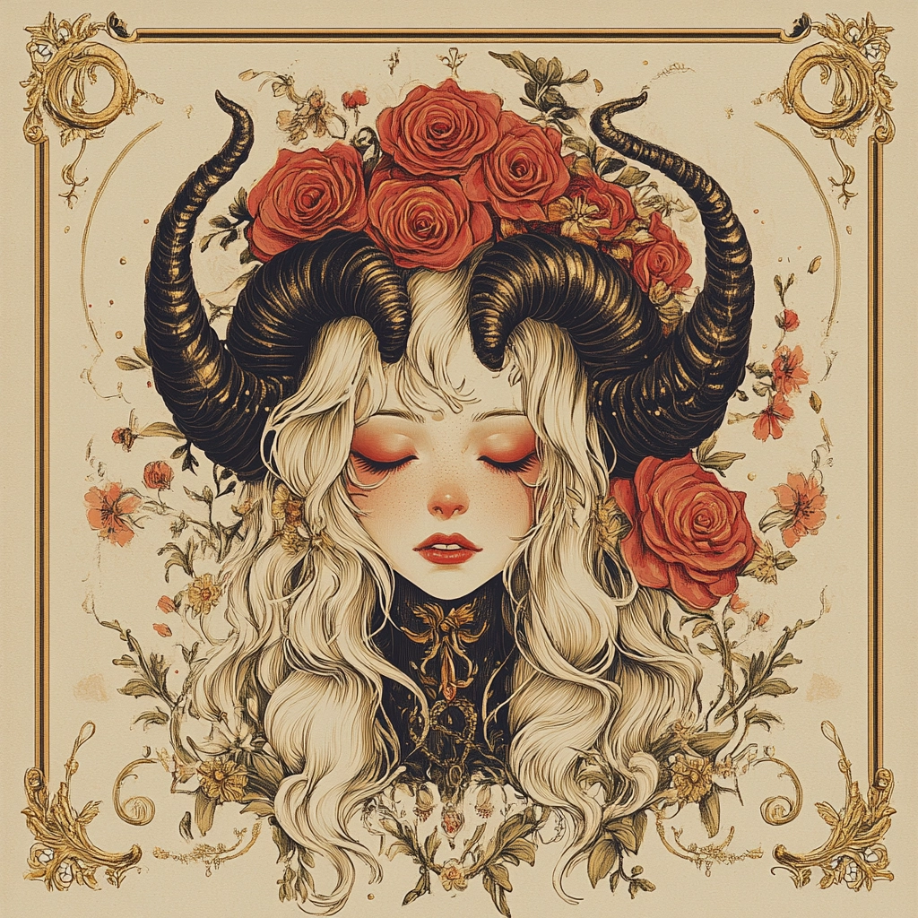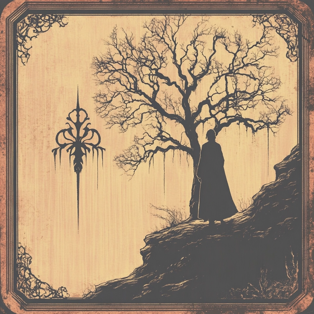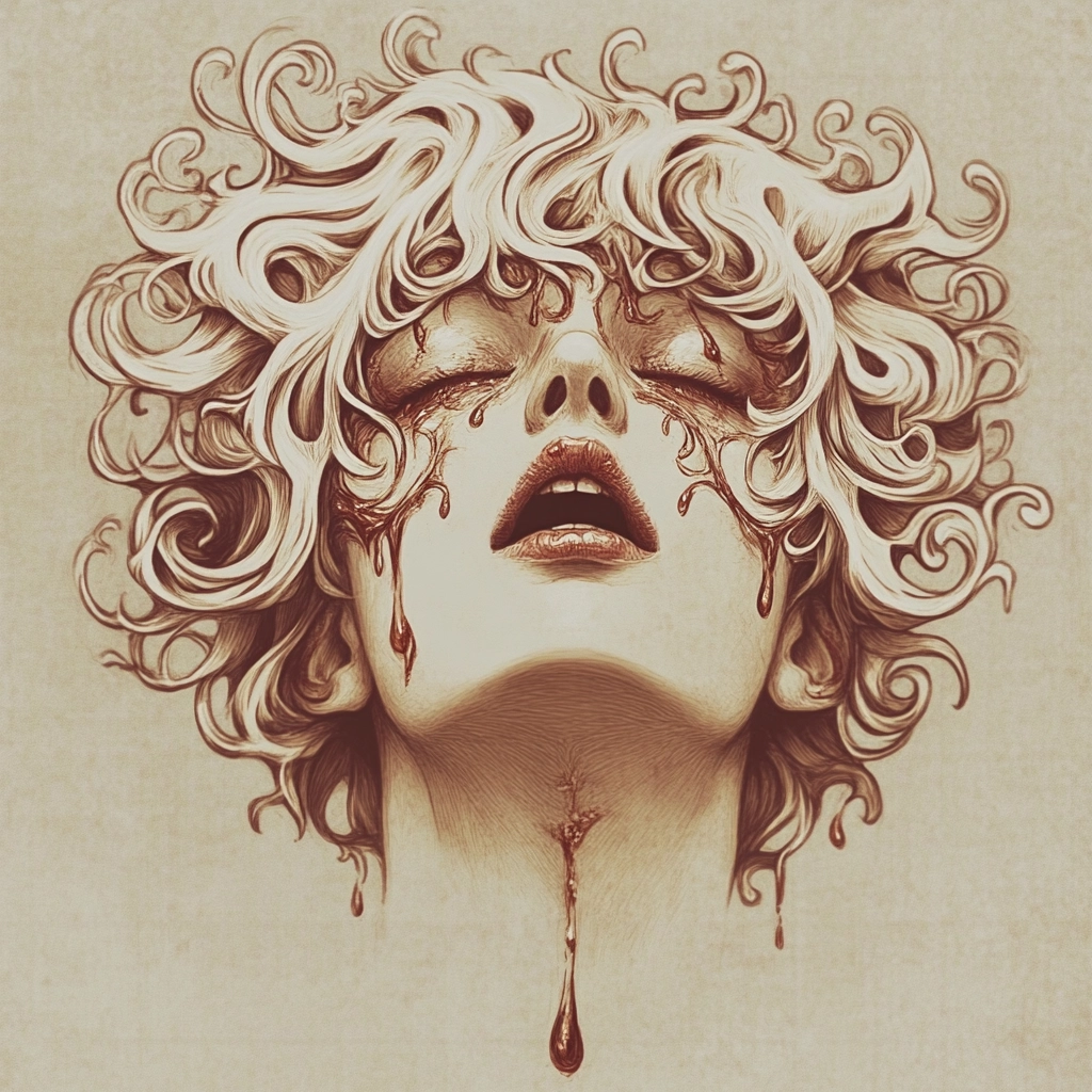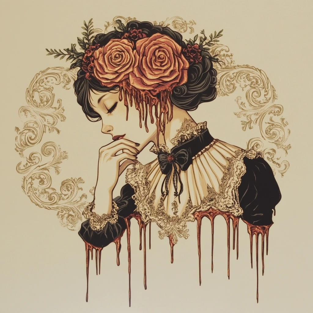 The use of intricate linework and shading creates a vivid spatial depth complemented by dark outlines. Texture is subtly implied through detailed patterns, while the color palette of red, beige, and black adds a dramatic flair.