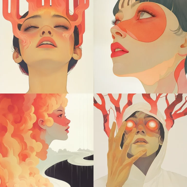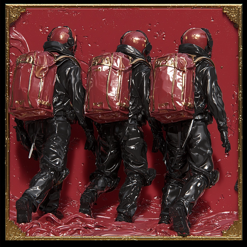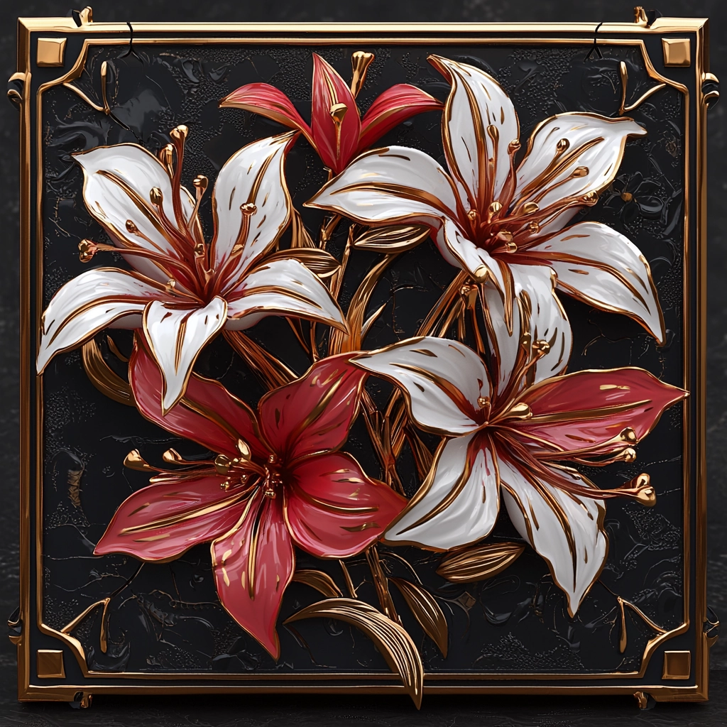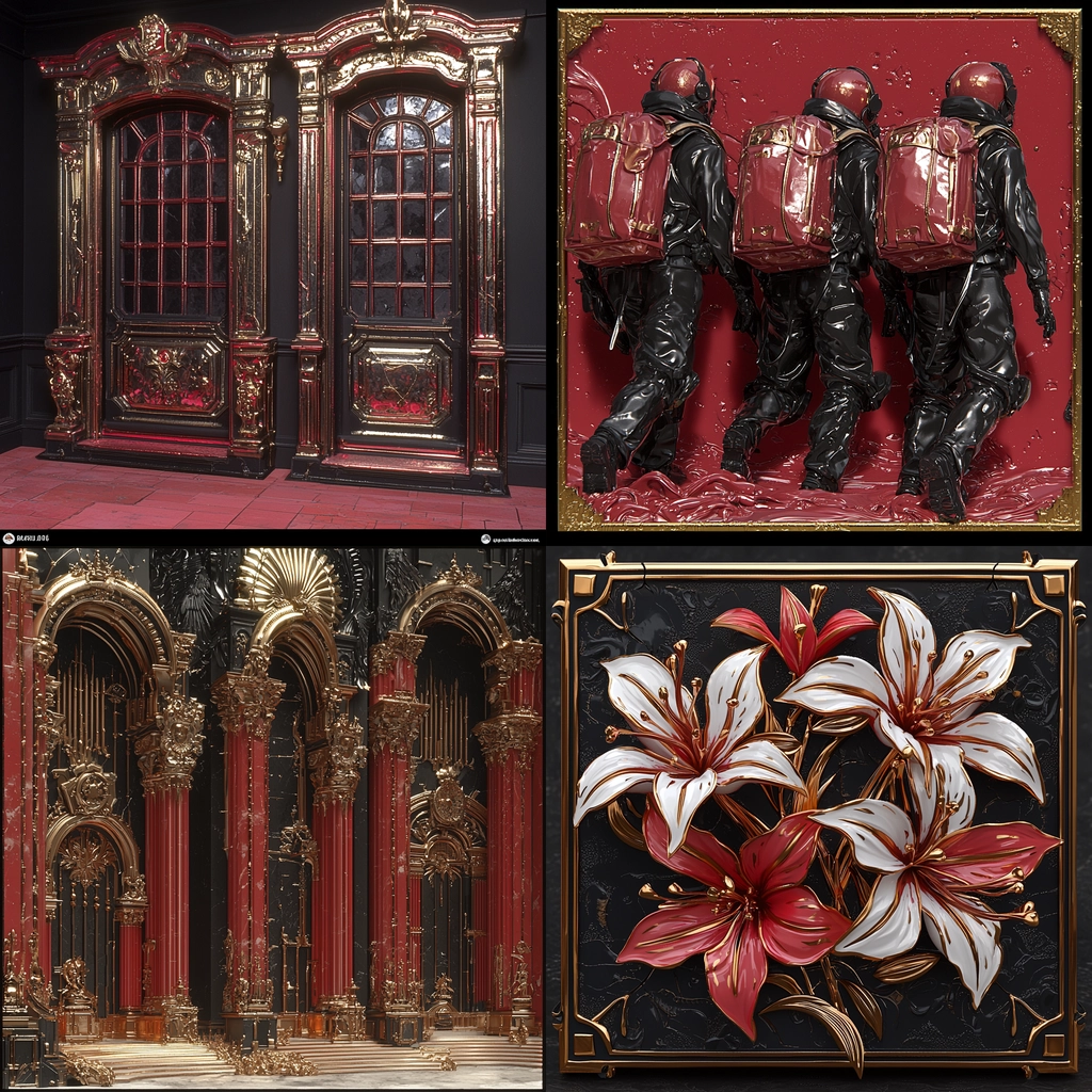 Rich composition featuring intricate baroque-inspired details with dominant red and gold hues against a black backdrop.