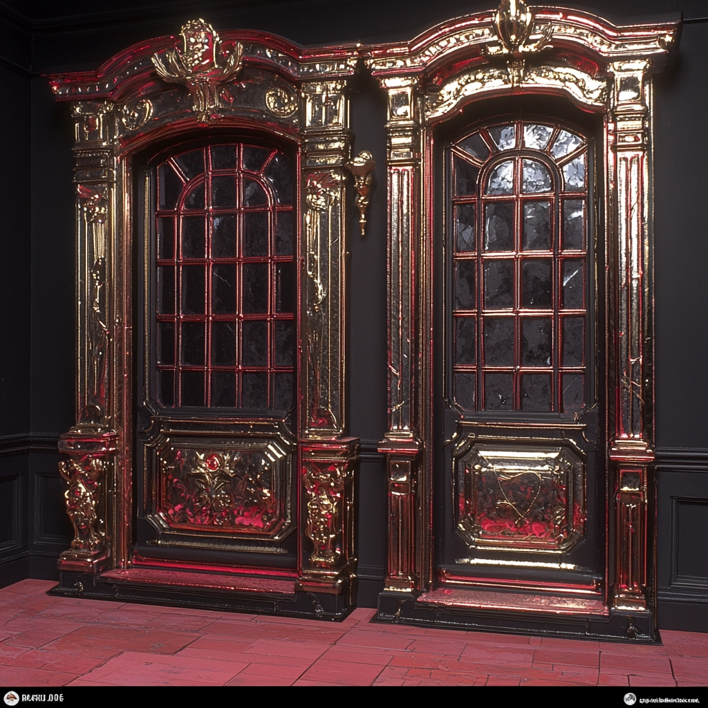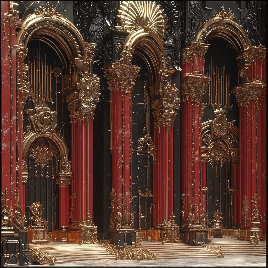 Intense lighting highlights lavish gold against deep red tones, creating a sense of opulence and grandeur. The textures are richly detailed, accentuated by high-contrast shadowing. Intricate designs create an immersive depth, almost architectural in feel.