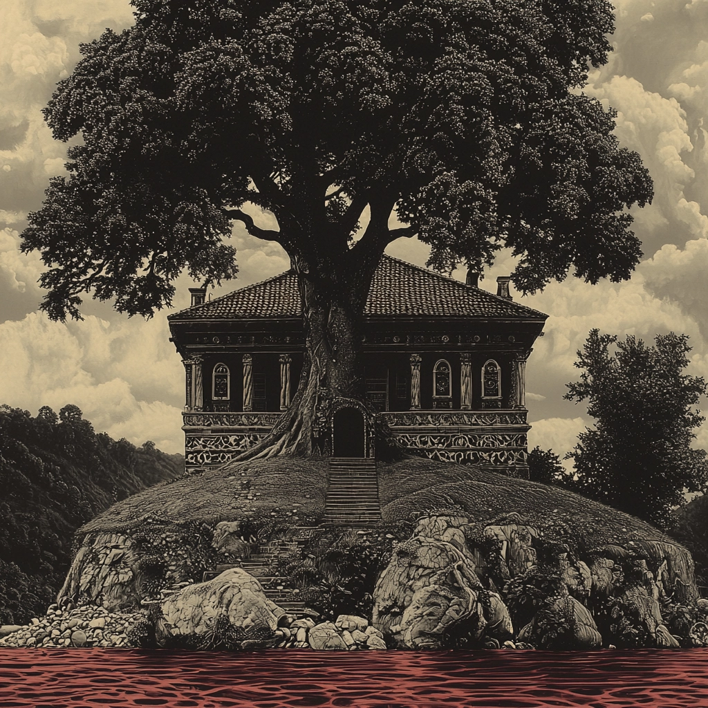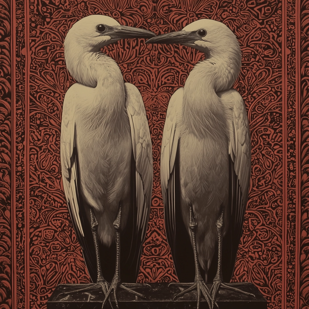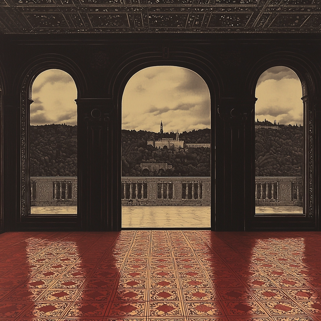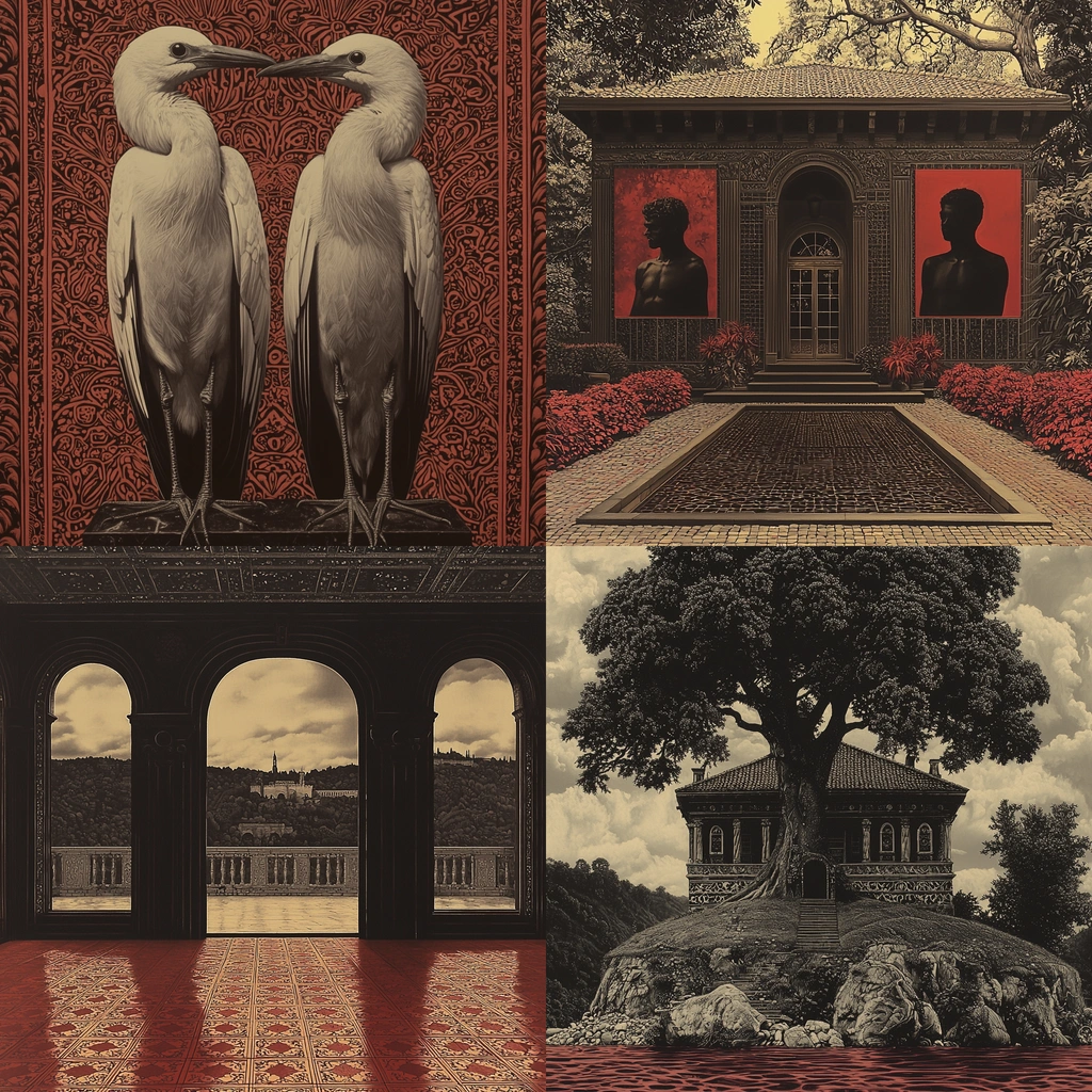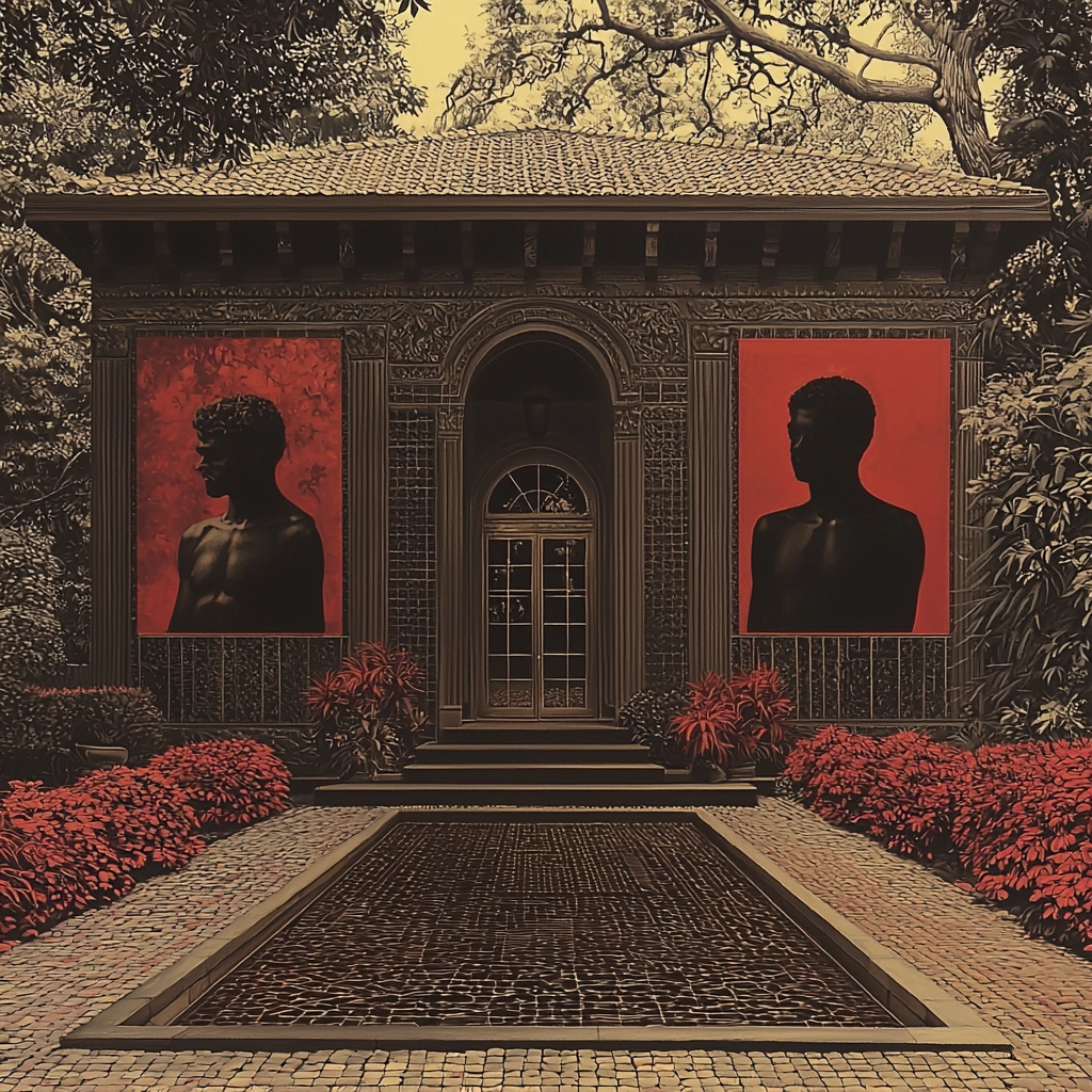 Rich, deep lighting creates a sense of solid dimensionality; warm red interplays with soft browns and beige, enhancing texture; balanced spatial distribution conveys depth and structure.