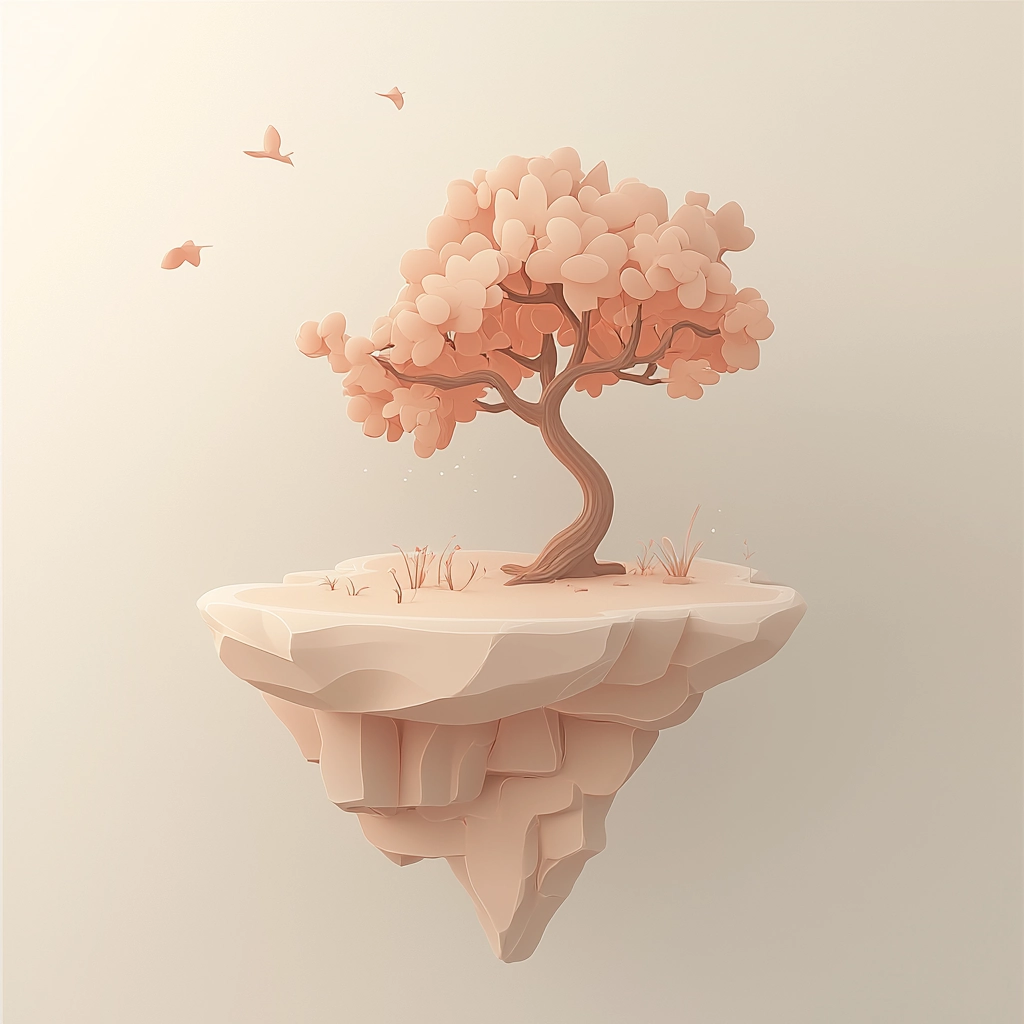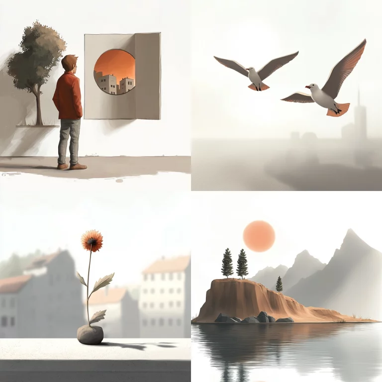 The composition features muted colors with clean lines creating a whimsical yet grounded effect.