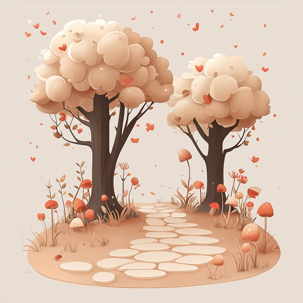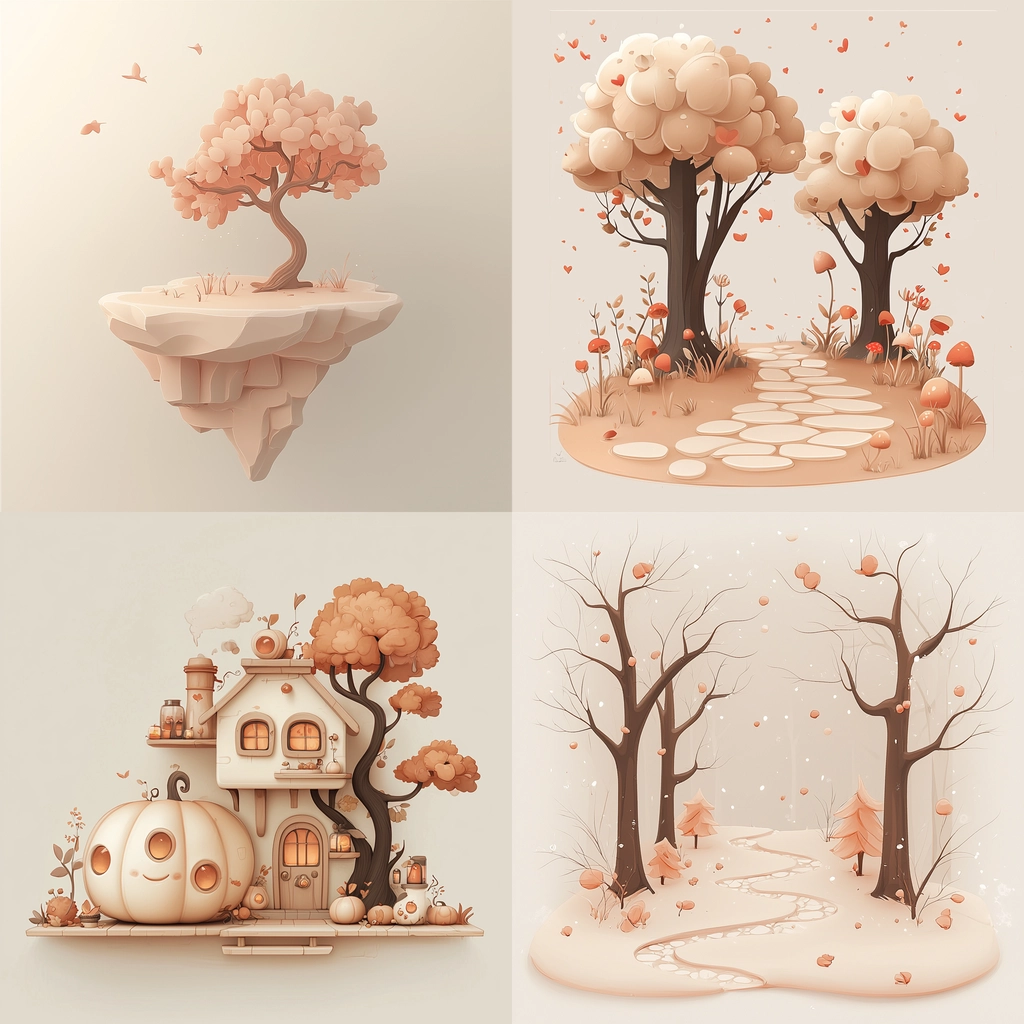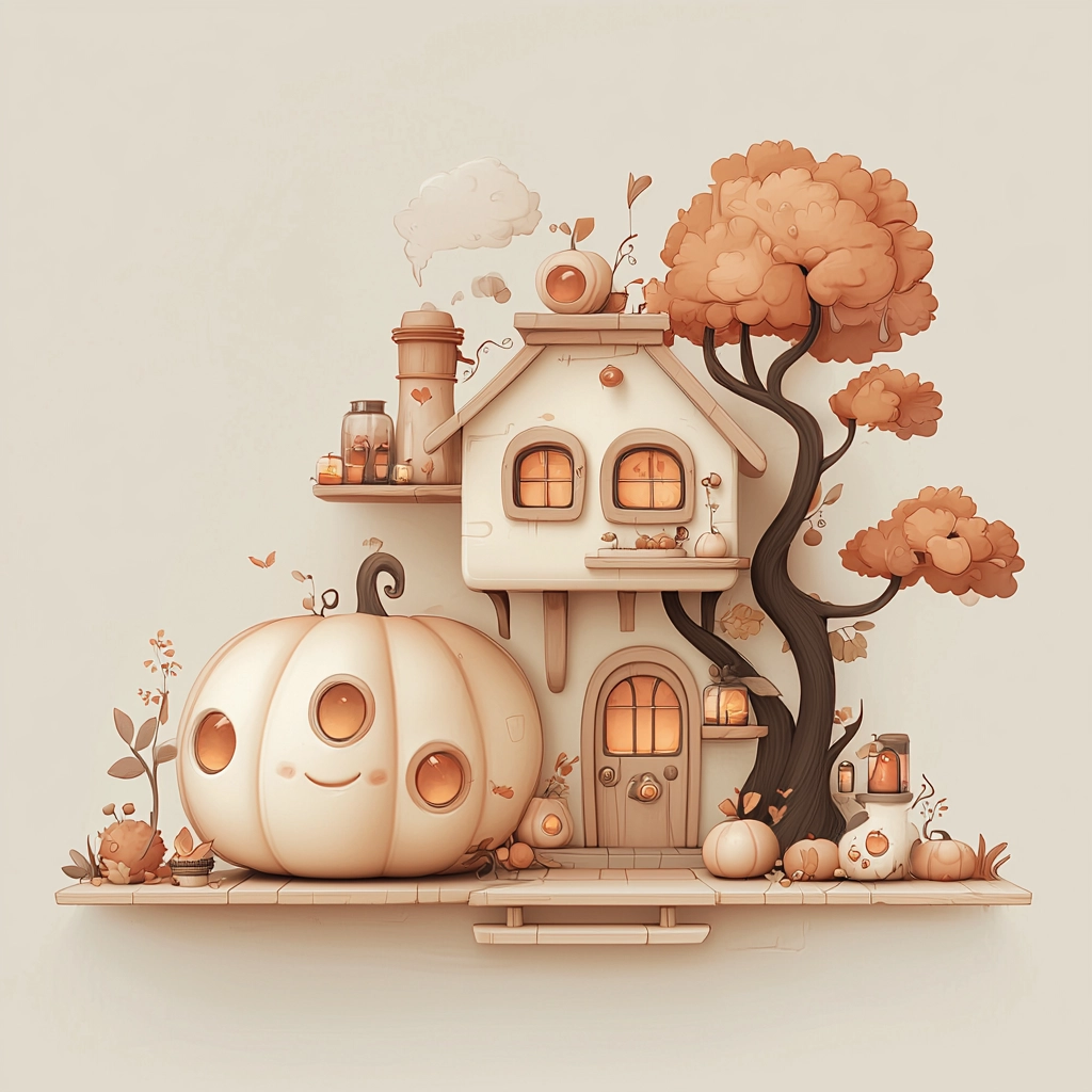 The lighting is soft, providing a warm glow to the smooth, rounded forms. Gentle beige and orange hues dominate throughout, creating a harmonious balance. The spatial arrangement is organized with a playful yet orderly structure, inviting exploration without overwhelming complexity.