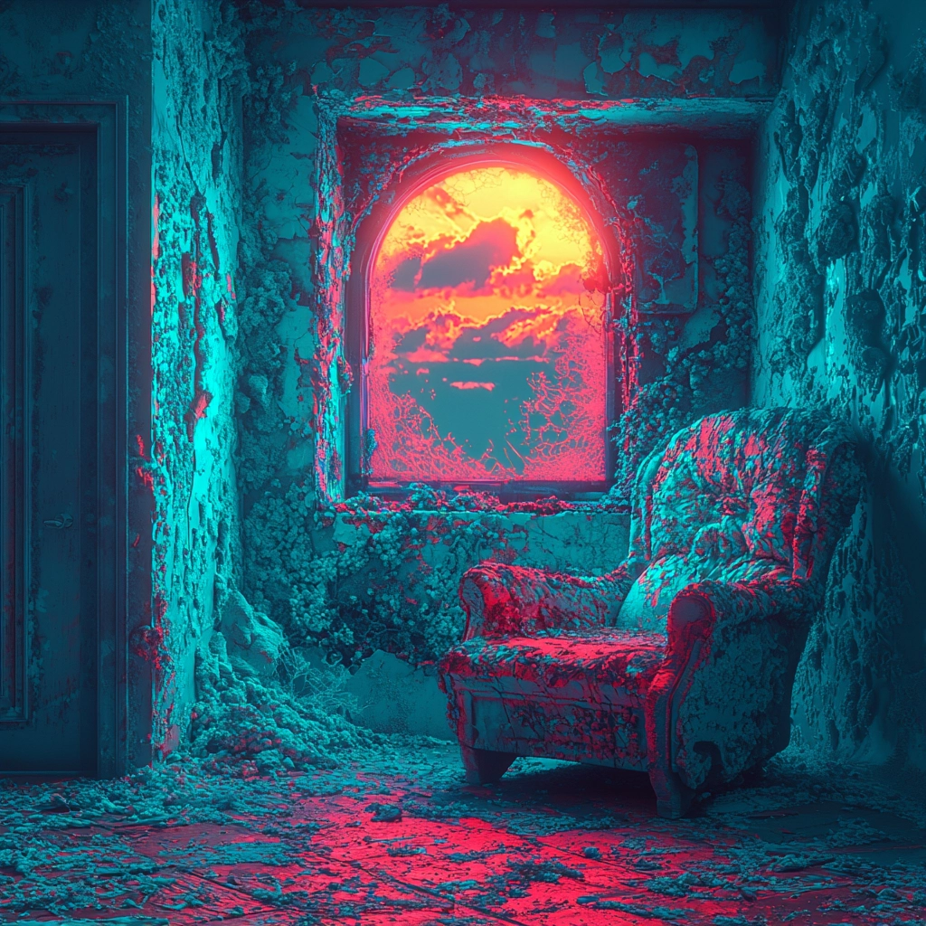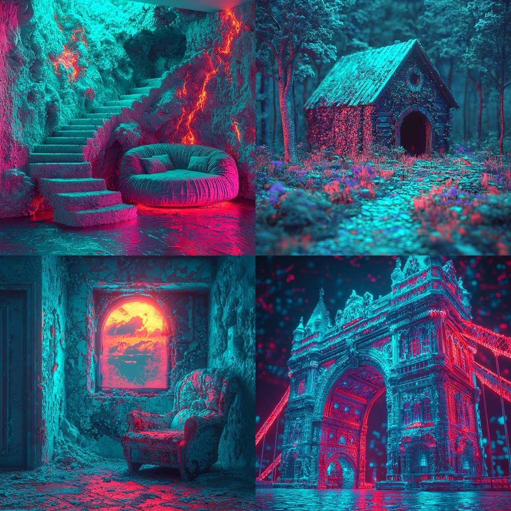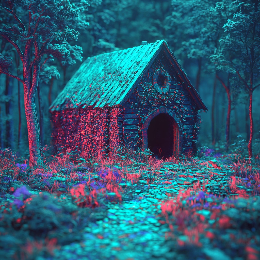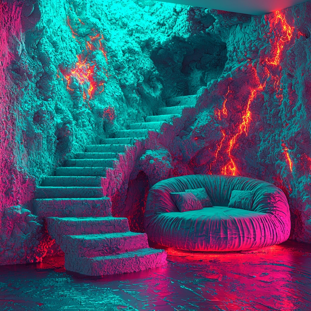 The lighting showcases a bioluminescent glow, emphasizing vivid hues and distinct textures. The spatial layout provides depth through shadow and illumination, while textures appear tactile and smooth, adding a sense of movement and vivid contrast across the composition.