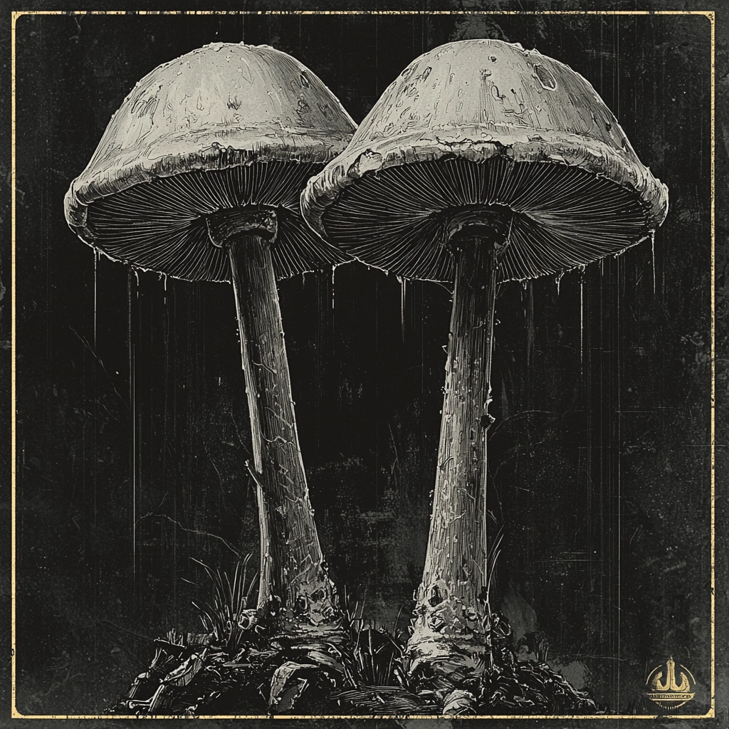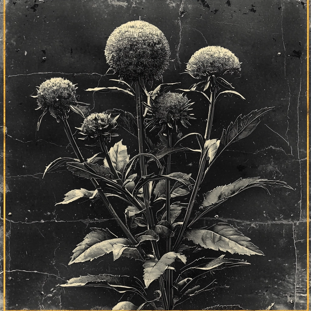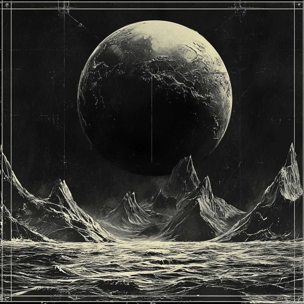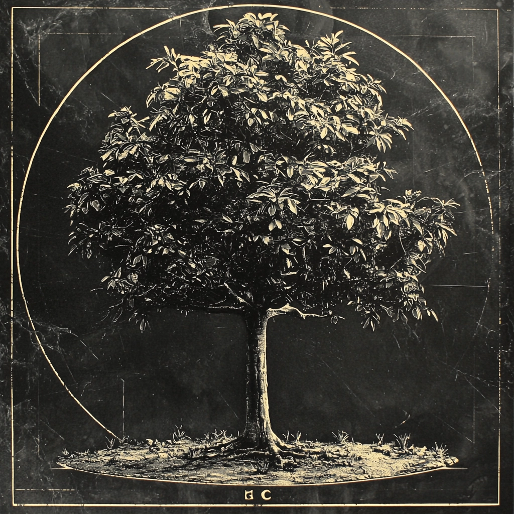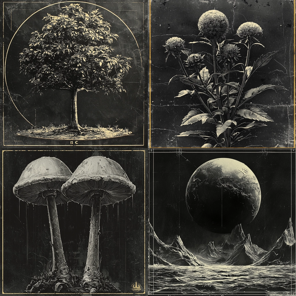 The artwork features a dominant lighting contrast that emphasizes the intricate line work, with highlights and shadows rendered meticulously through fine sketch-like strokes. The spatial layout offers isolated glimpses into nature, creating a clear and focused impression.