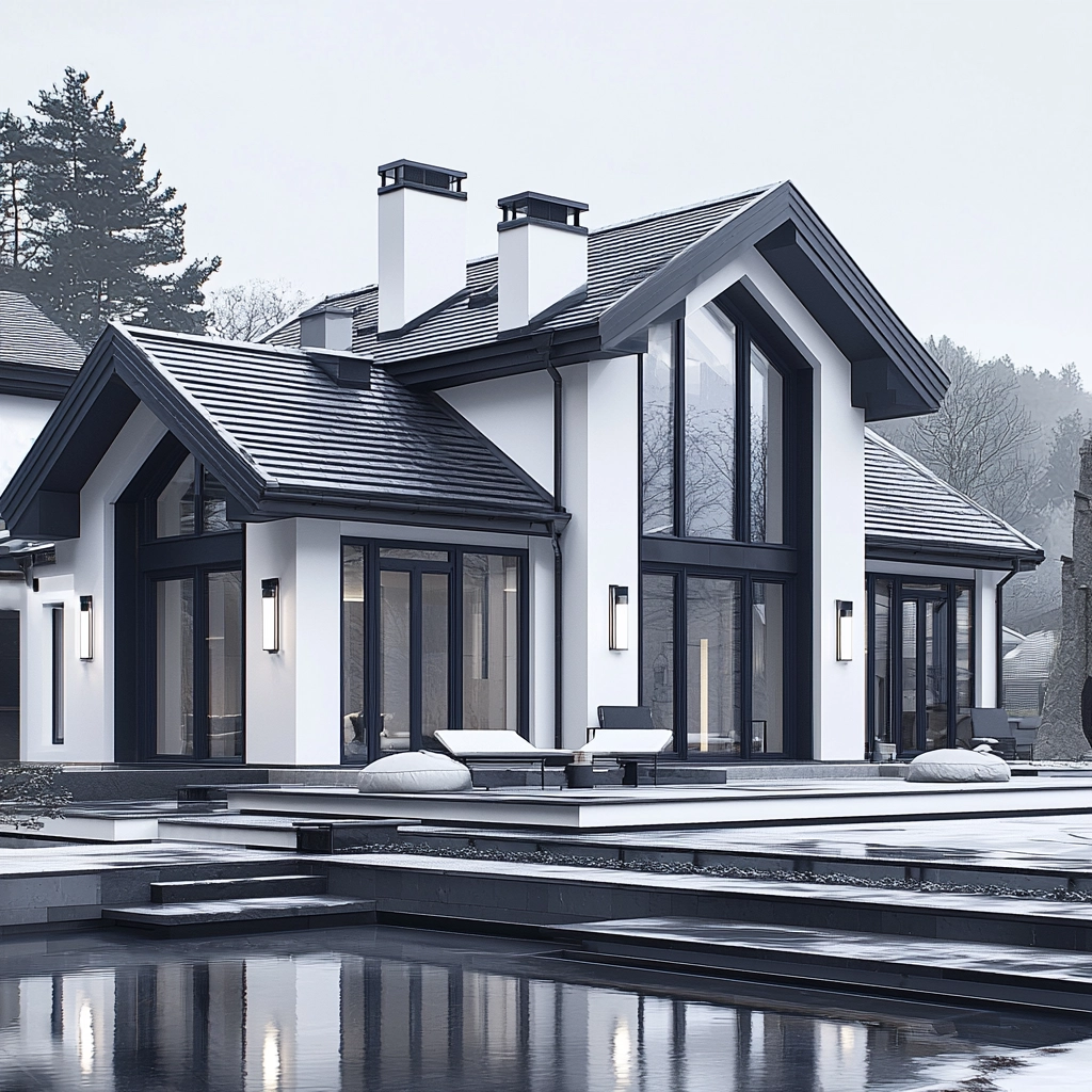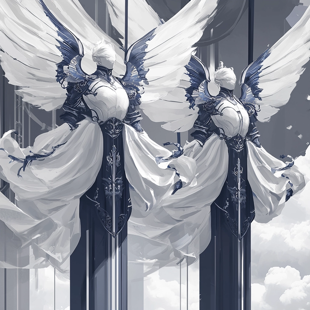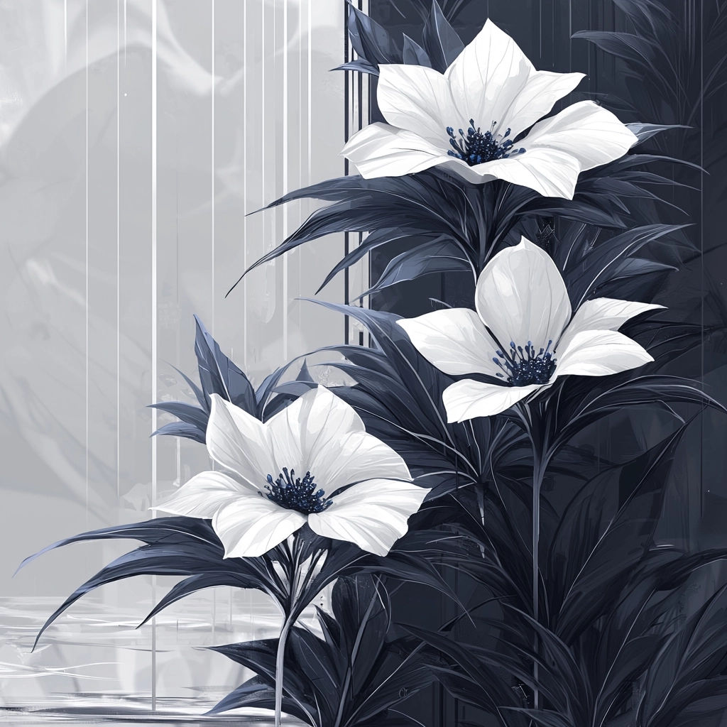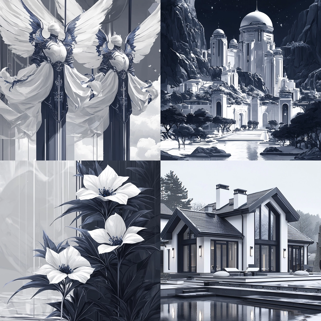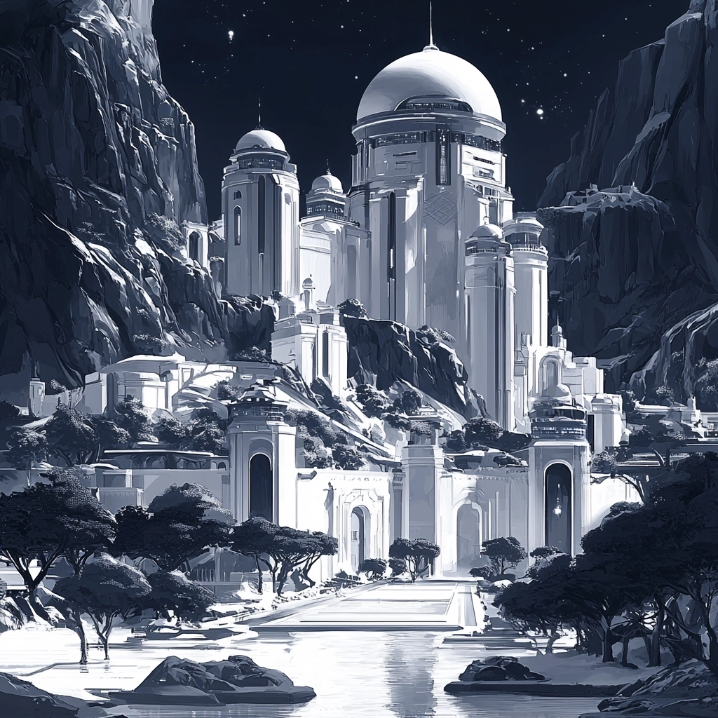 The use of grayscale lighting emphasizes form and creates a sense of depth. Smooth texture application highlights both architectural details and organic representations. Spatial arrangement contrasts grounded structures with vertical elevation, enhancing visual sophistication.