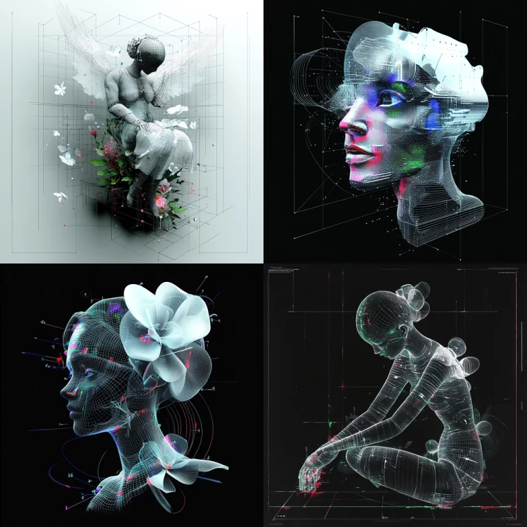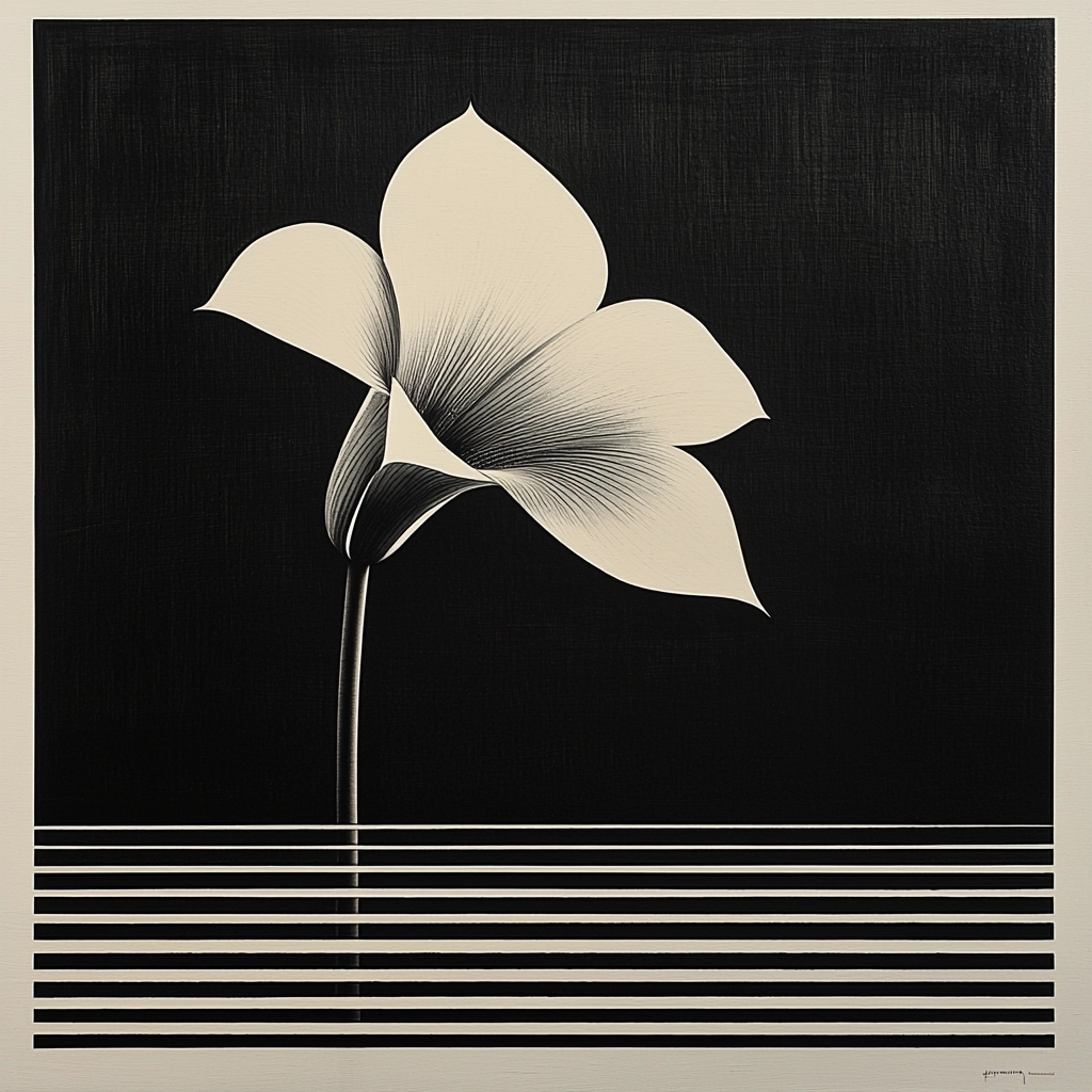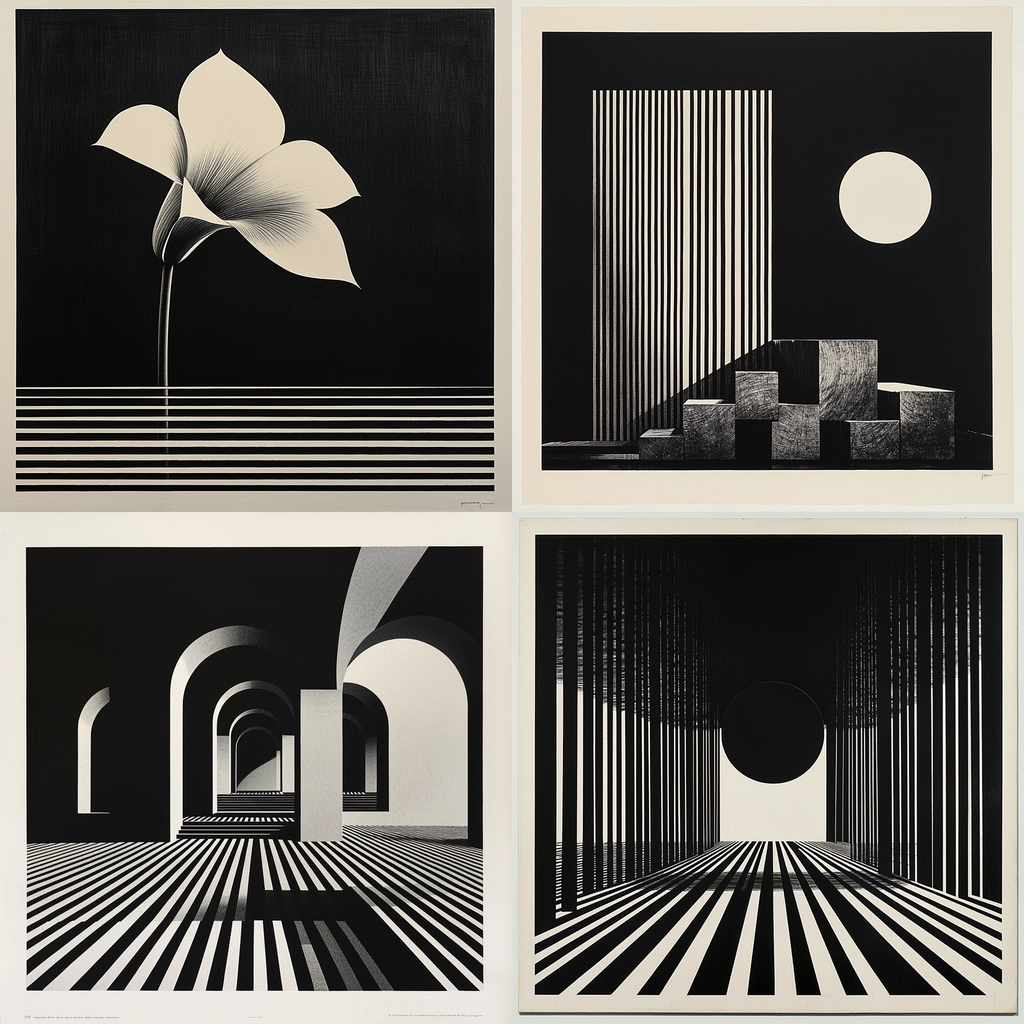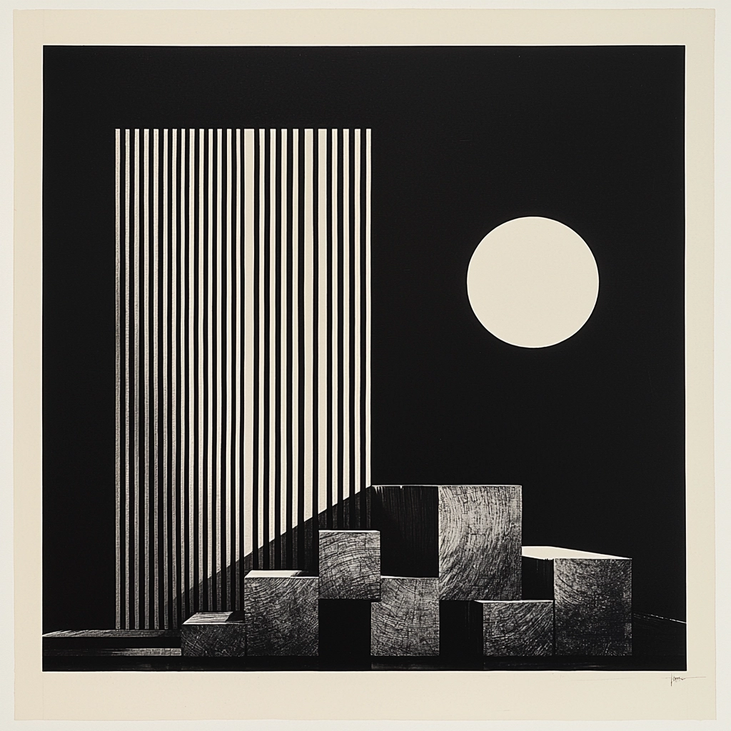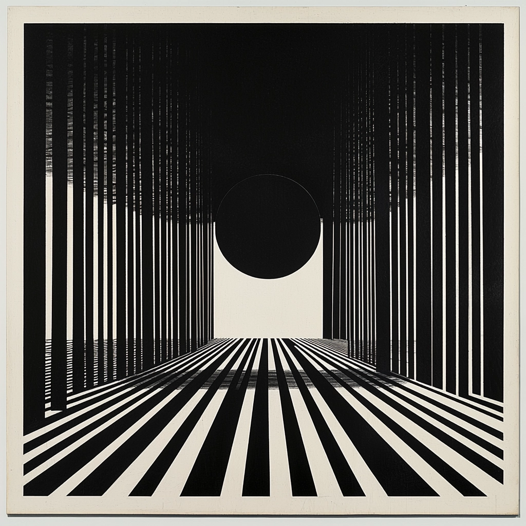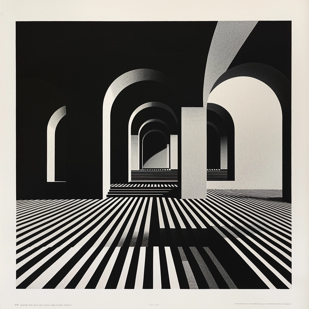 The artwork utilizes sharp contrast with high definition between black and white, creating a striking visual impact. The geometric forms are defined with precision, offering a strong sense of depth and space through linear perspective and shadow play.