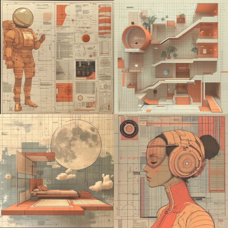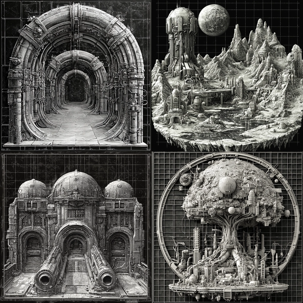 Monochrome designs featuring intricate mechanical structures.