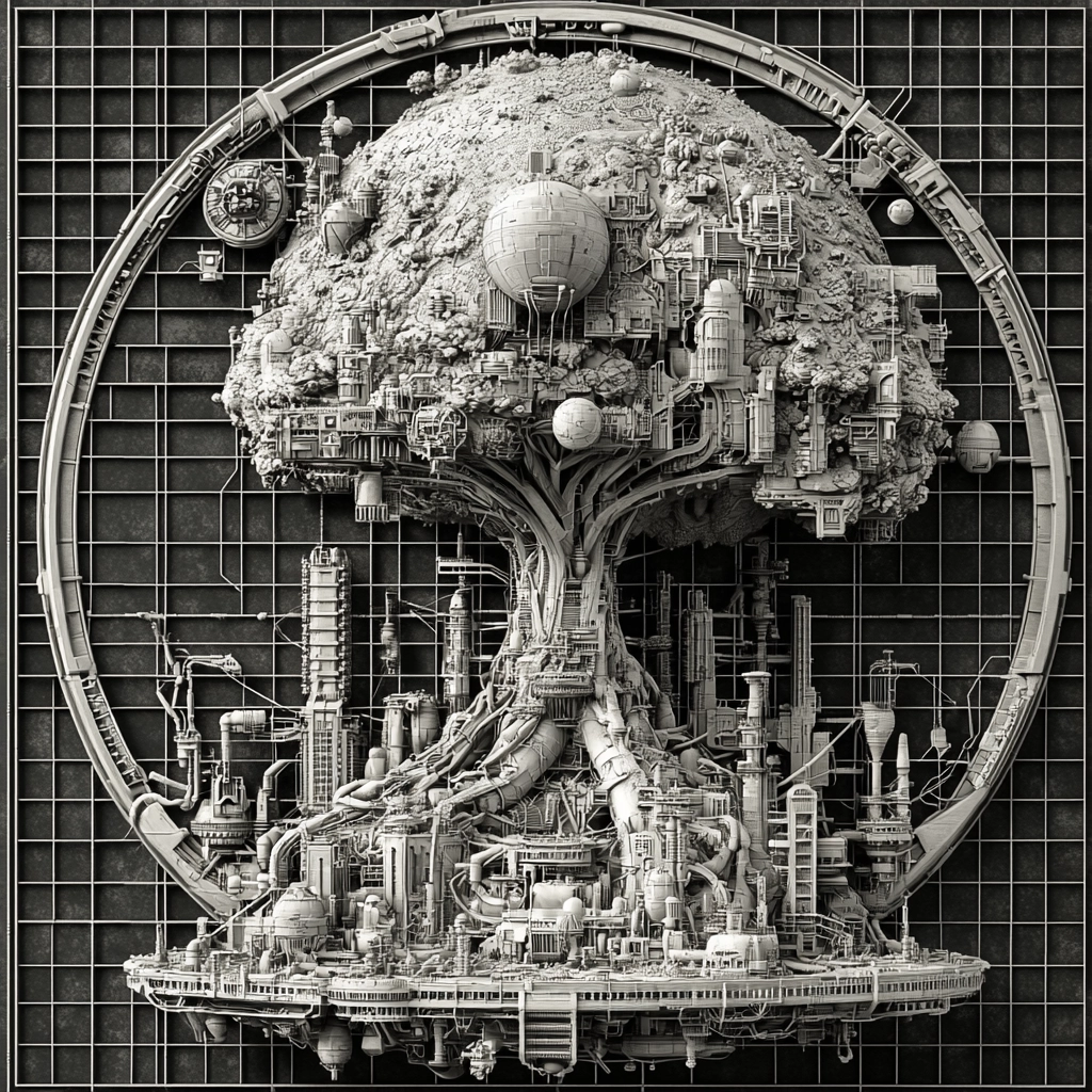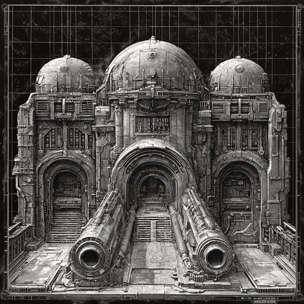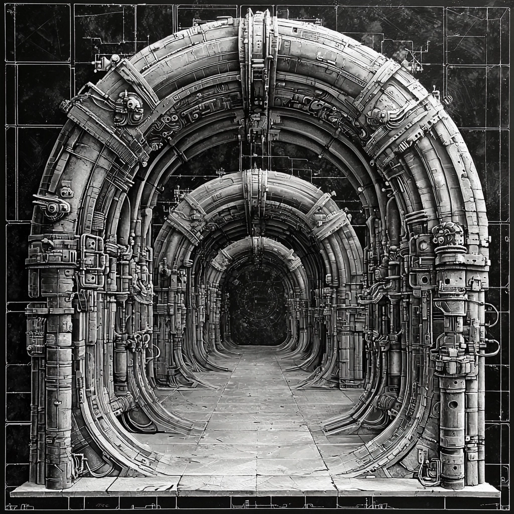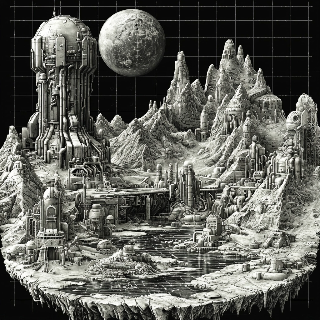 Employs high contrast lighting to emphasize detailed textures and sharp lines. Spatial arrangements create a sense of scale through layered composition and perspective. Surfaces show meticulous texture, highlighting mechanical intricacies.