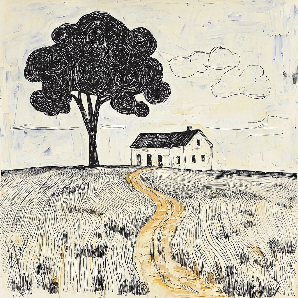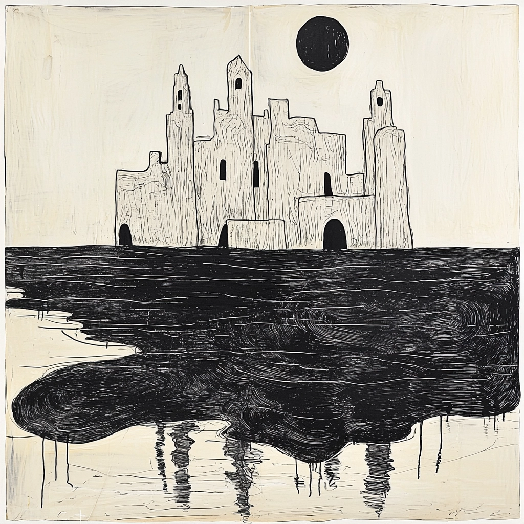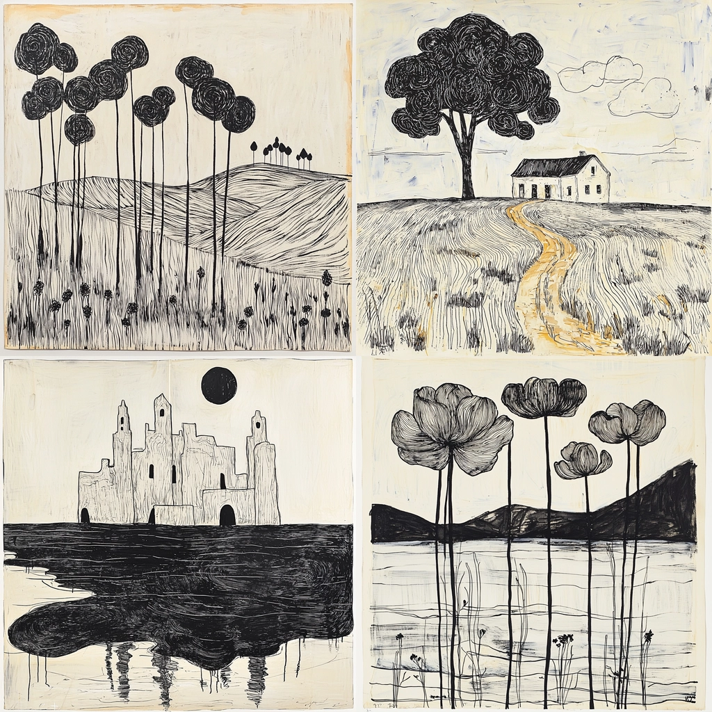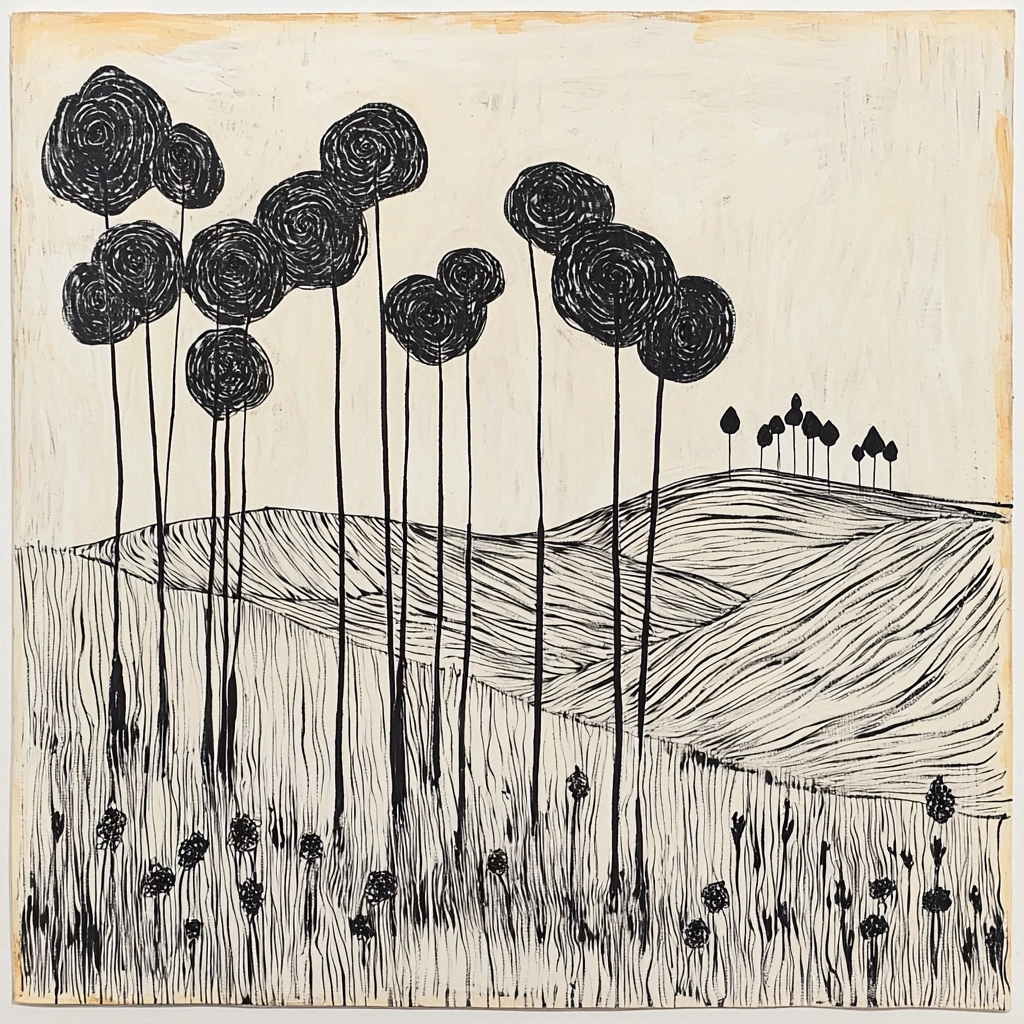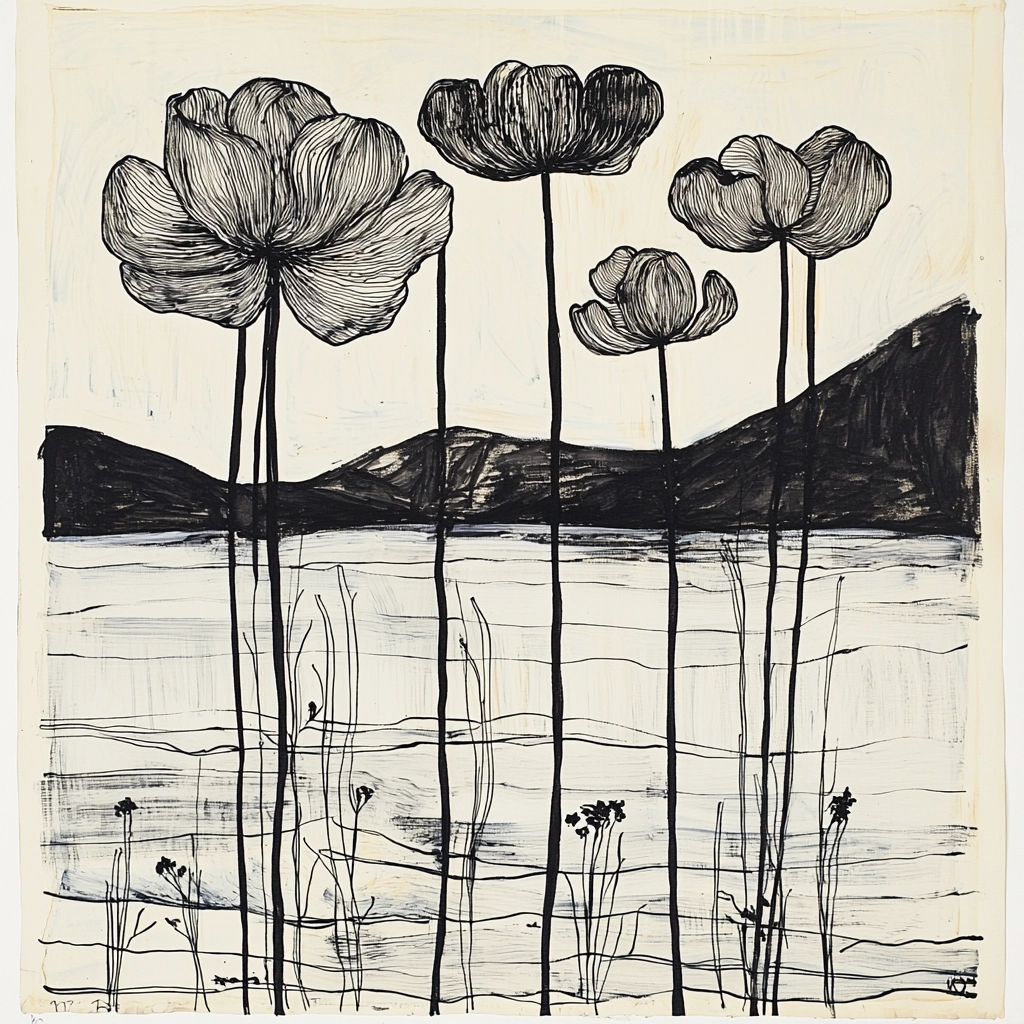 The crisp contrast between black and white achieves clarity, with fluid lines forming delicate textures and shapes. The spatial arrangement appears balanced and harmonious, providing depth without overstating elements. Each stroke contributes to an overall dynamic composition.