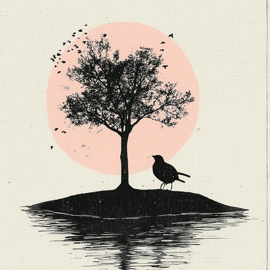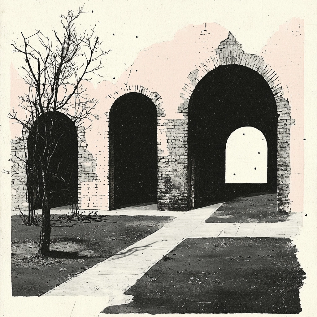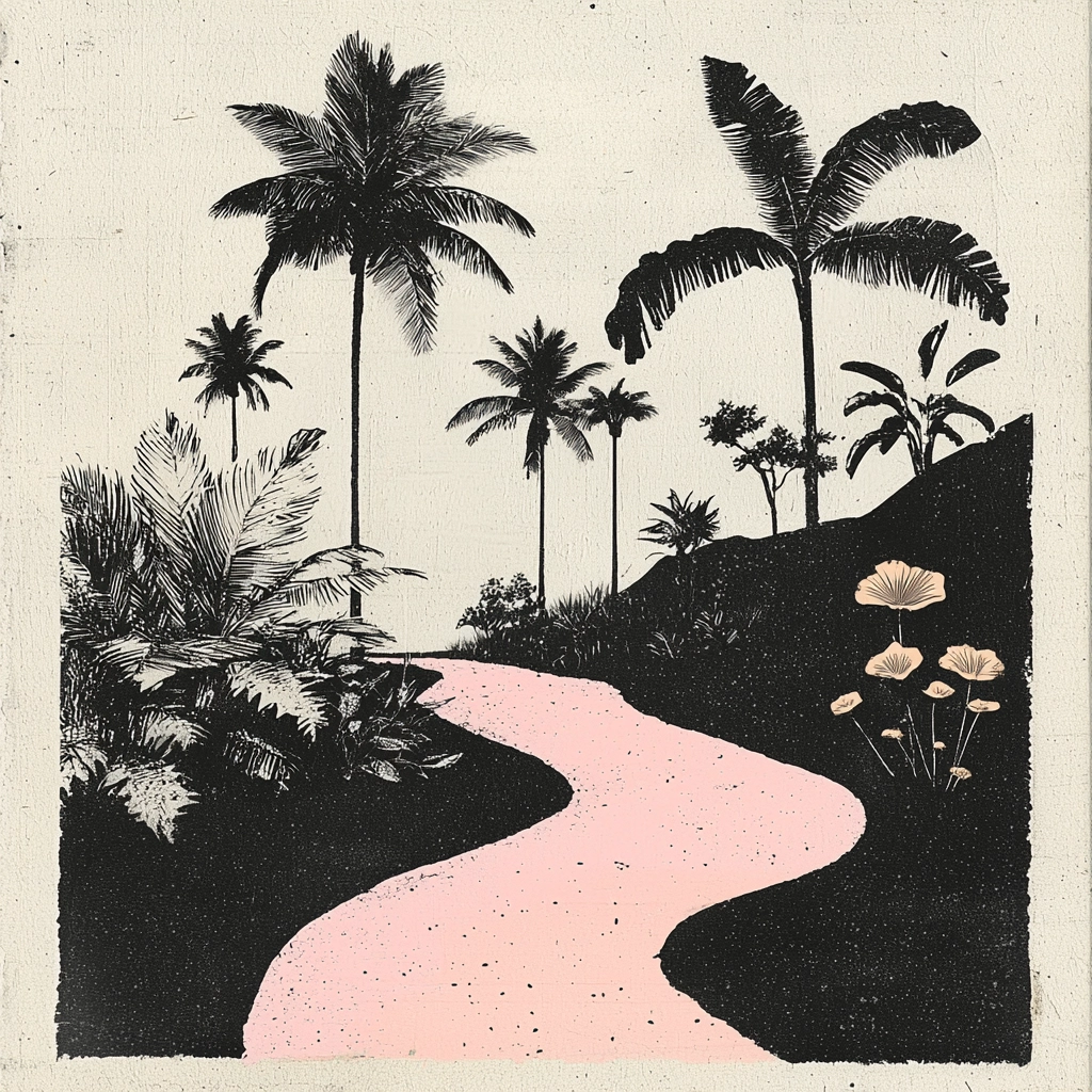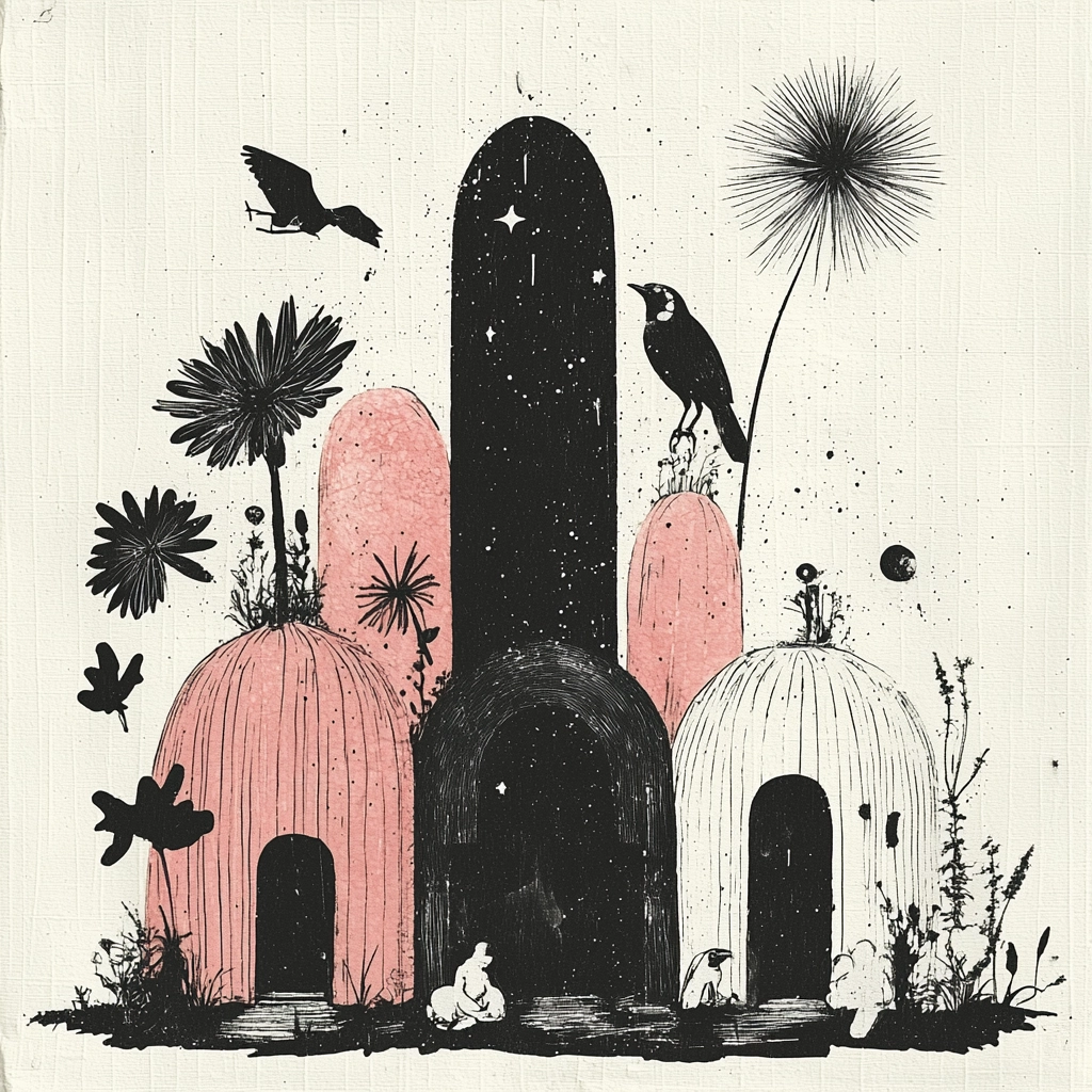 Sharp contrasts between dark and light create dynamic compositions, with areas of negative space offering balance. The pale pink accents provide warmth against the dominant black, adding a sense of depth and texture visible through the brushstrokes.