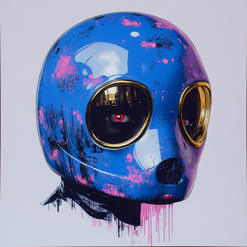 Bold color contrasts and drip painting technique prominently feature blue, gold, and pink tones.