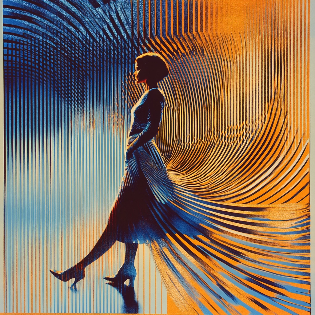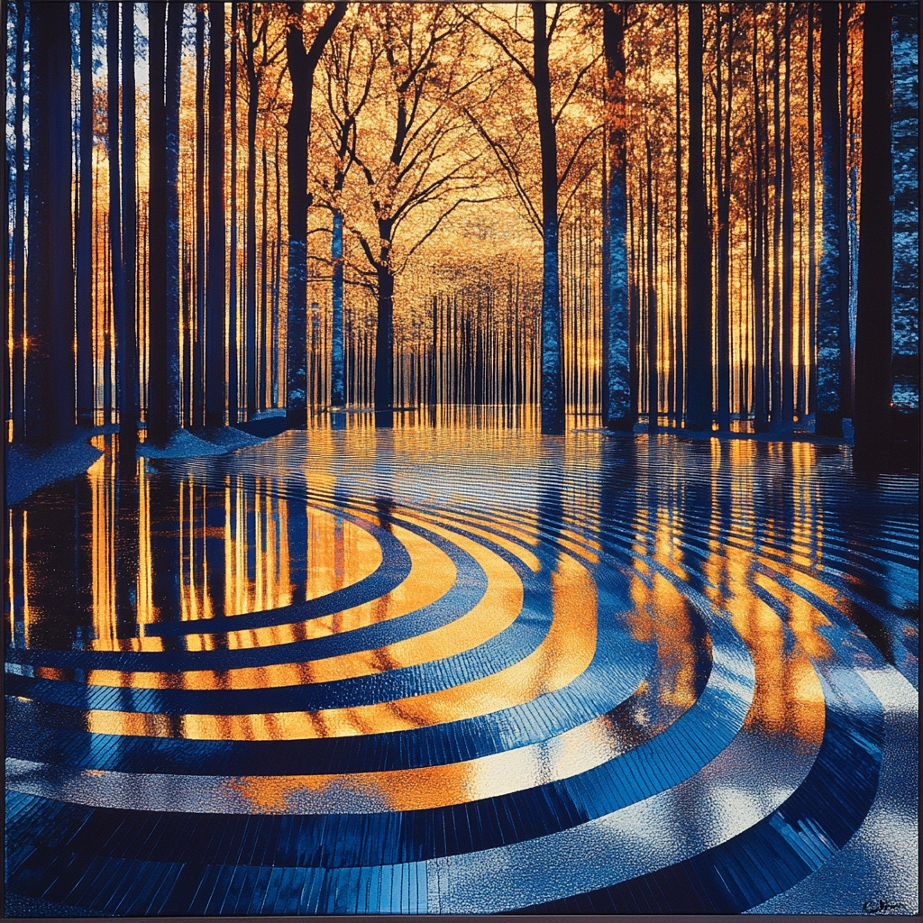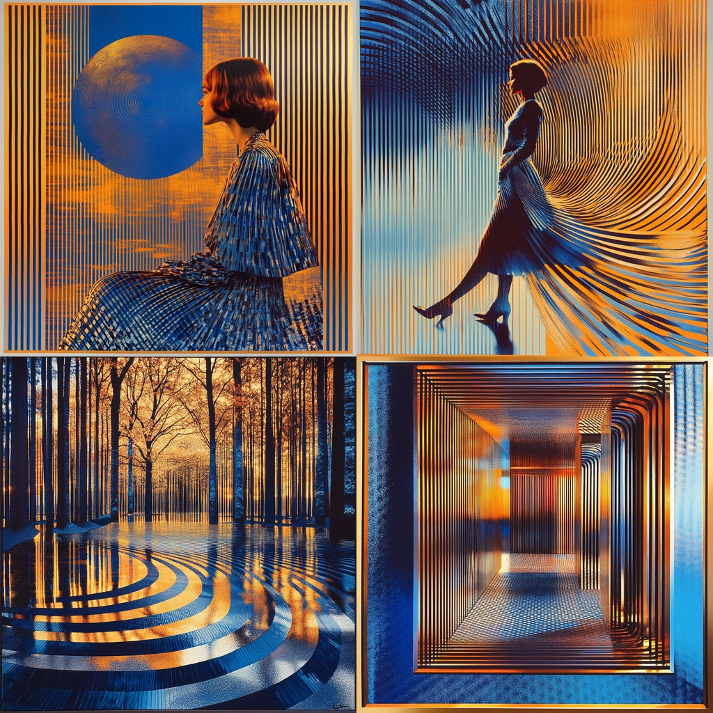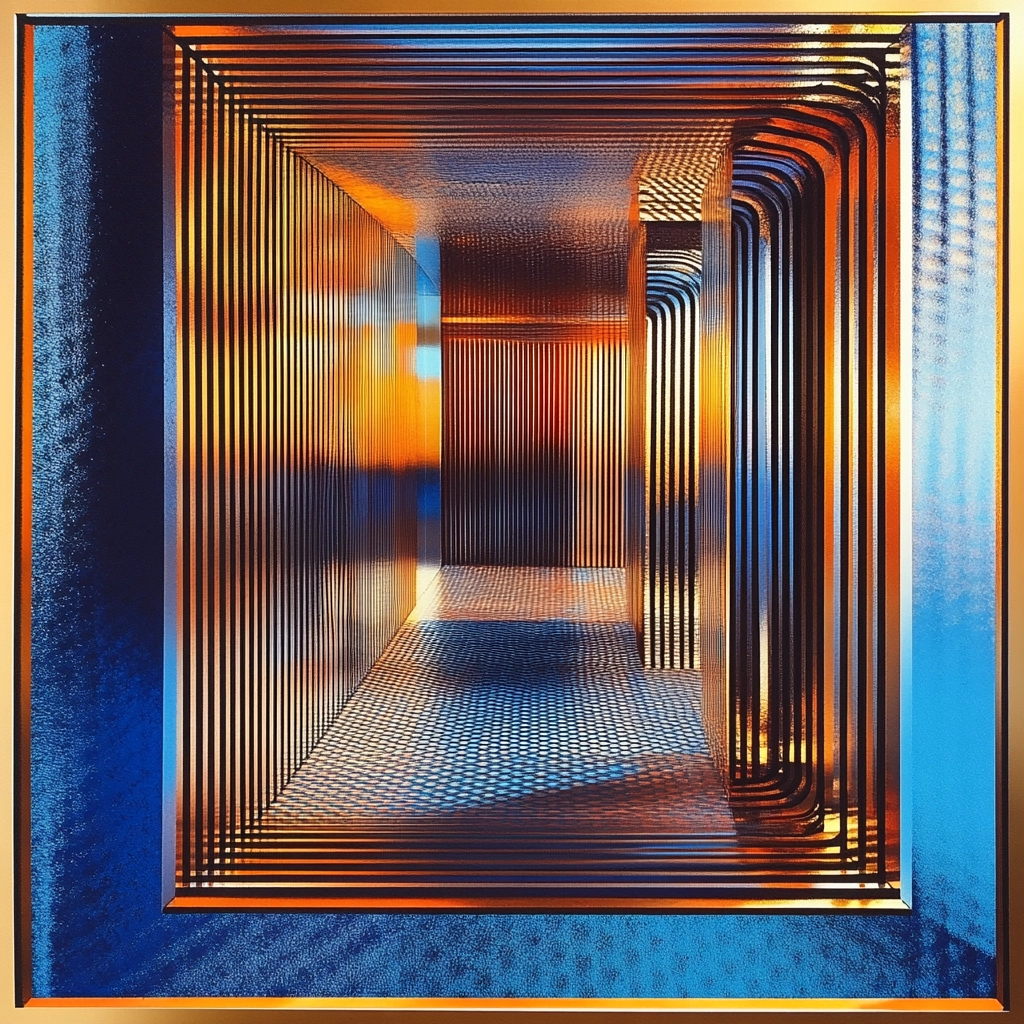 The lighting effects highlight the interplay of blue and gold, creating a sense of depth and movement. The textures are smooth and reflective, with spatial elements that guide the viewer's eye through linear patterns.