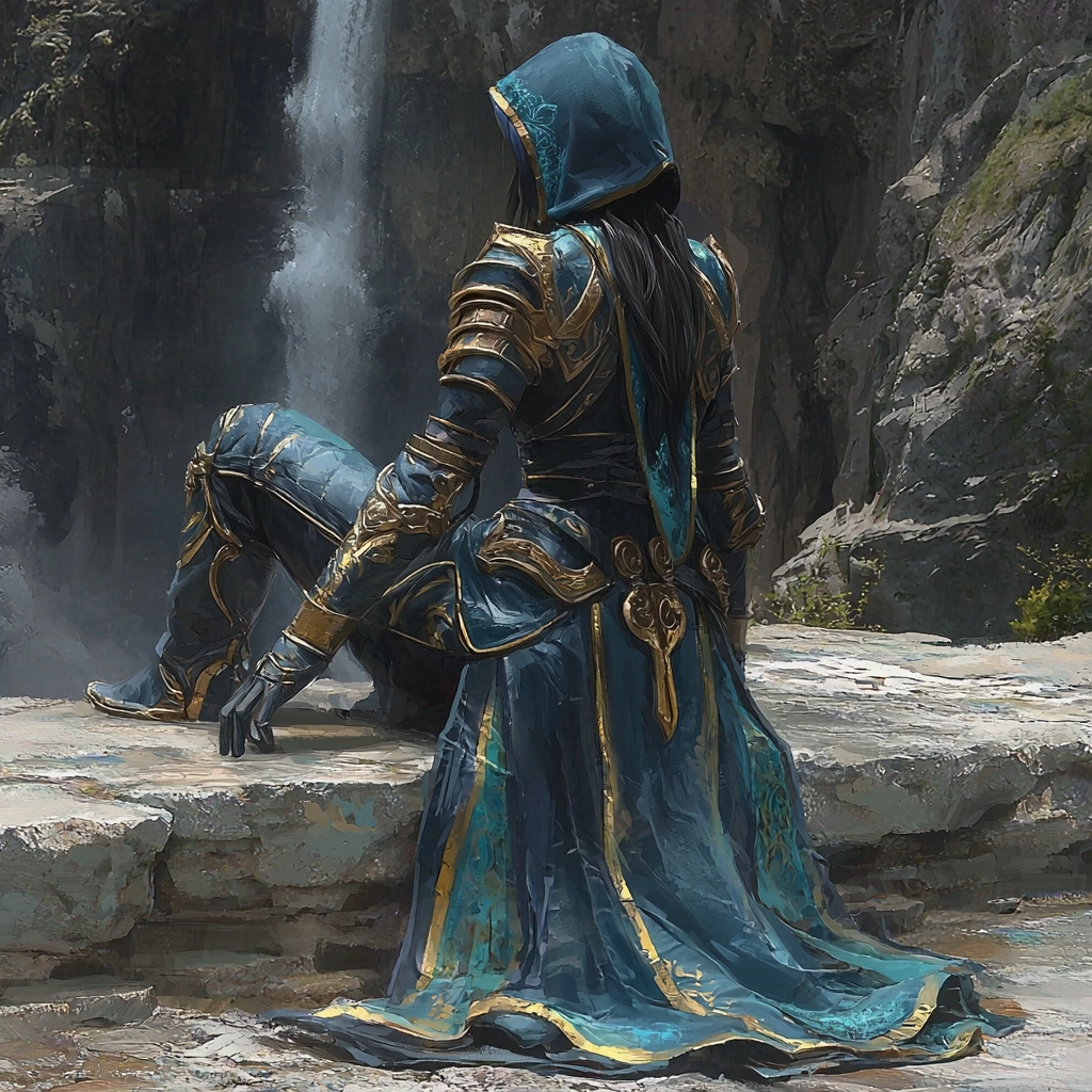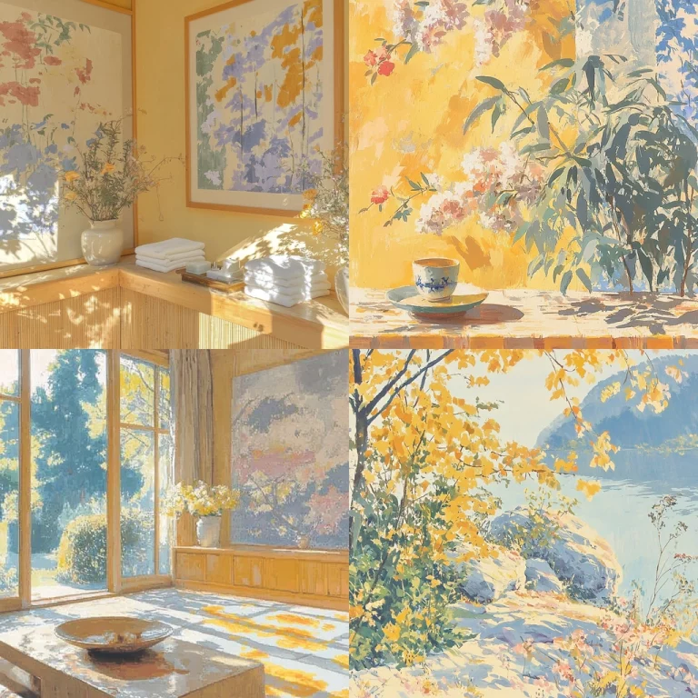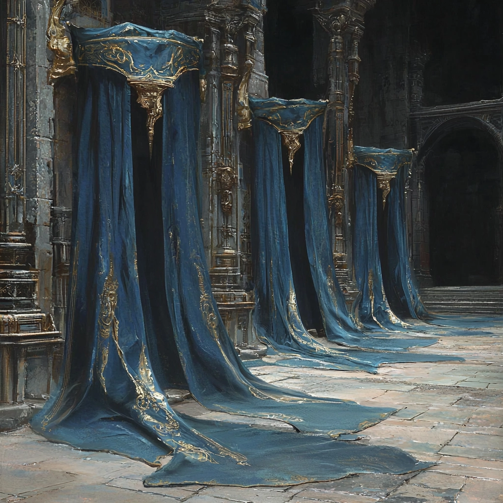 Light effects highlight golden accents creating a luminous contrast to the deep blue hues. The texture is carefully rendered, showcasing a fine balance between smooth surfaces and intricate detailing. The spatial arrangement suggests depth and perspective through subtle shading.