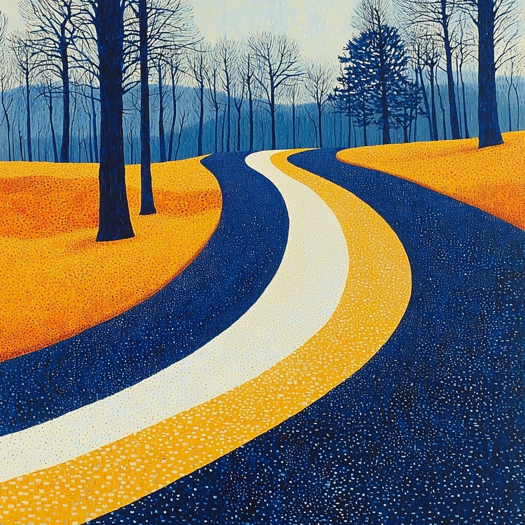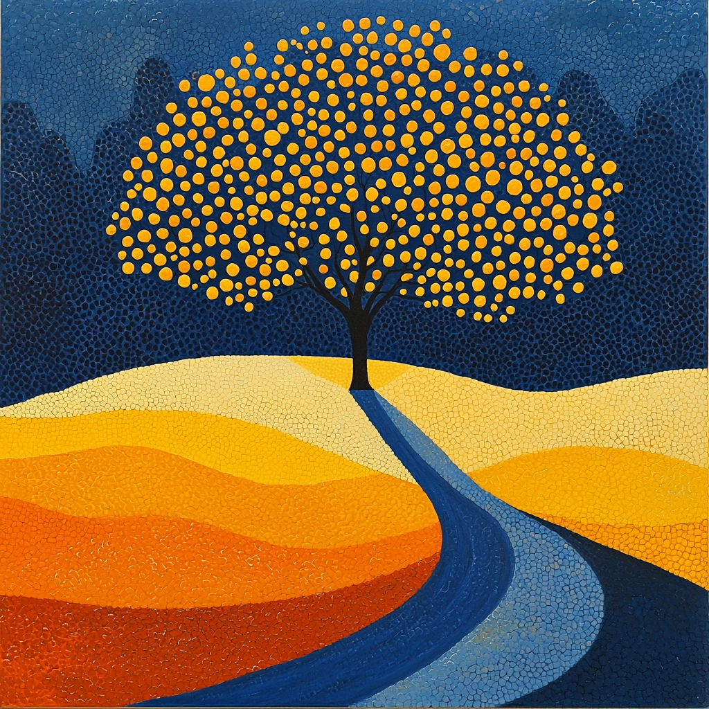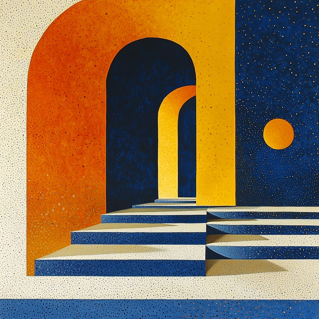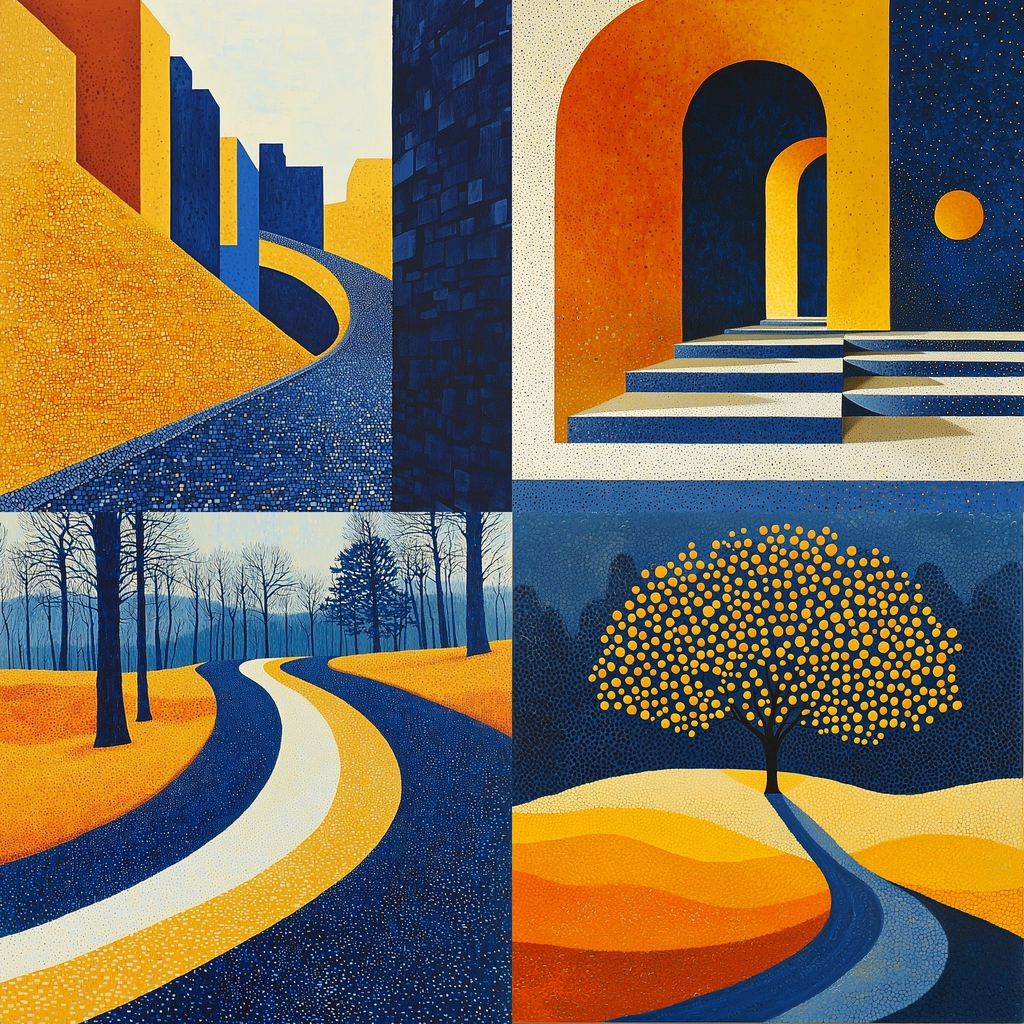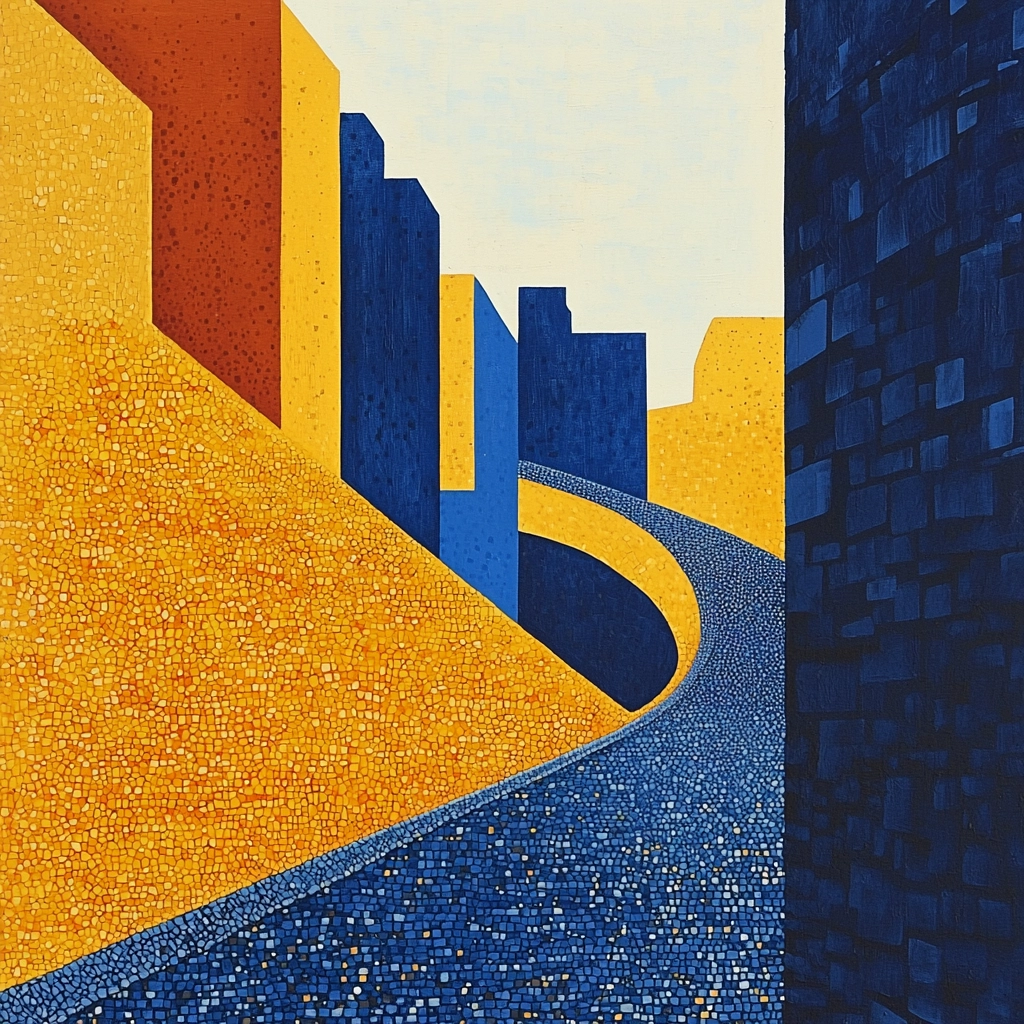 Vivid use of geometric shapes and contrasting hues evokes visual dynamism.