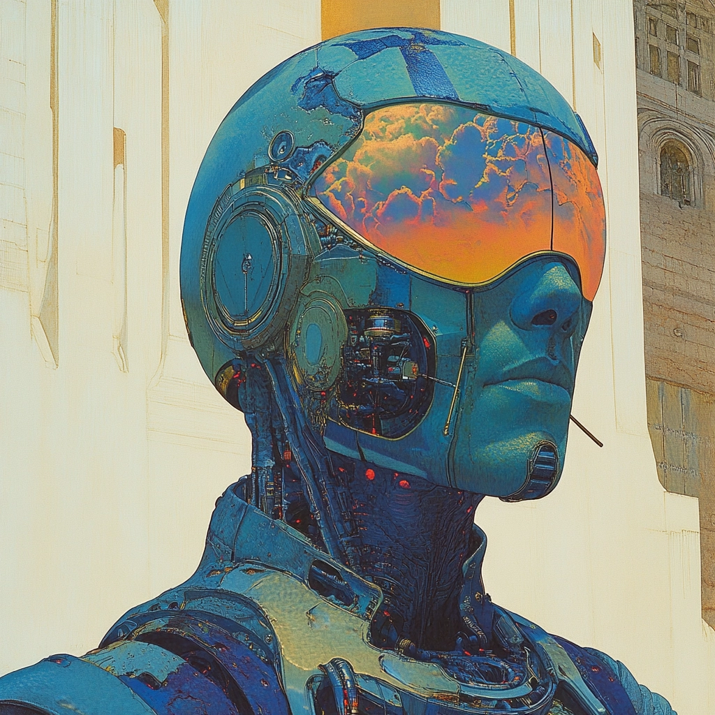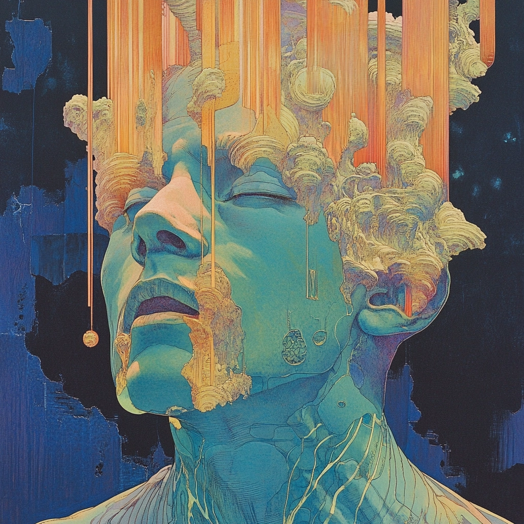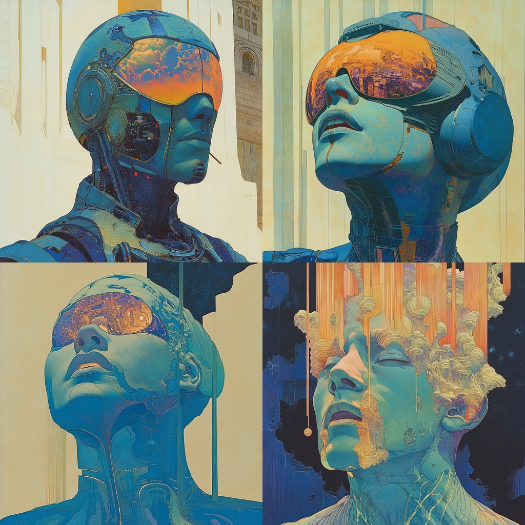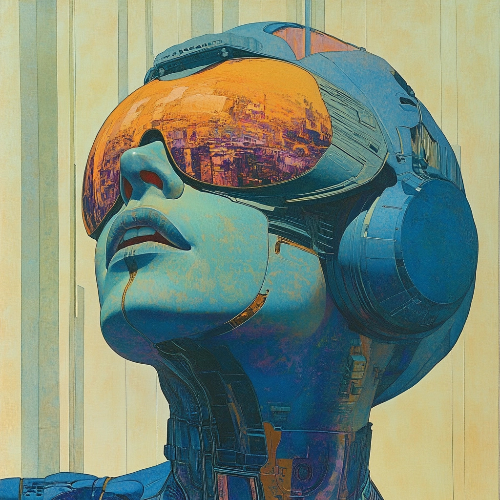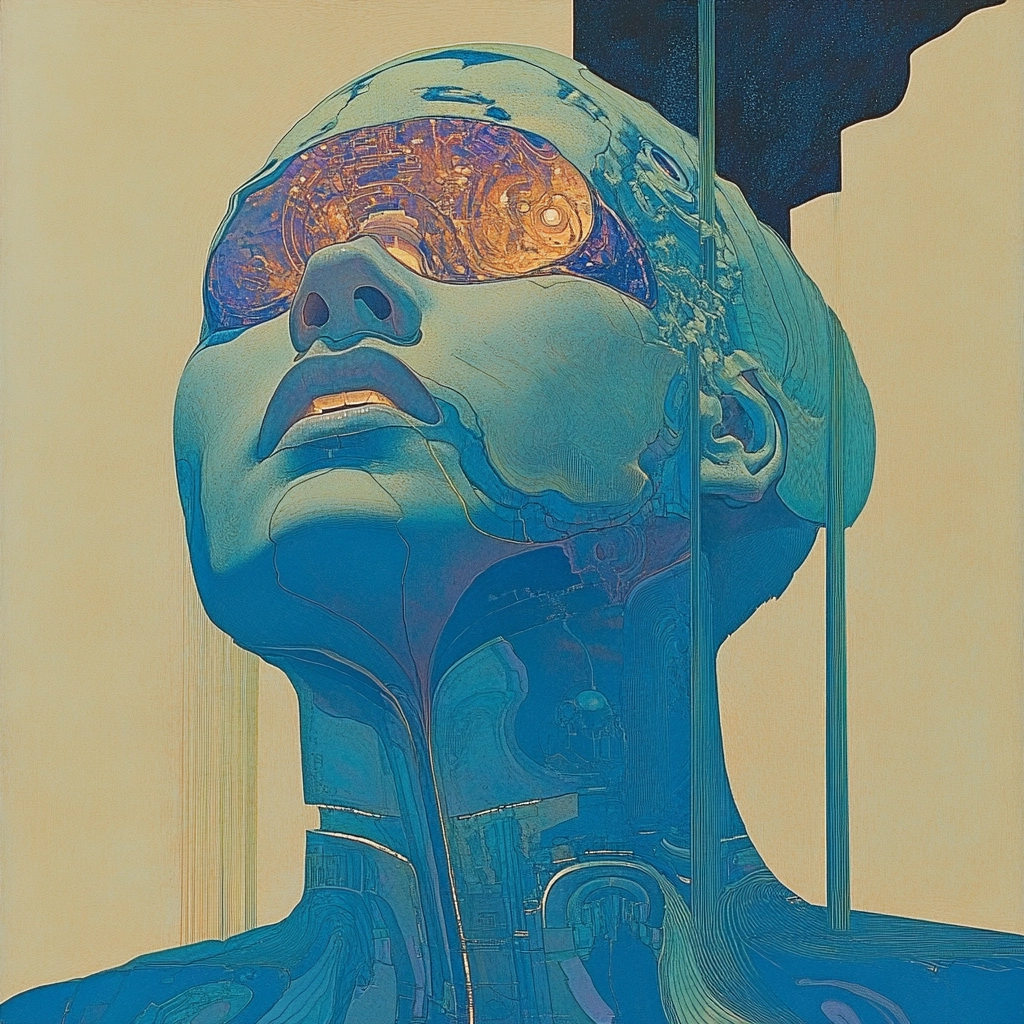 The lighting casts dramatic shadows enhancing the depth and contours, while the dominant blue and cyan tones create a cohesive spatial consistency. Texture is refined and detailed, conveying a sleek, almost ethereal quality throughout the visual field.