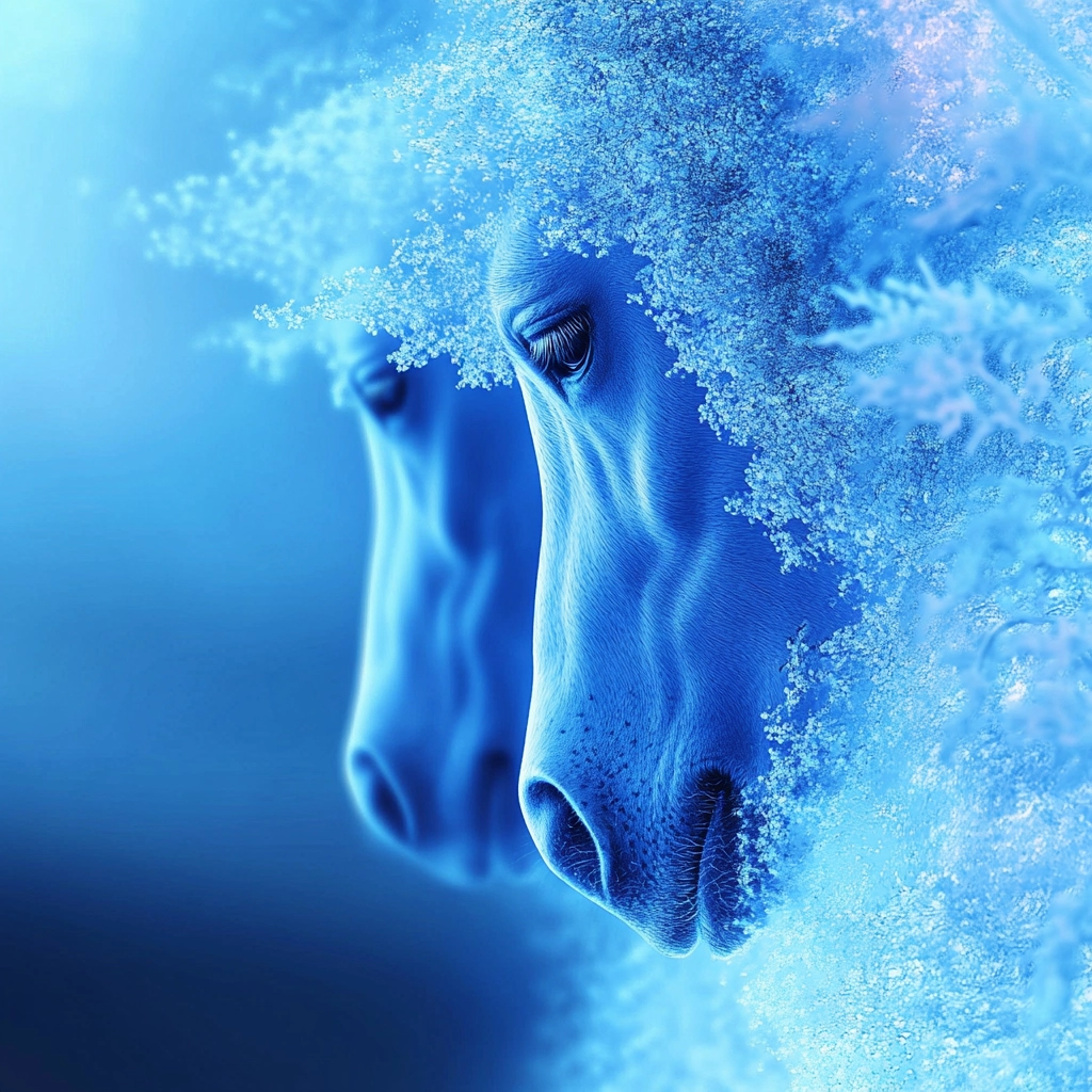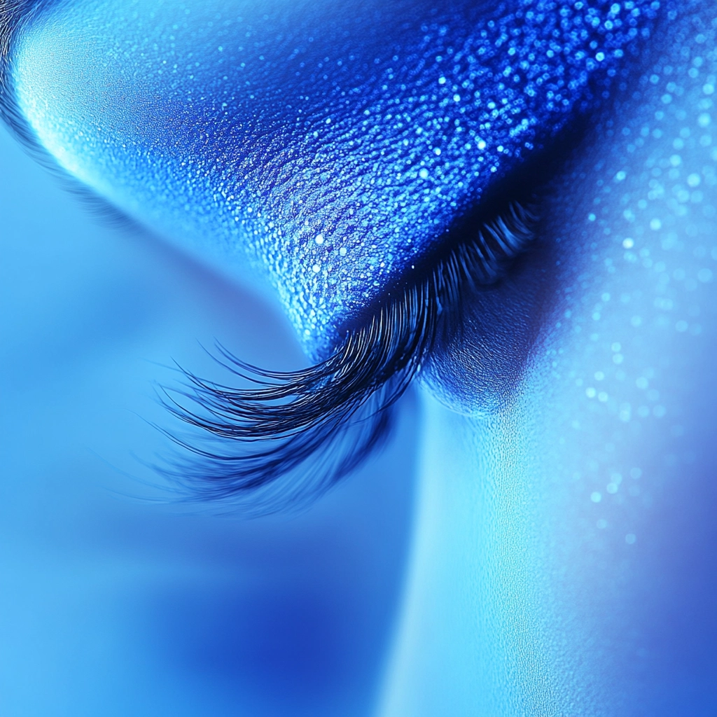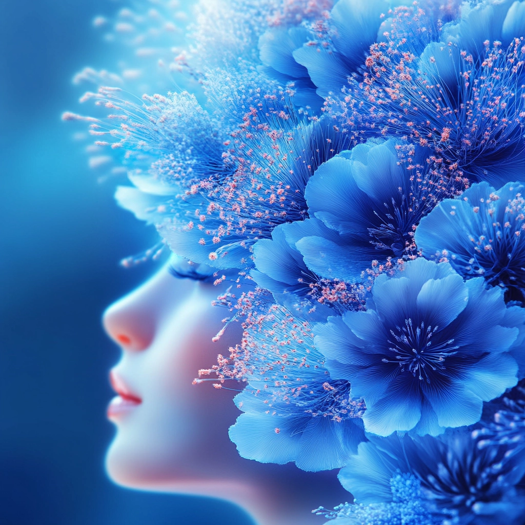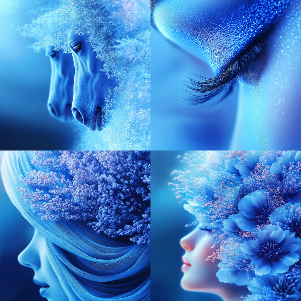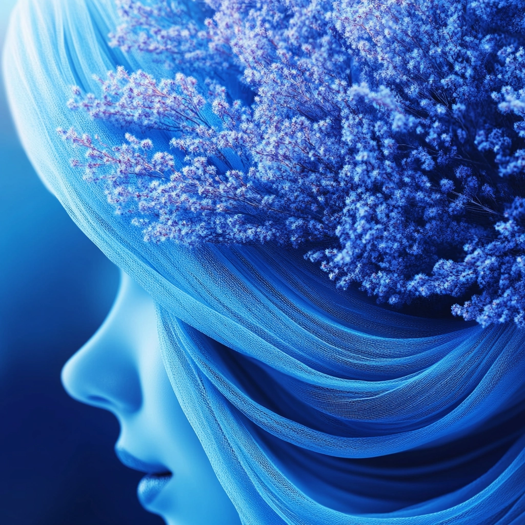 The artwork is characterized by soft lighting effects that highlight intricate textural details, with dominant blue hues blending into subtle purples. The spatial arrangement presents a seamless flow, supported by smooth gradients and detailed textures that provide a tactile depth.