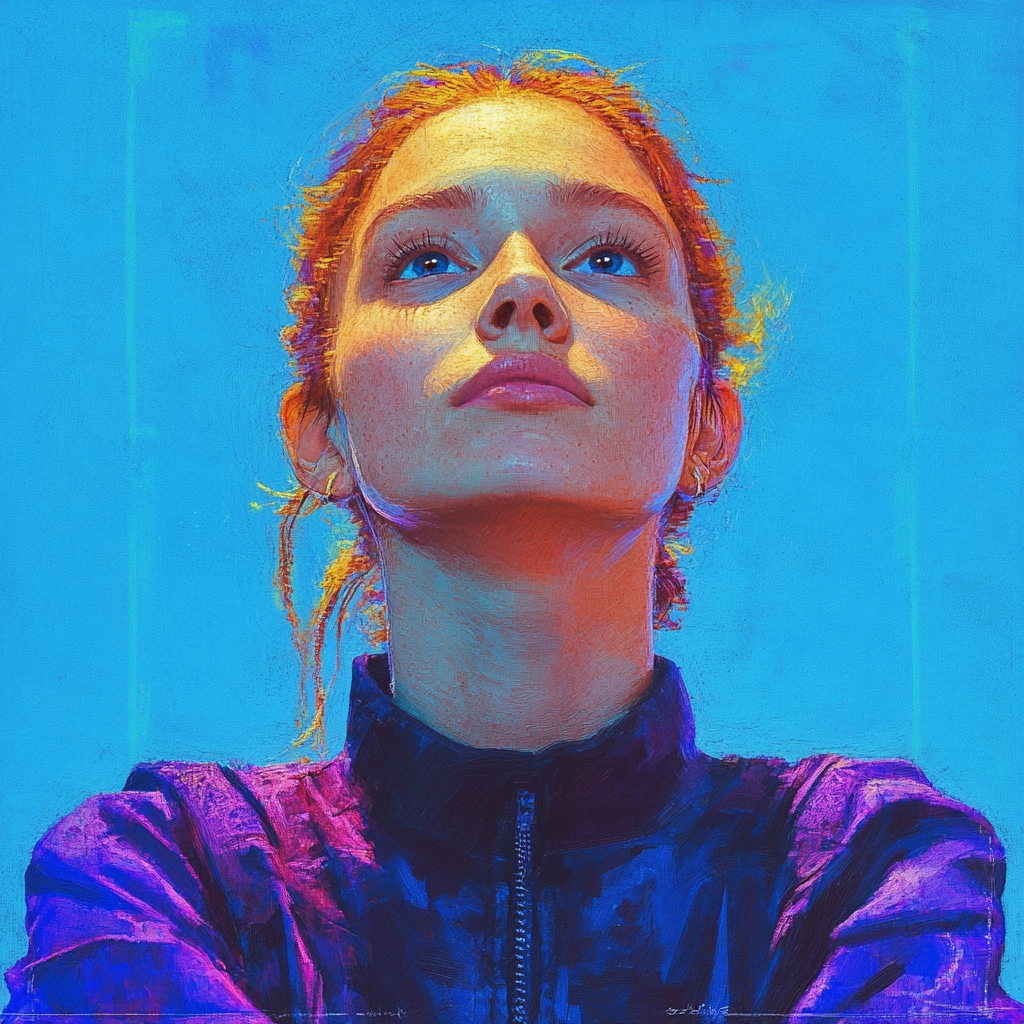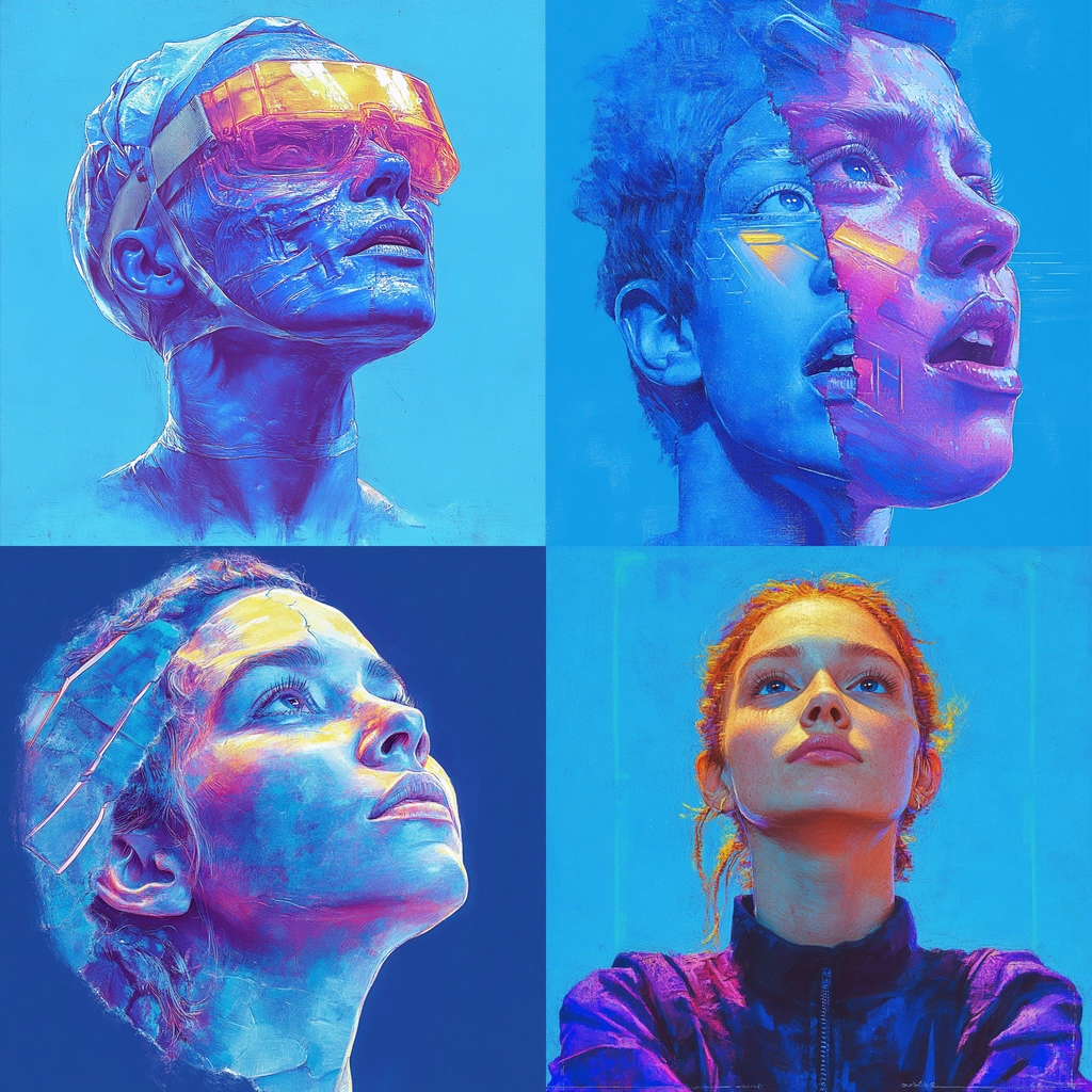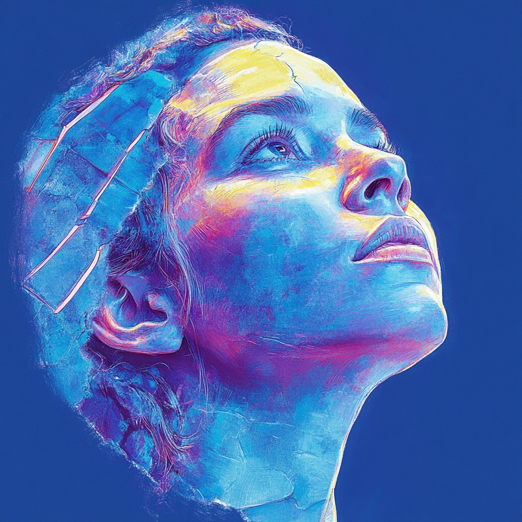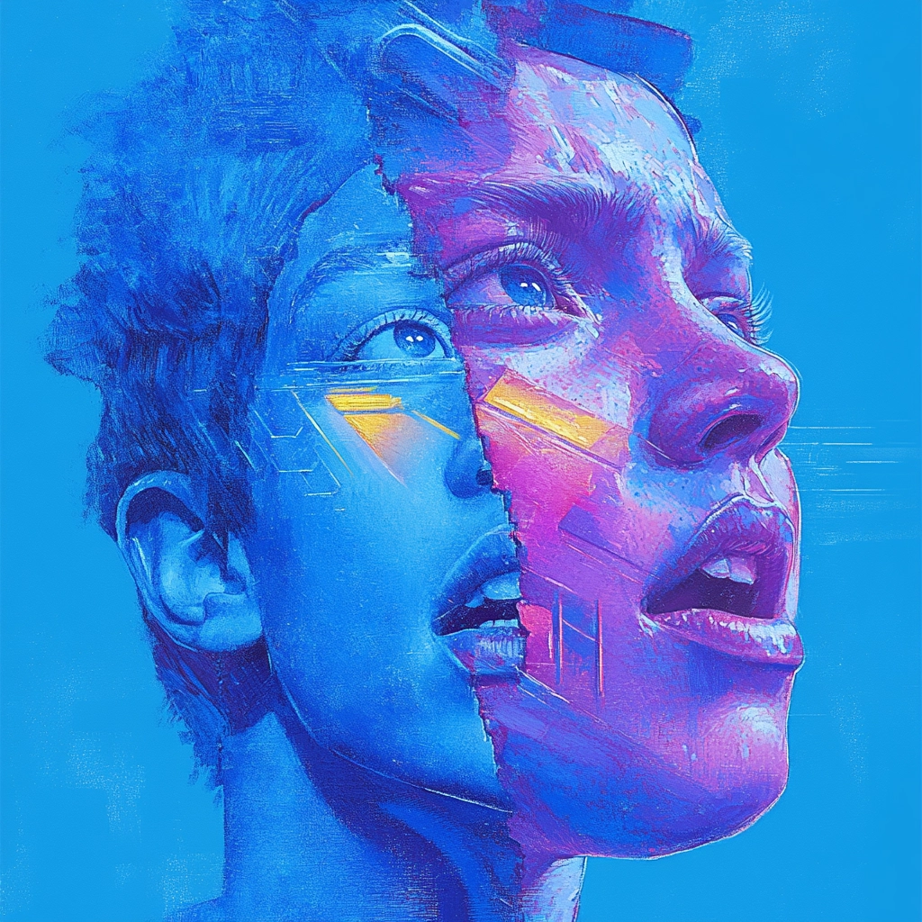 The artwork utilizes a gradient lighting effect that transitions from deep blue to lighter hues, incorporating subtle touches of purple and orange. There is a strong sense of spatial depth created through the interplay of color and texture, providing dynamic visual interest.