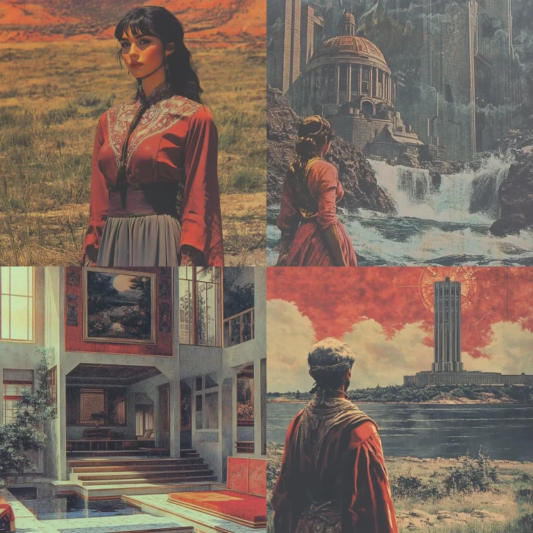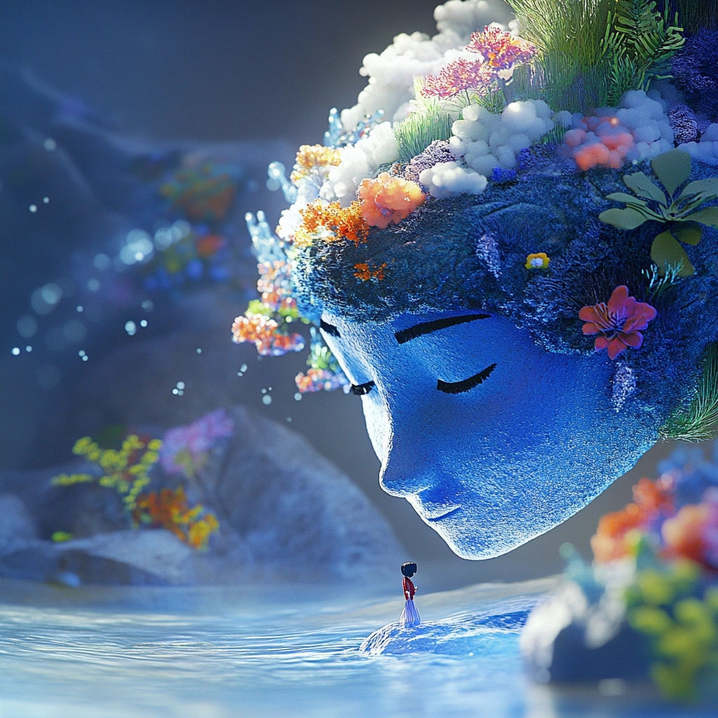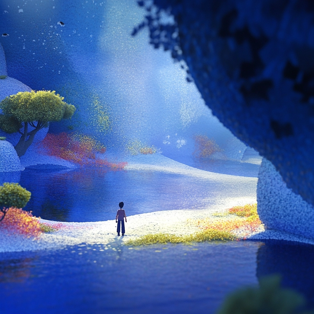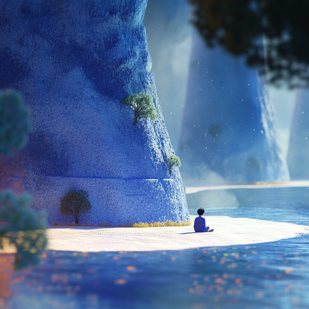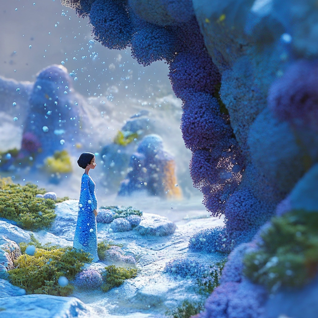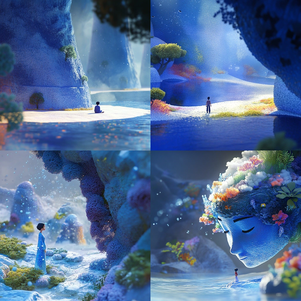 Illuminated by glowing light, the compositions use rich blue hues complemented by white and green, creating a deep spatial atmosphere with varied texture across surfaces.