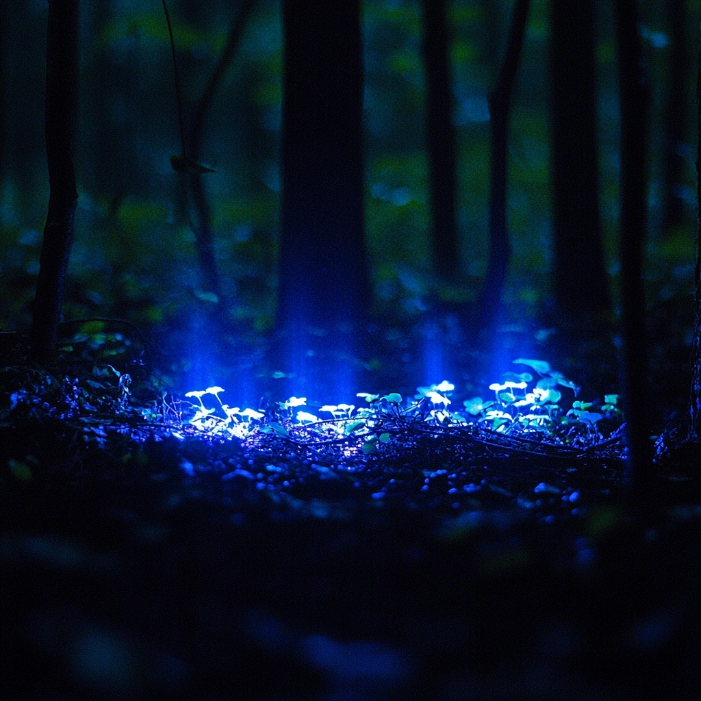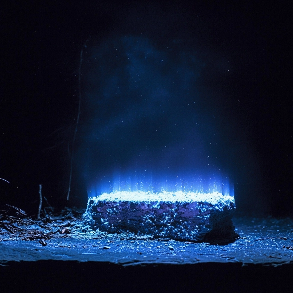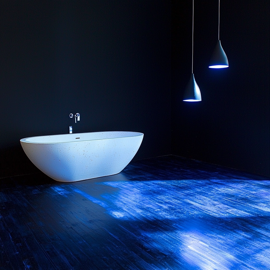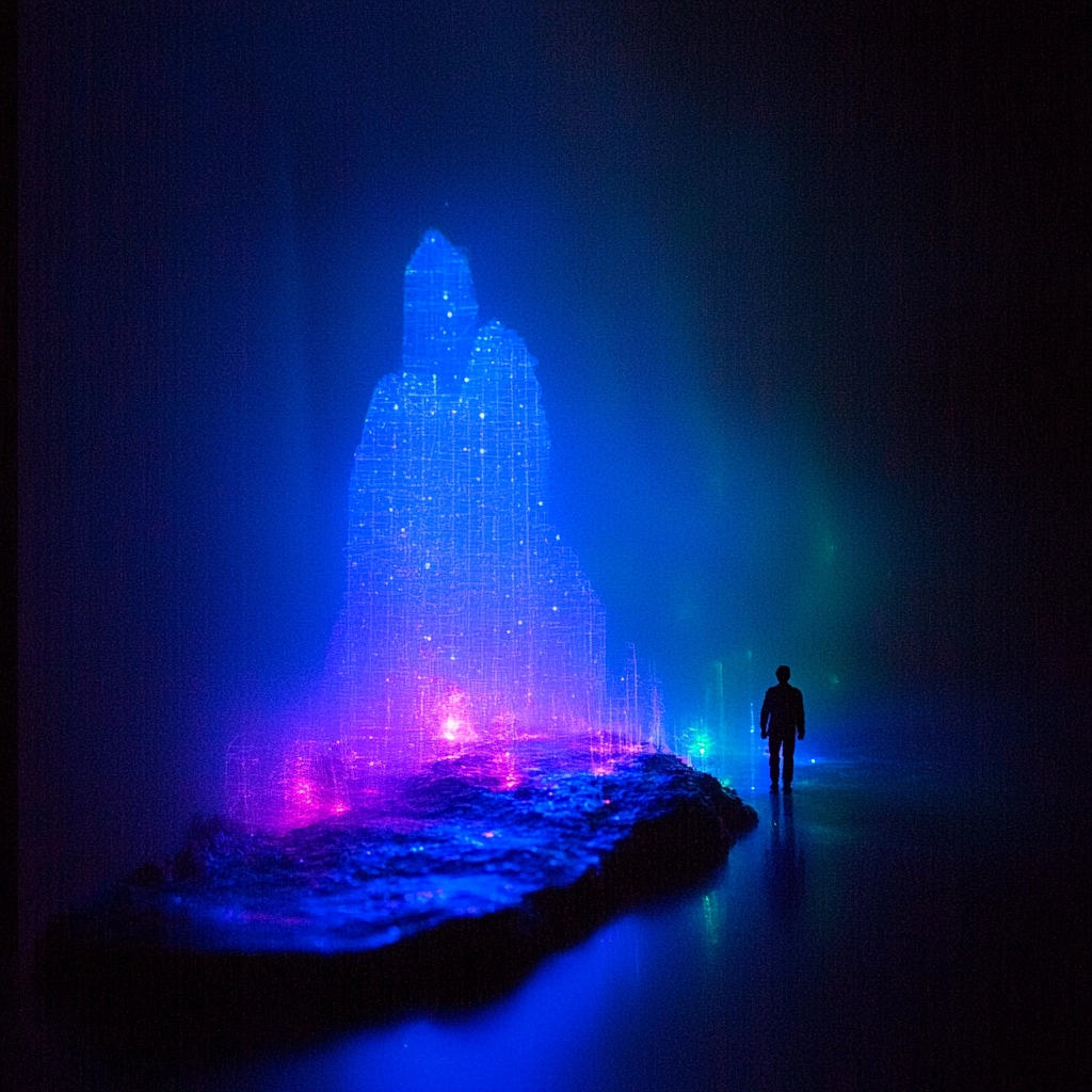 The luminescent quality of the neon light is enhanced by sharp contrast against deep shadows, creating a striking illumination that shapes spatial perception. This interplay results in vibrant color transitions and textures that suggest slick surfaces.