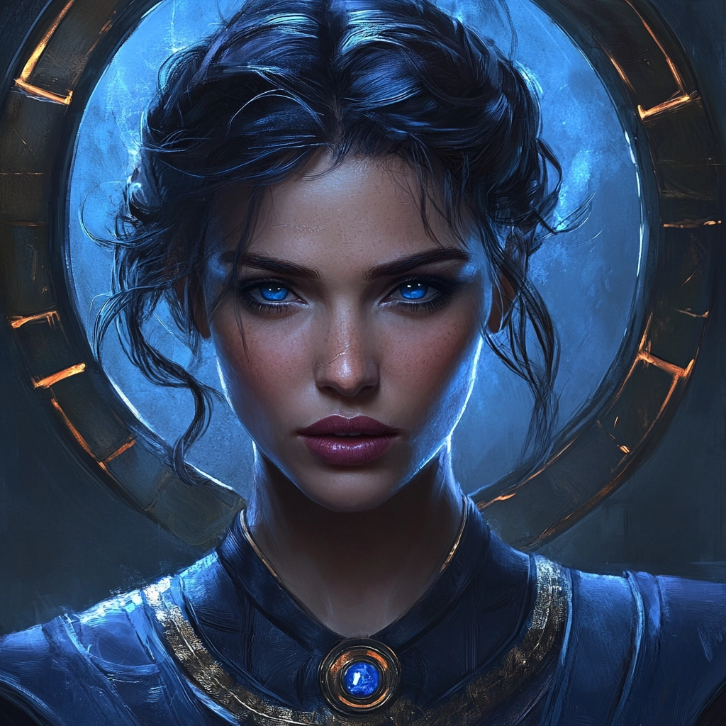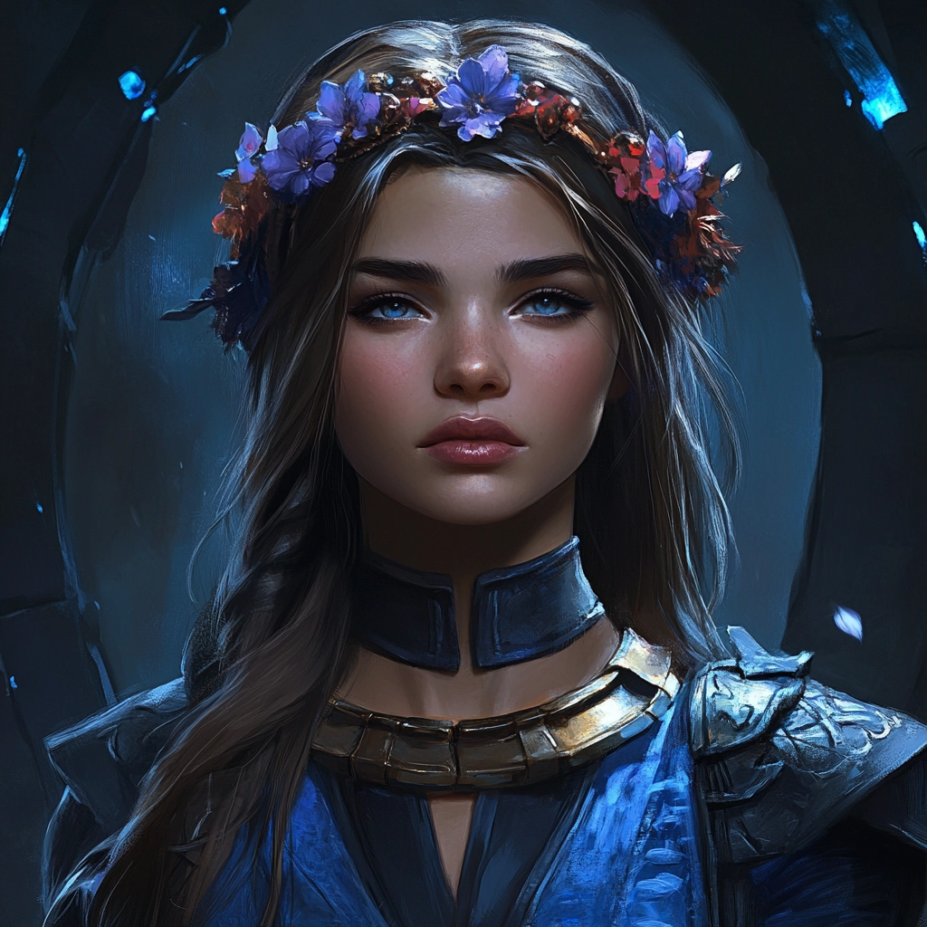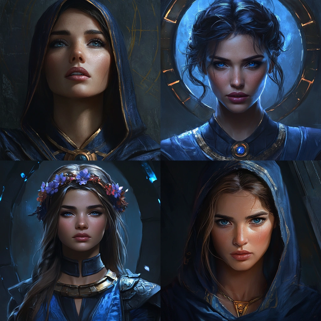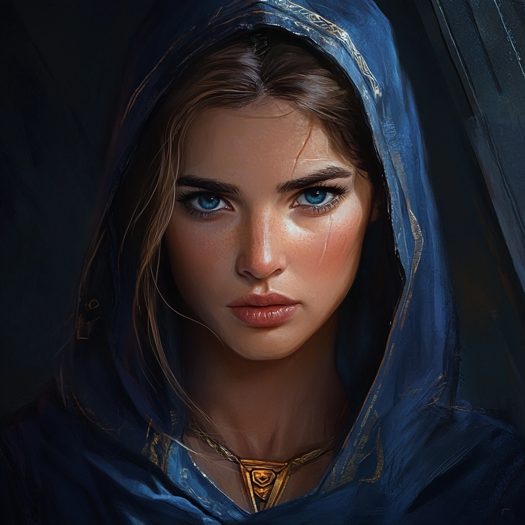 The use of blue and gold highlights creates elaborate textures with a focus on lighting around the central figures.