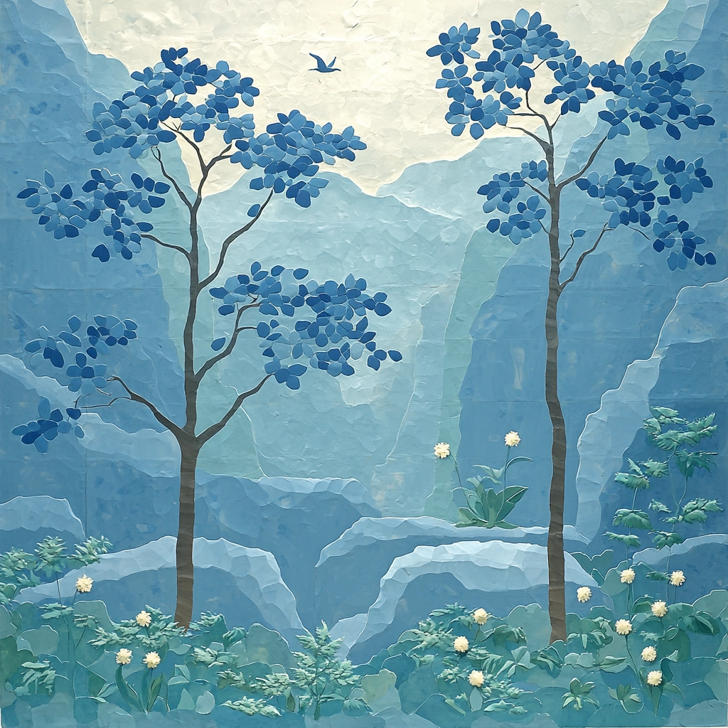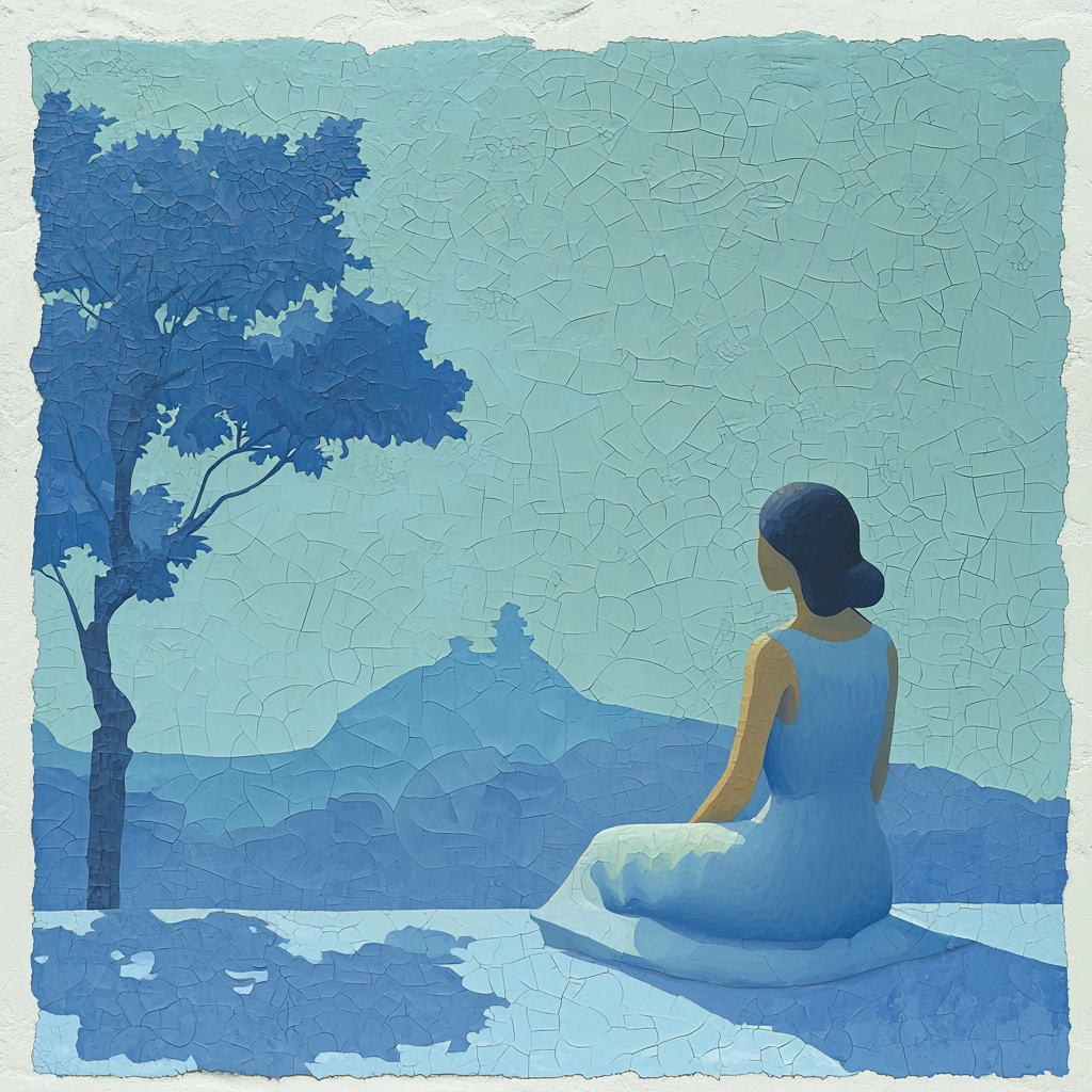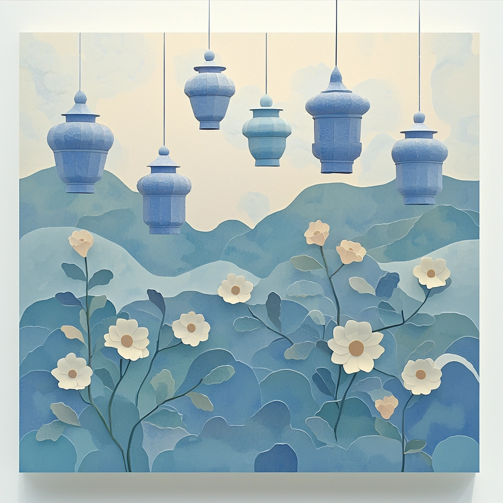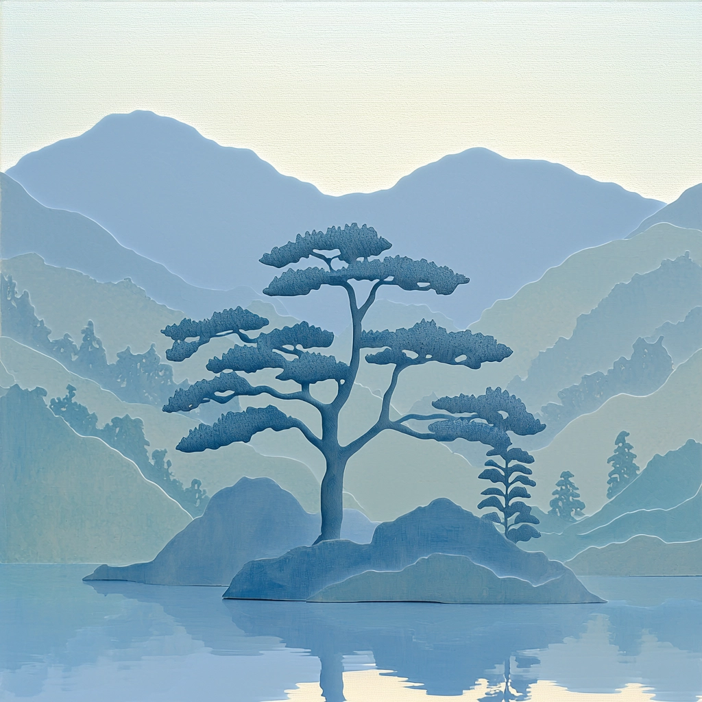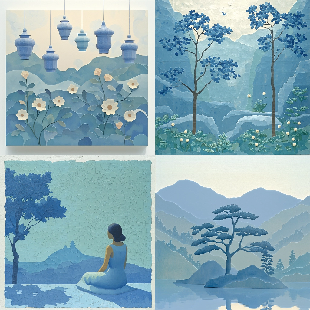 The lighting is gentle, revealing nuanced hues of blue that evoke a sense of depth and tranquility. Textures appear smooth and flowing, enhancing the visual serenity with soft gradients and understated contrast against softly detailed elements.