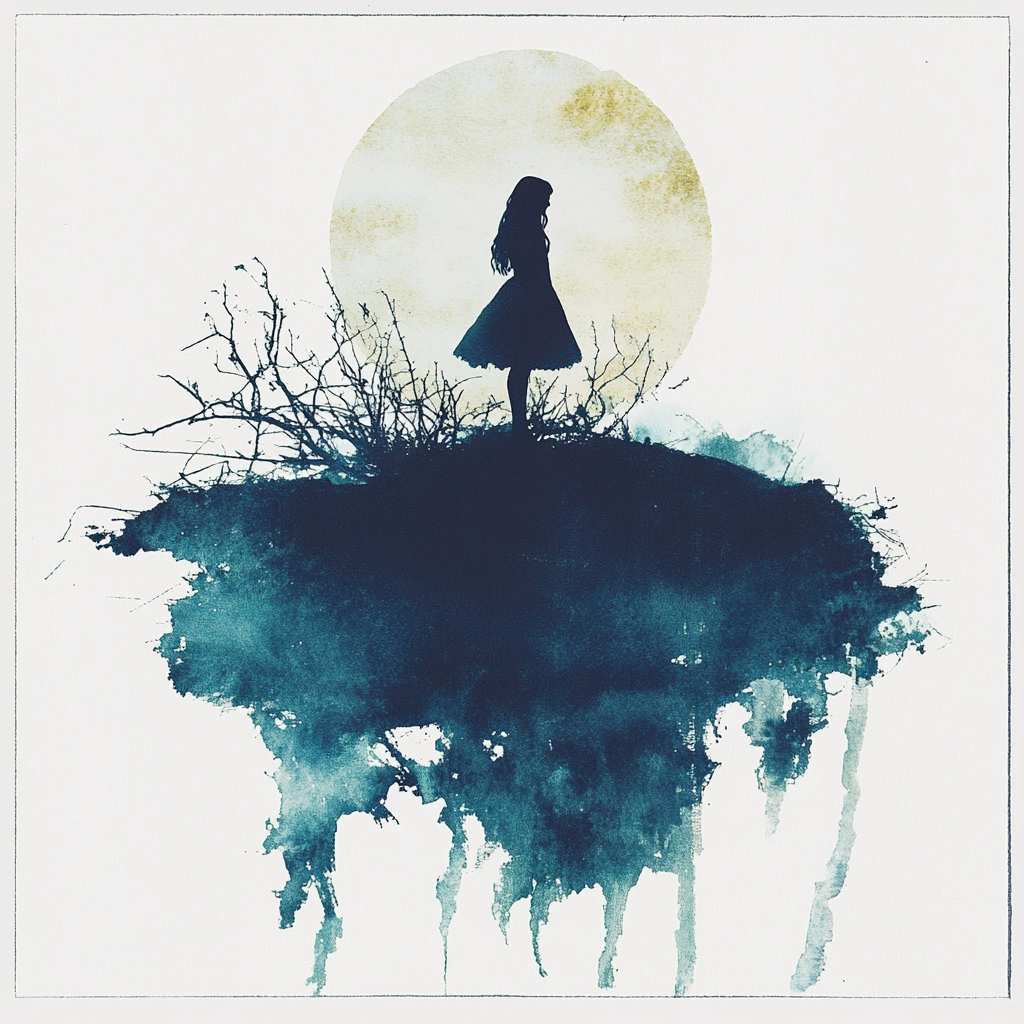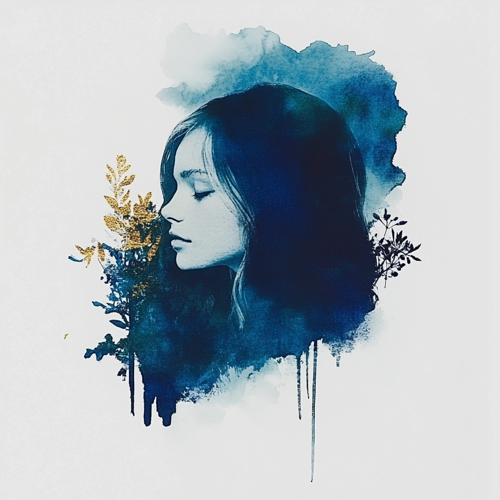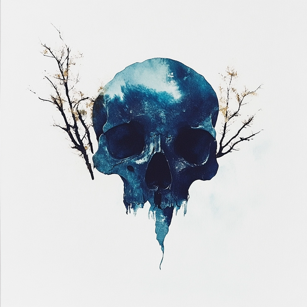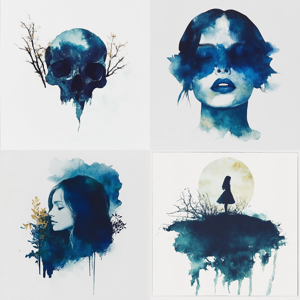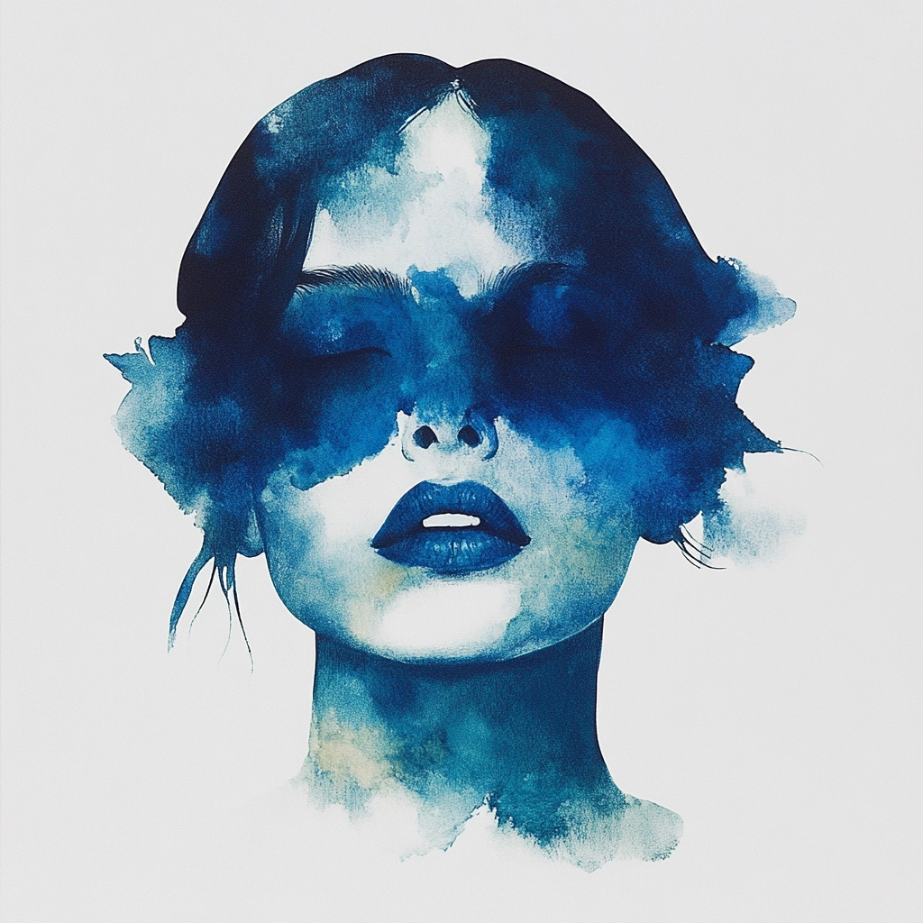 Delicate watercolor strokes with a fluid drip effect and minimal color palette emphasize stark contrast and negative space.