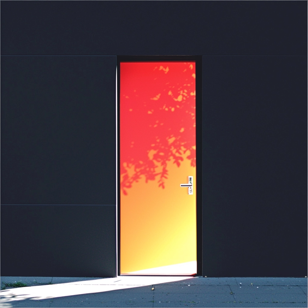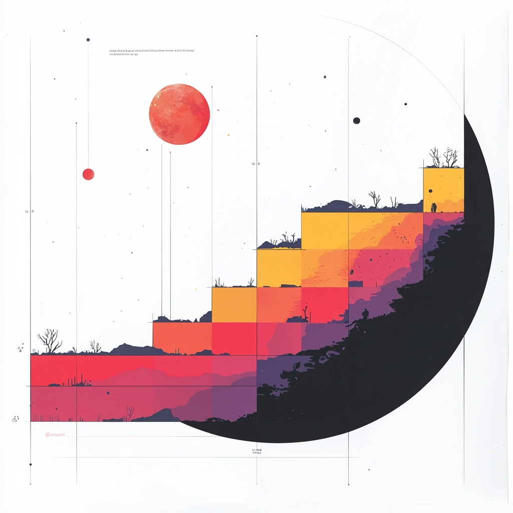 Dynamic lighting and smooth gradients enhance the spatial depth within geometric forms, while a contrast between dark and bright colors creates impactful visual harmony. The textures are flat, emphasizing the bold blocks of color.