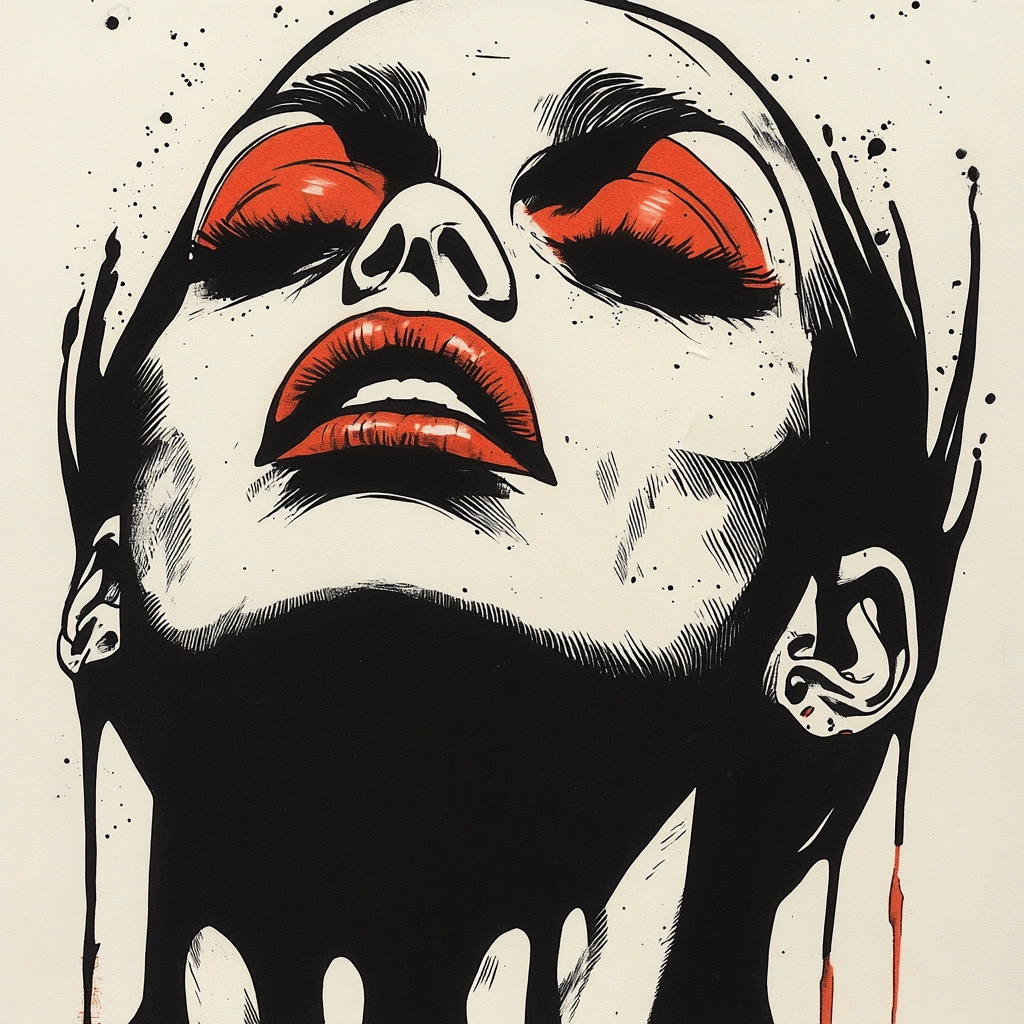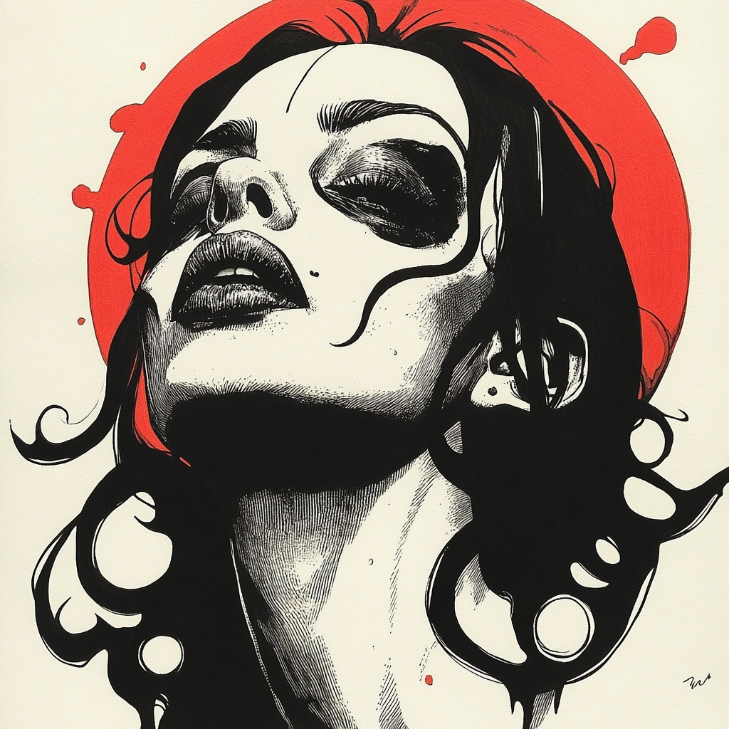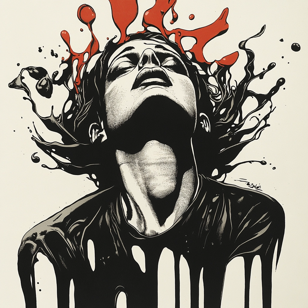 The use of intense black shapes with striking red accents creates a vivid contrast against white space, highlighting dynamic forms. The composition cleverly balances solid and fluid textures, enhancing visual drama with a strong sense of movement.