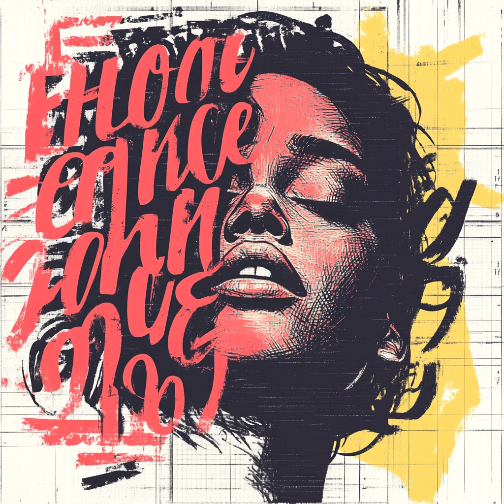 Vivid and dynamic composition using bold typography and expressive brushstrokes.