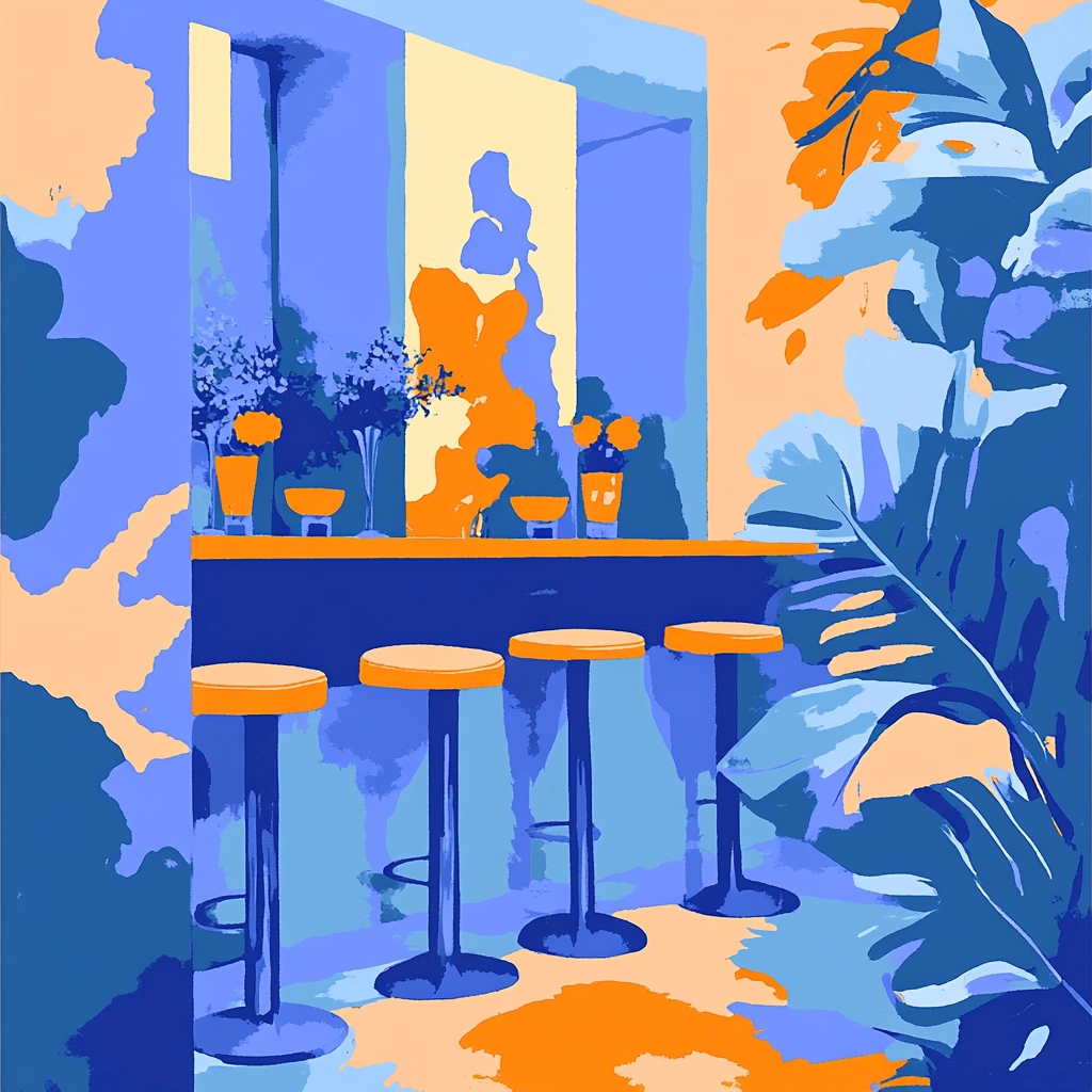 The use of bold lighting emphasizes a vibrant play between vivid blue and orange, establishing a distinct sense of space. Smooth surfaces and large flat areas define the textures, creating a bold visual rhythm through contrasting color blocks.