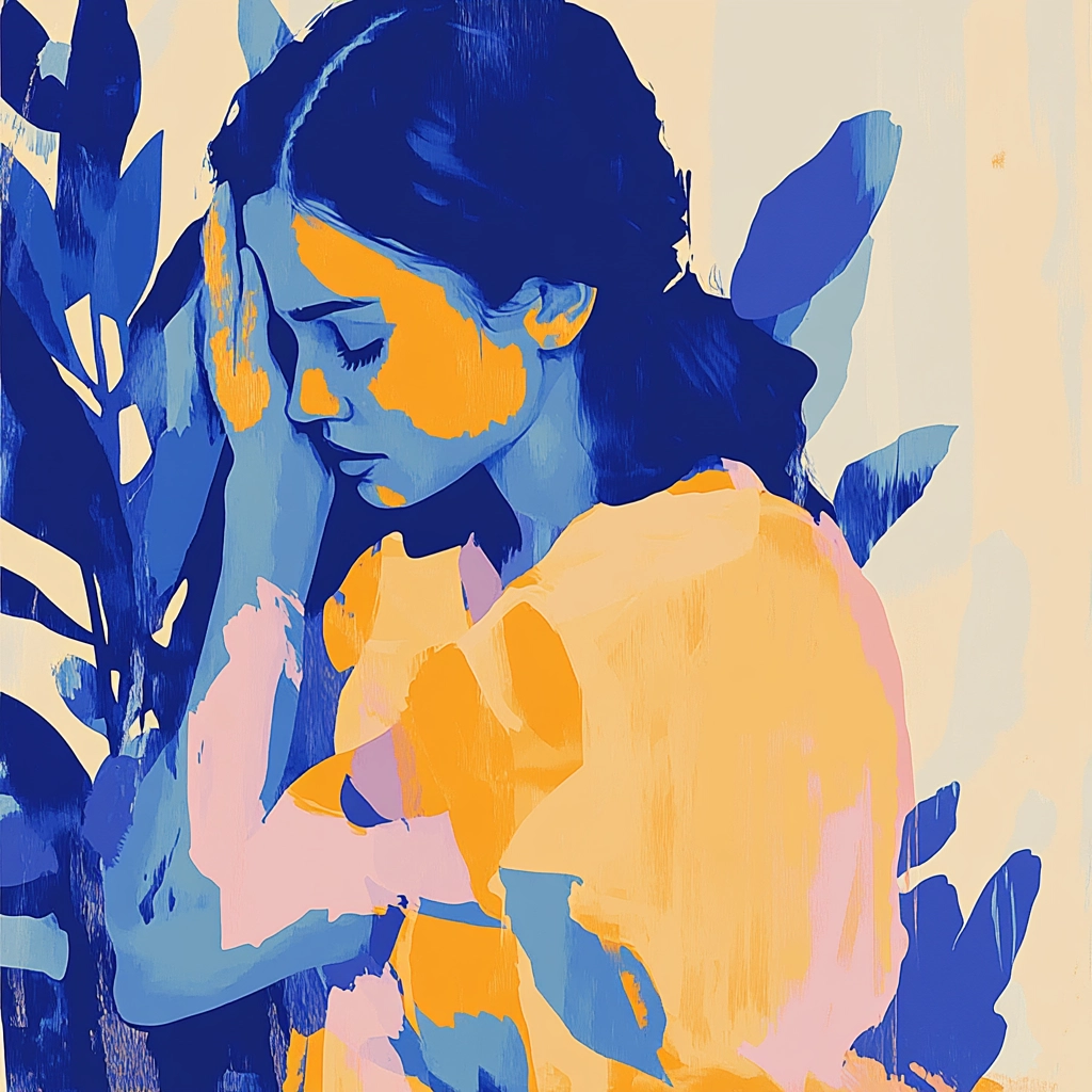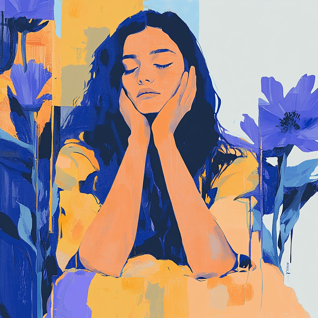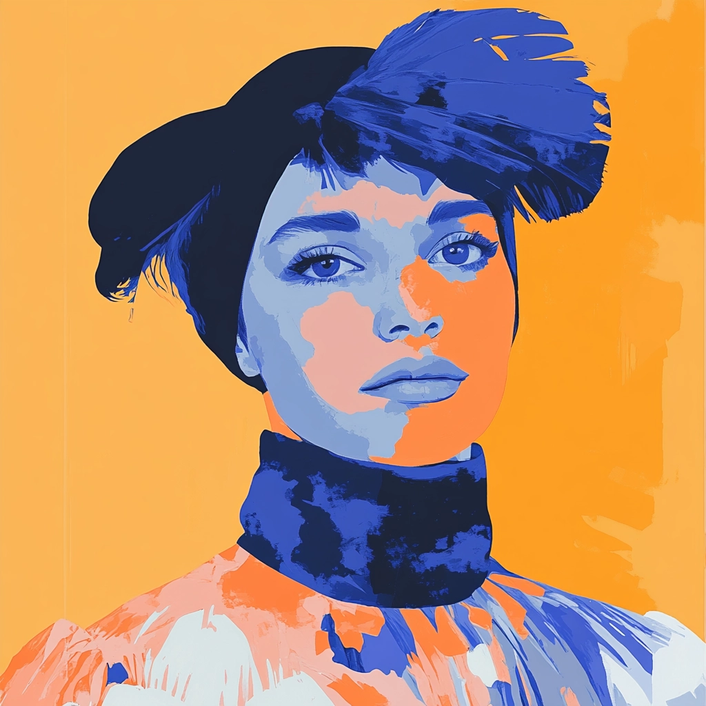 Vibrant blue and orange form dynamic compositions with a flat painting technique, building a lively contrast.