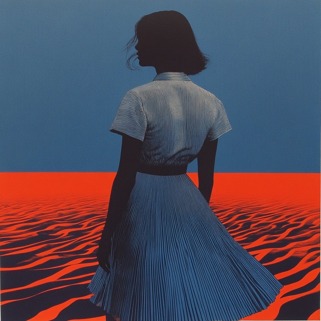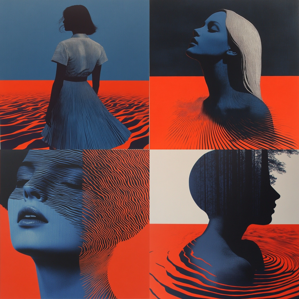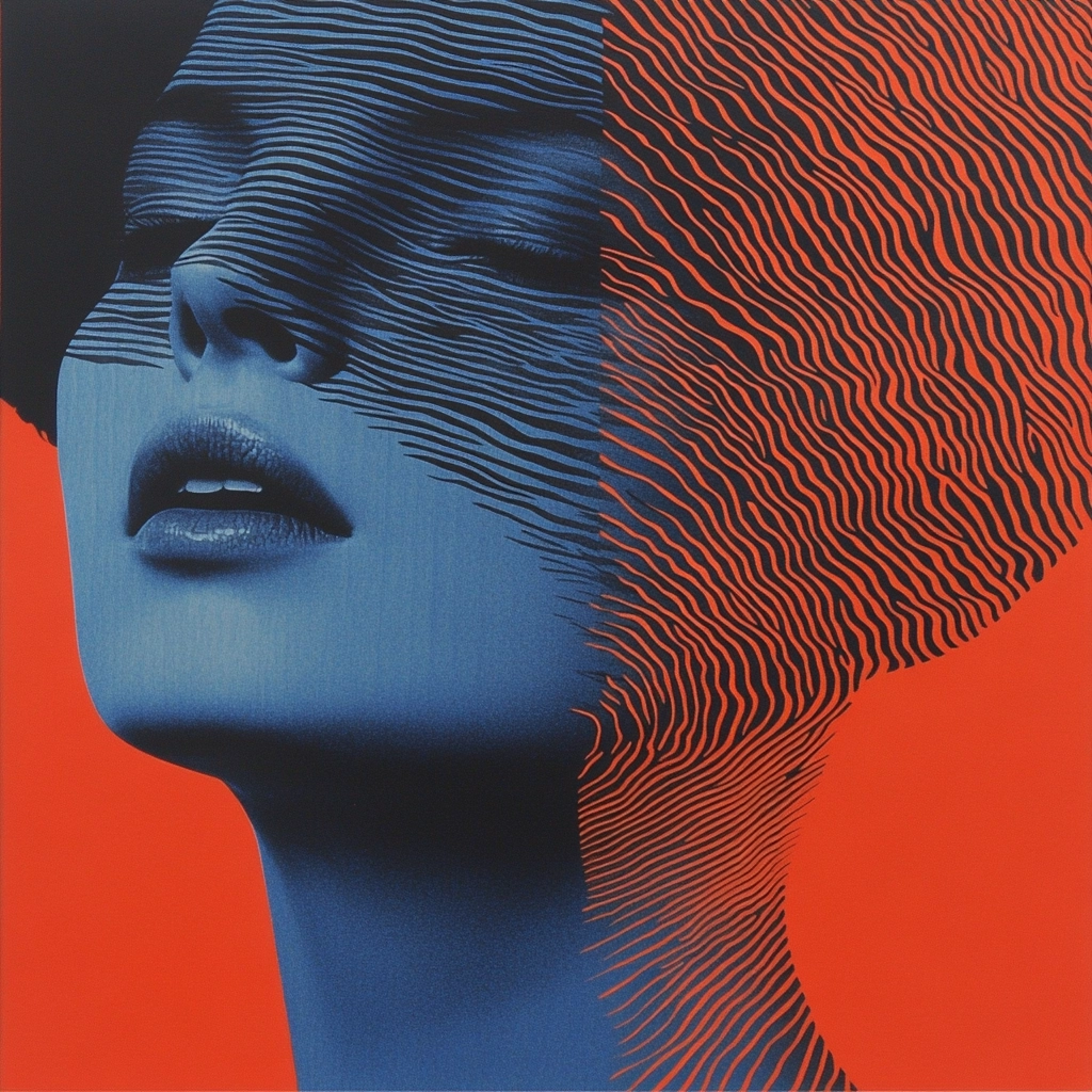 Lighting is subdued, emphasizing bold color blocks of blue and red with deep black shadows. The linear patterns create a sense of depth and movement across the surface. Smooth textures in the backgrounds contrast with rhythmic line motifs, enhancing spatial dynamism.