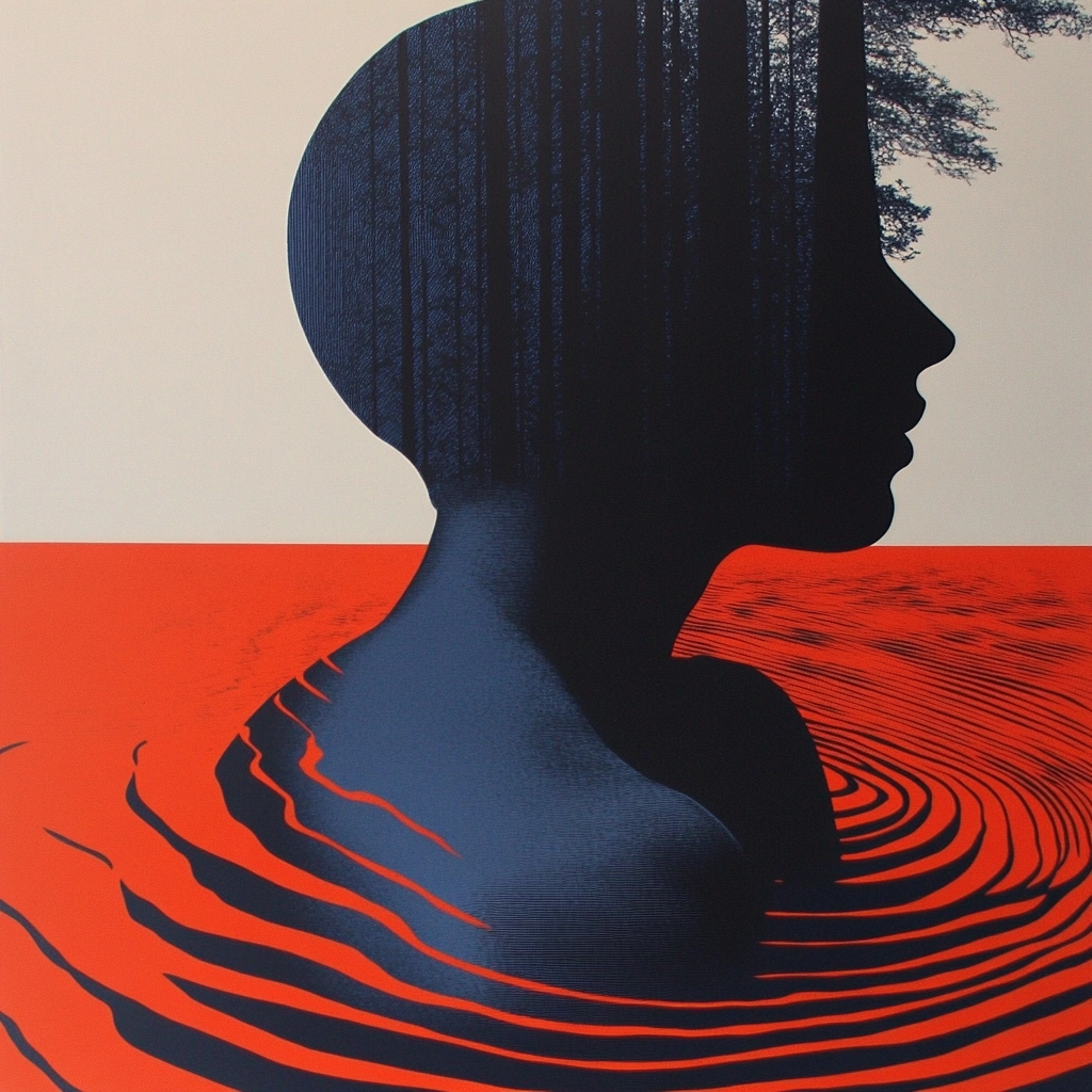 The composition employs stark color contrasts and linear patterns, creating a dynamic spatial interplay.