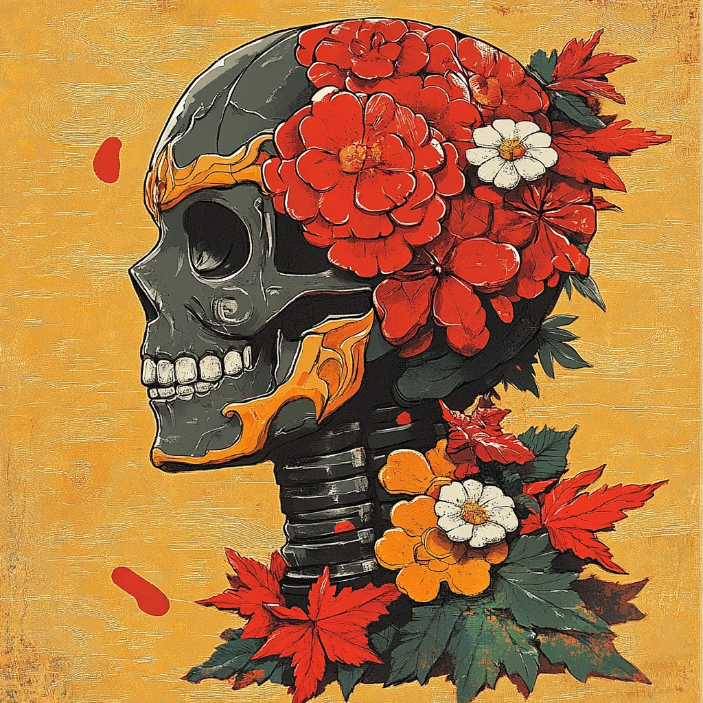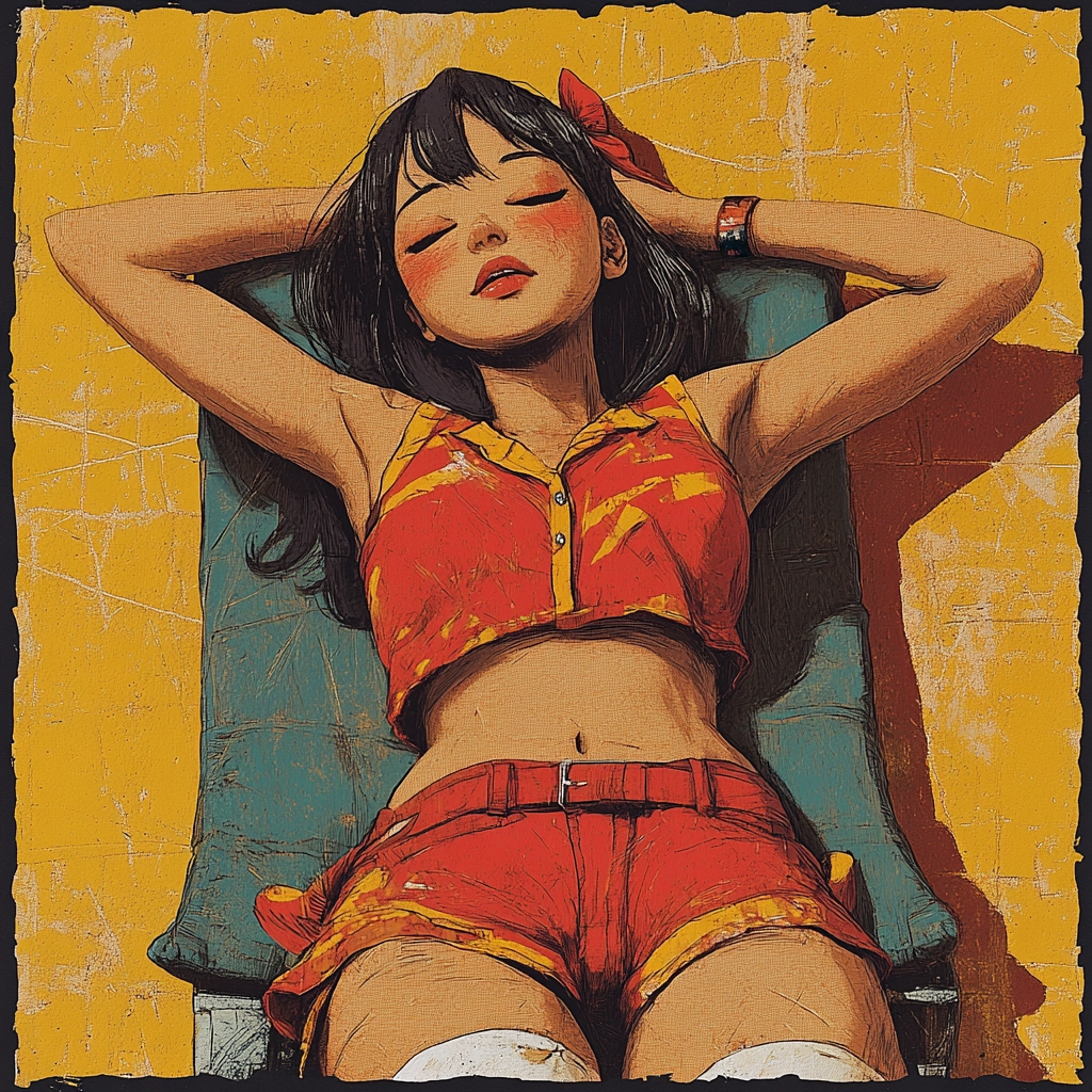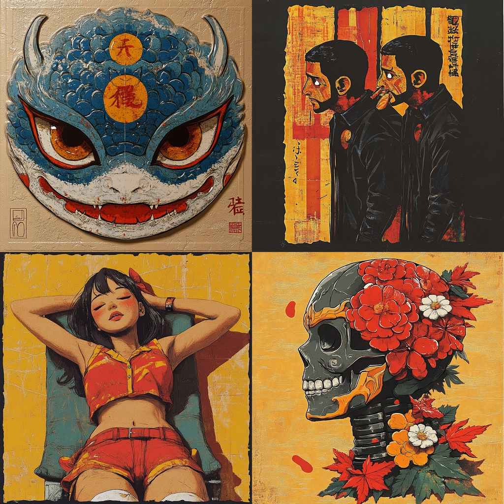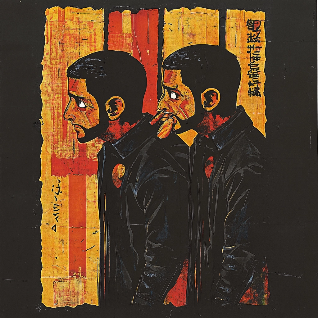 A dynamic composition featuring strong, contrasting colors and bold textual elements.