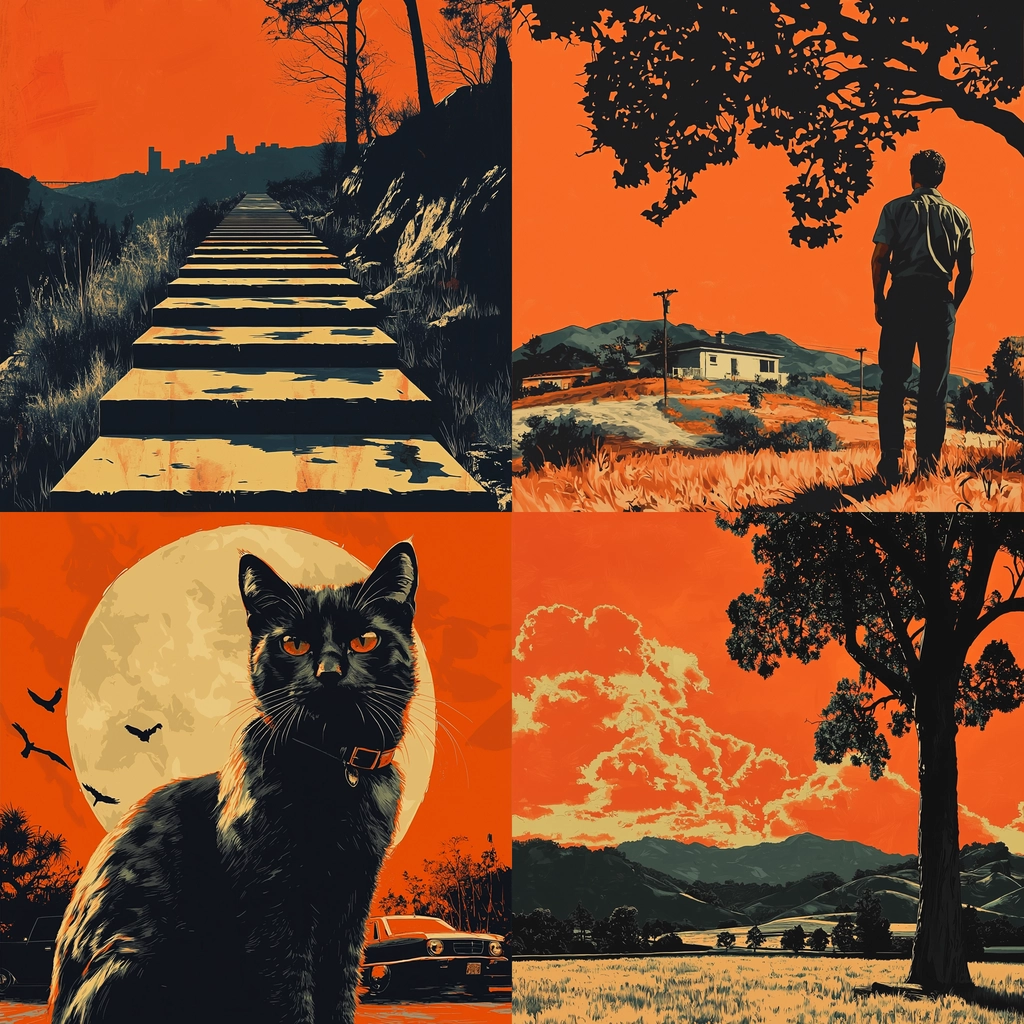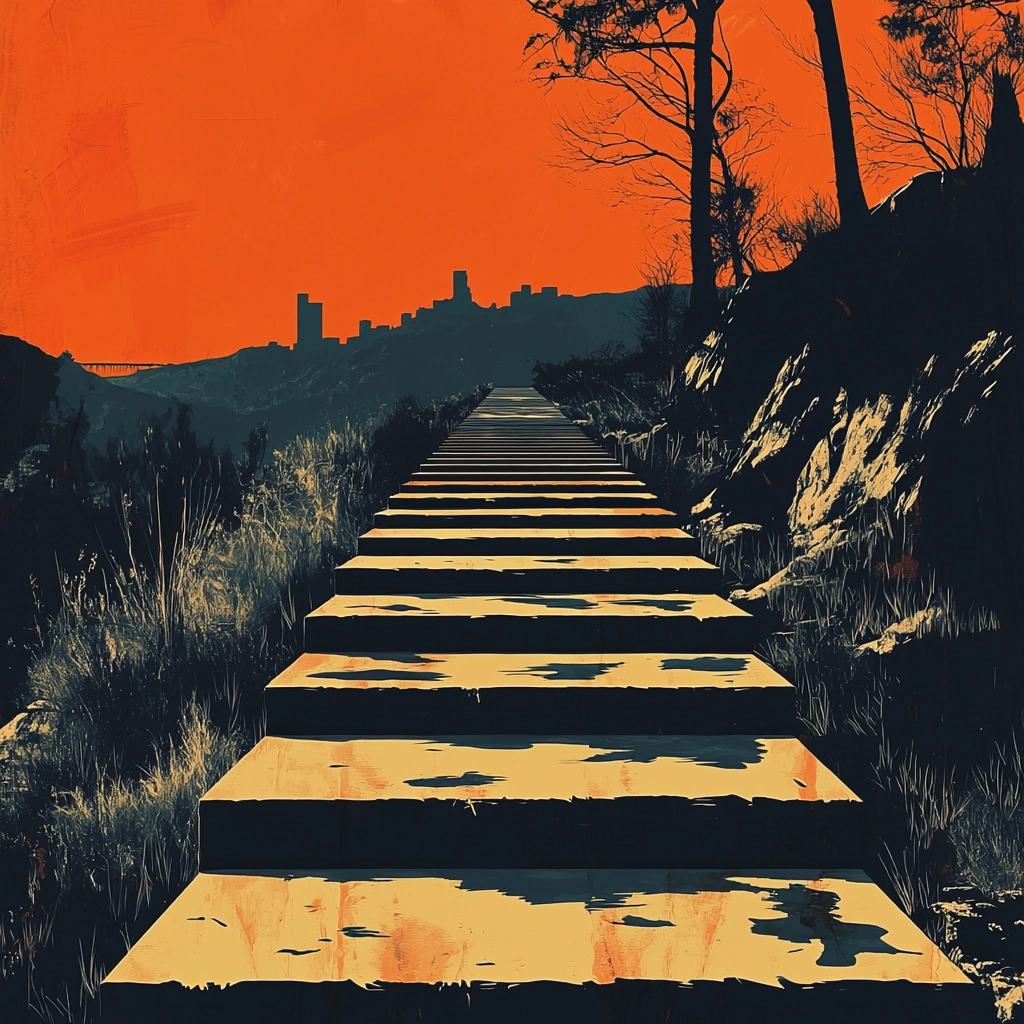 Employs bold lighting to accentuate dramatic contrasts between natural and man-made structures. Utilizes a dynamic spatial sense with exaggerated perspectives and deep shadows. Surfaces exhibit a tactile roughness, enhancing visual depth.