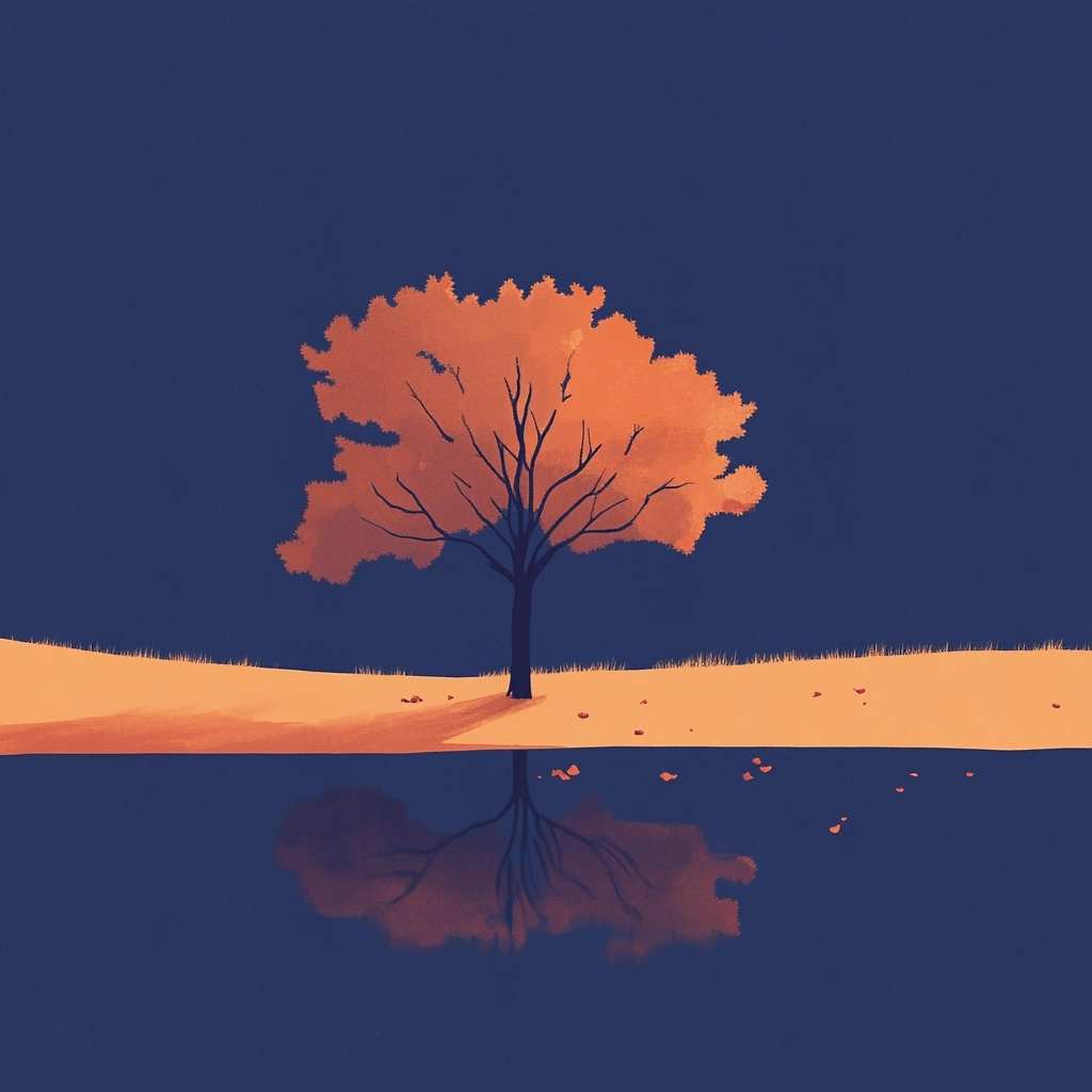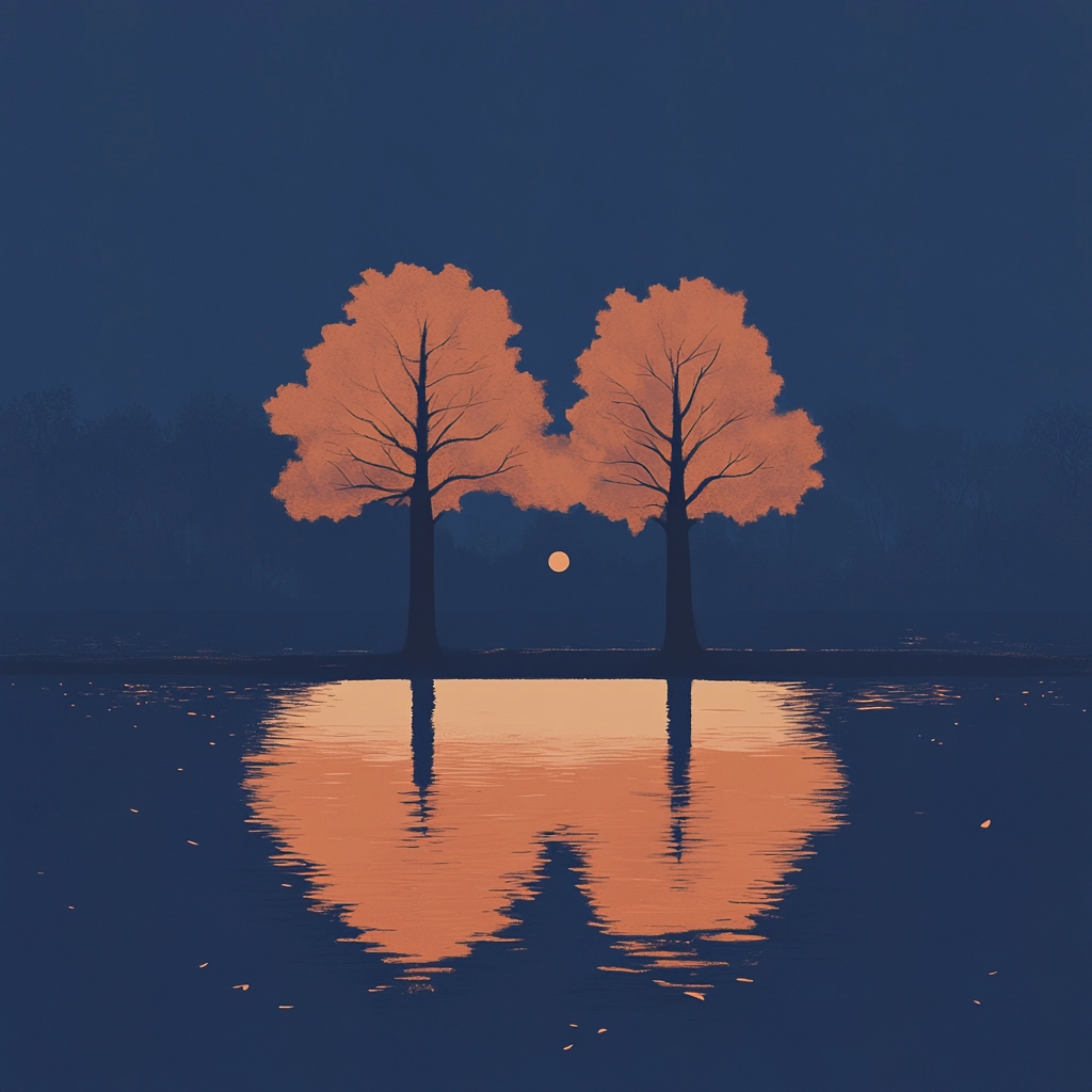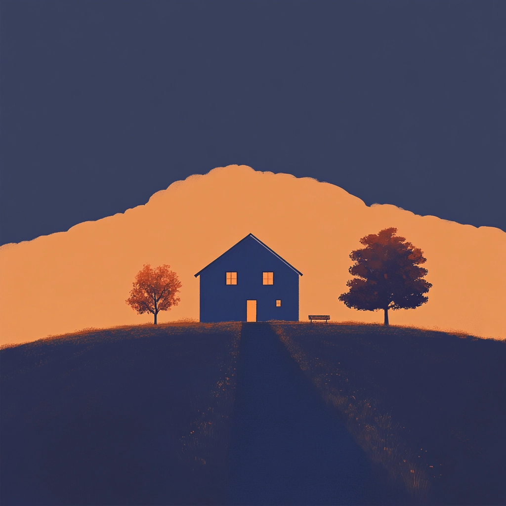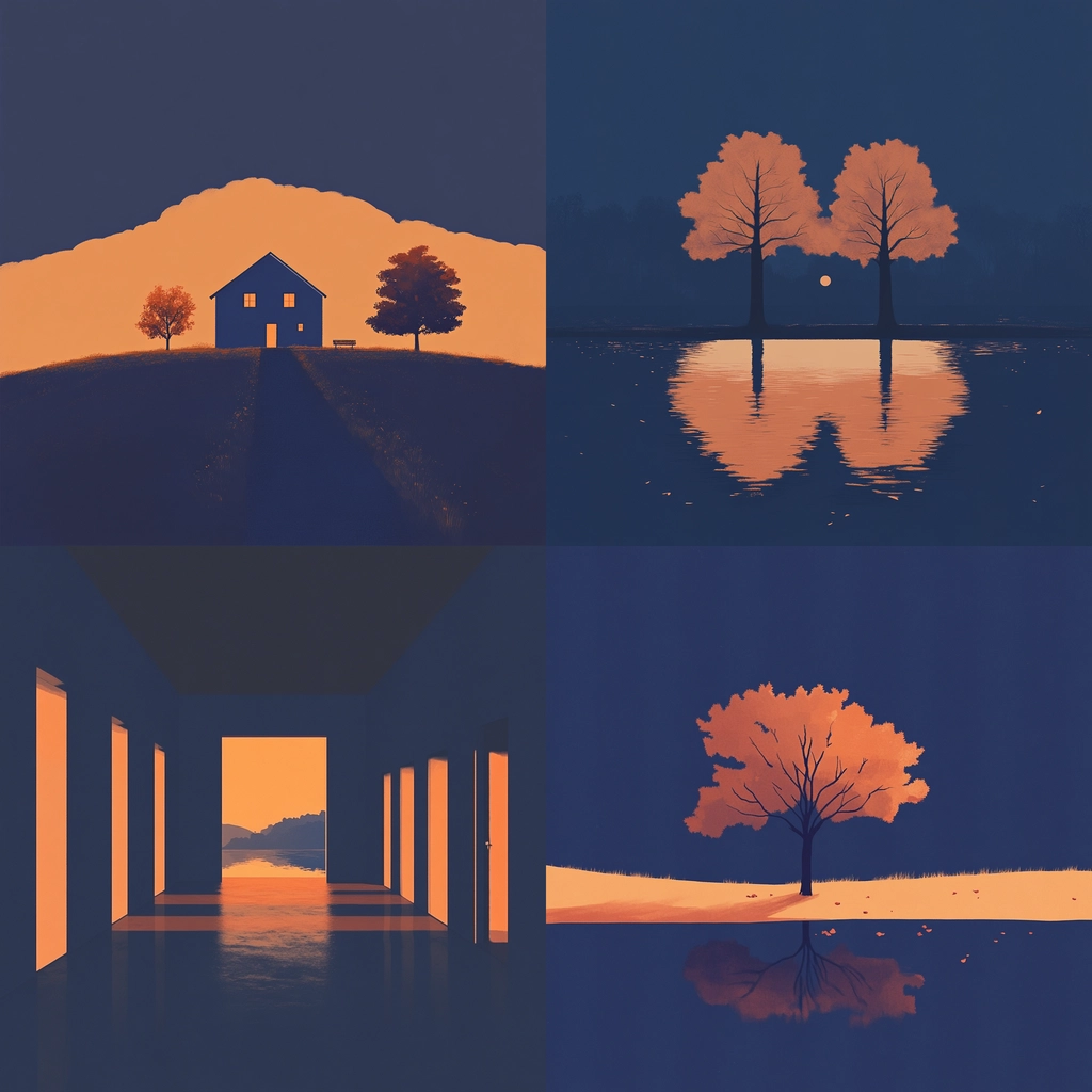 Lighting is used to create stark division between illuminated backgrounds and dark silhouettes, enhancing the depth. The colors evoke a sense of transition from day to night, while the texture is smooth and clean, emphasizing formality and clarity.